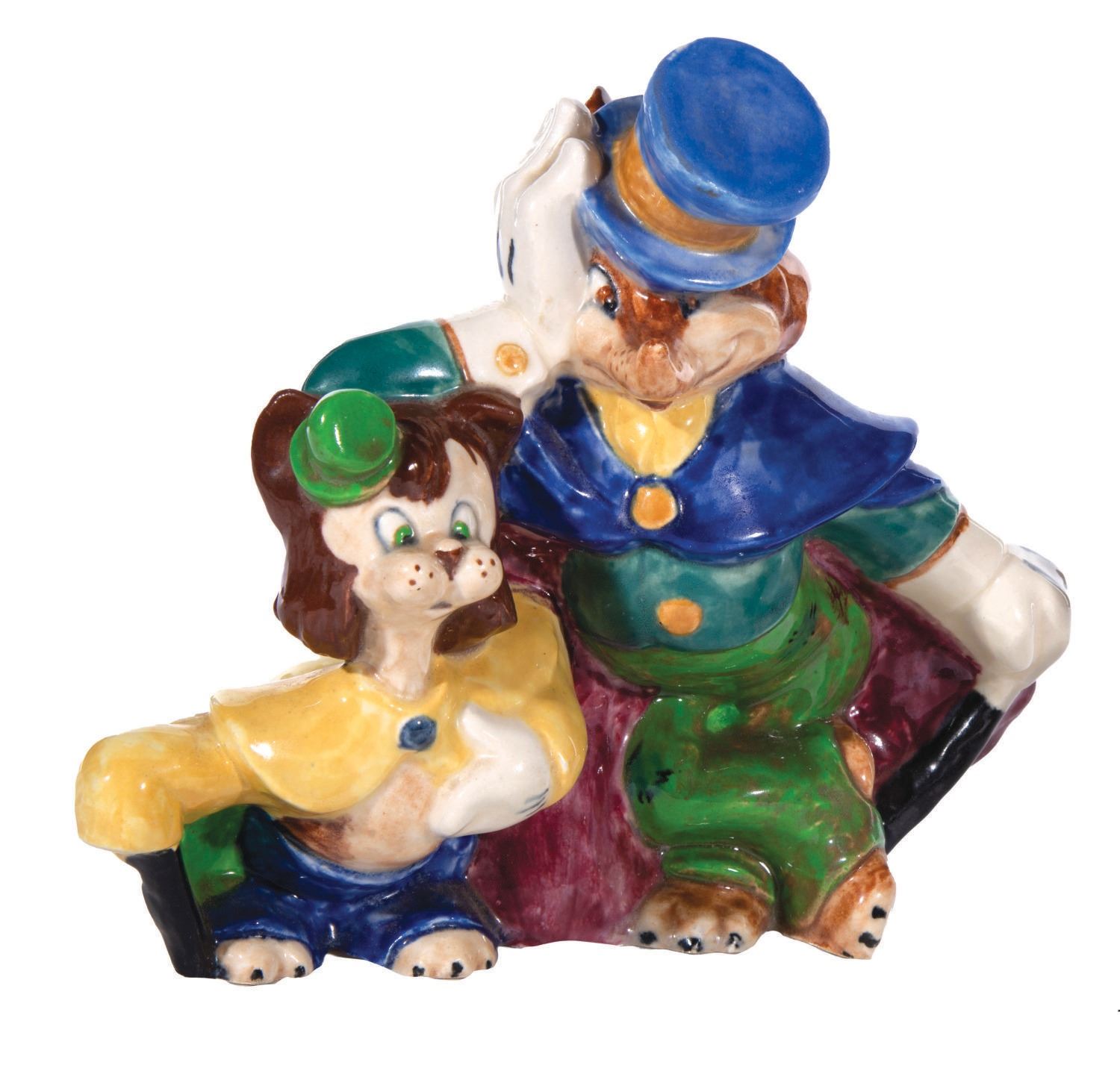 (Brayton Laguna, 1940) Among the rarest and most impressive of the Pinocchio Figurines by Brayton Laguna is this 8.25"x7.25" tall beautifully painted and glazed Foulfellow and Gideon. Brayton produced individual figurines of both characters but this large one of them together rarely shows up for sale. The figurine is in fine condition with good gloss and no flaws. It is the best example of this piece that we have seen.