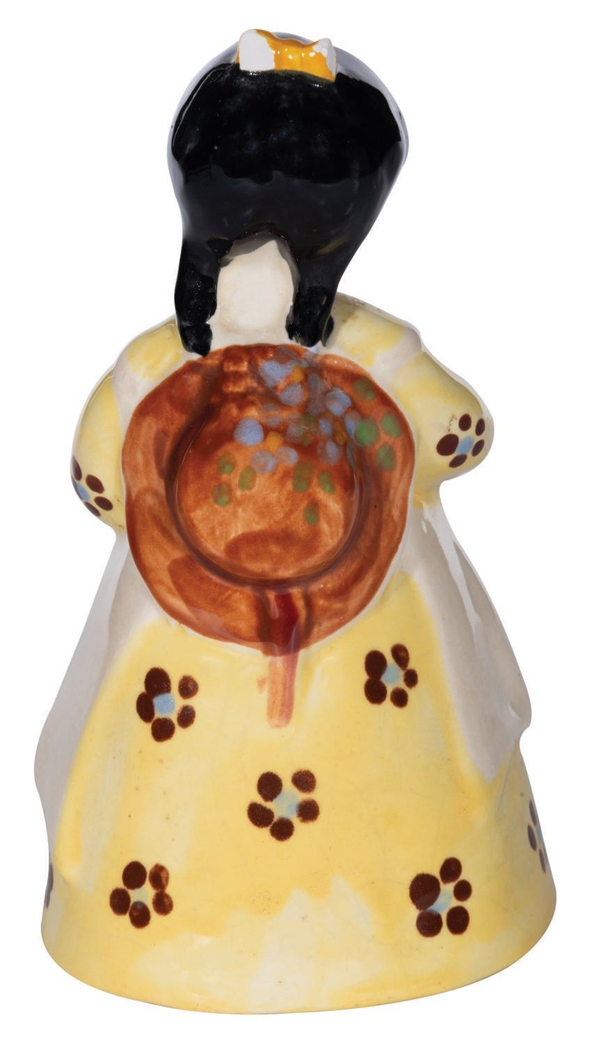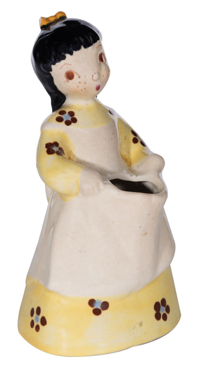 (Brayton Laguna, 1940's) A Sally girl planter by Brayton Laguna Pottery of California. The "Sally Girl" was released in many different styles through Brayton Laguna's history, with this yellow floral dress version attributed to the 1940's. Measuring 6.75" high, the ceramic planter is in very good condition, with very light crazing and light wear from display.