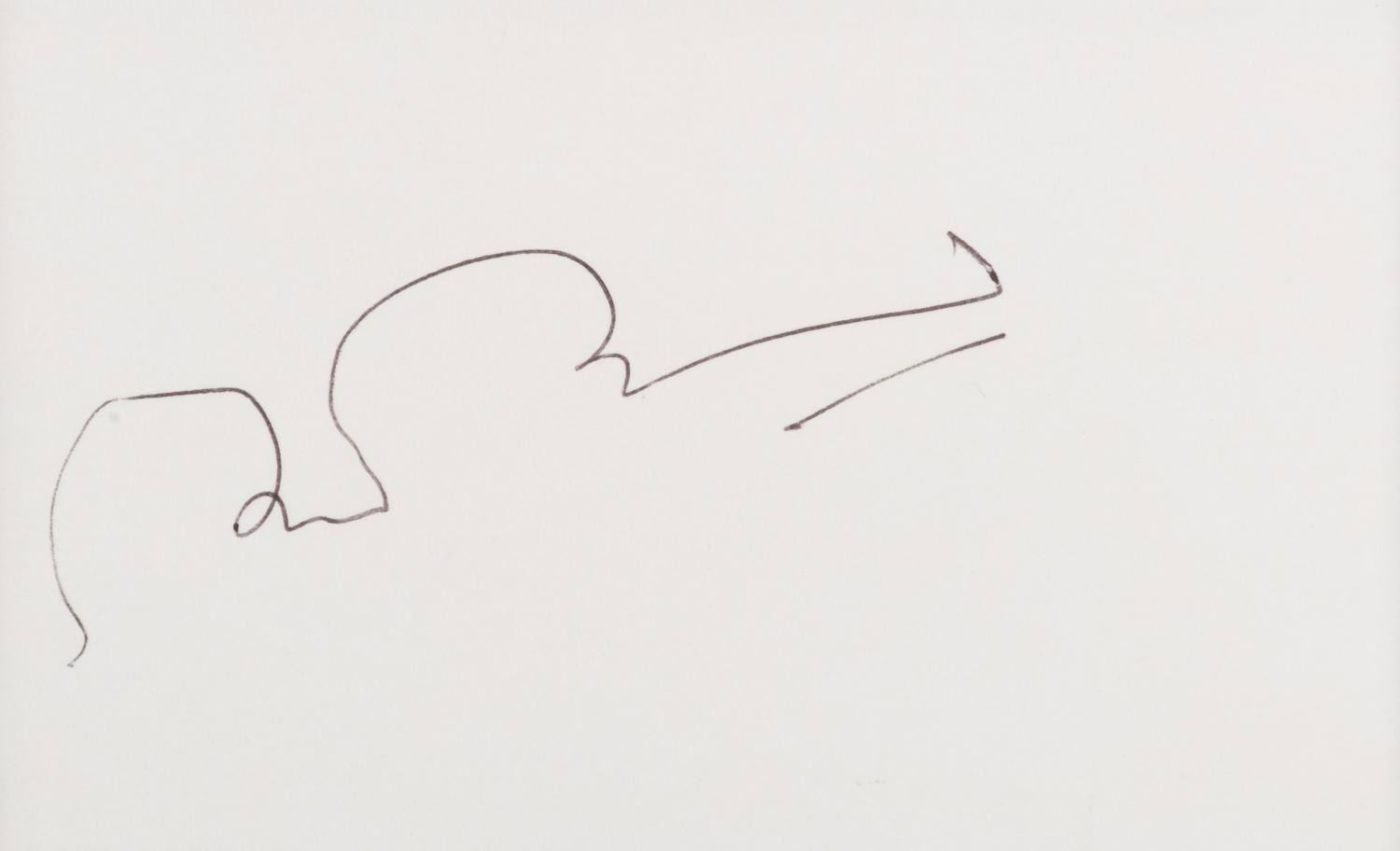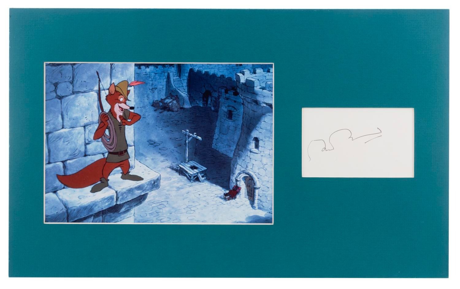 (Disney, 1973) A mounted signature of legendary English actor Brian Bedford, voice of Robin Hood in Disney’s 1973 classic, displayed with a print of the character. Measuring 11” x 18” overall, the matted signature and image are in fine condition.