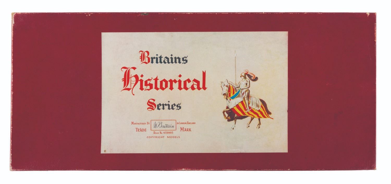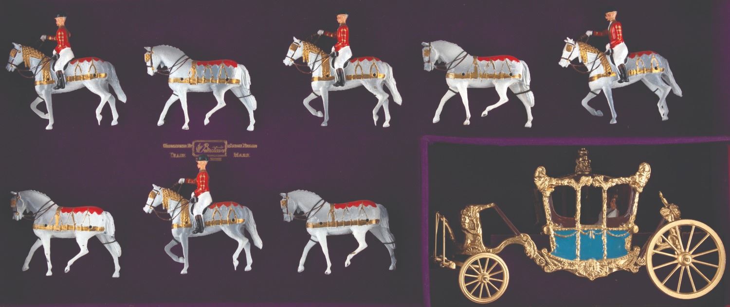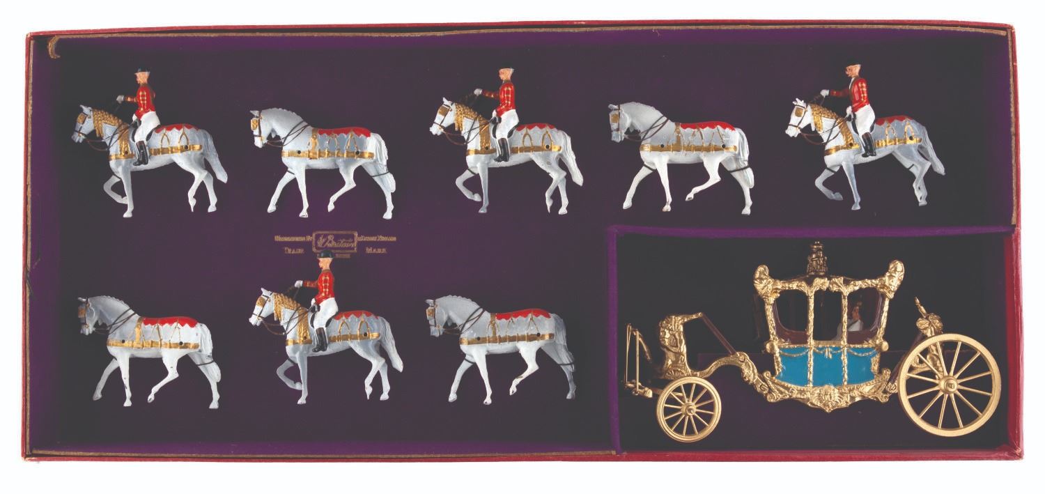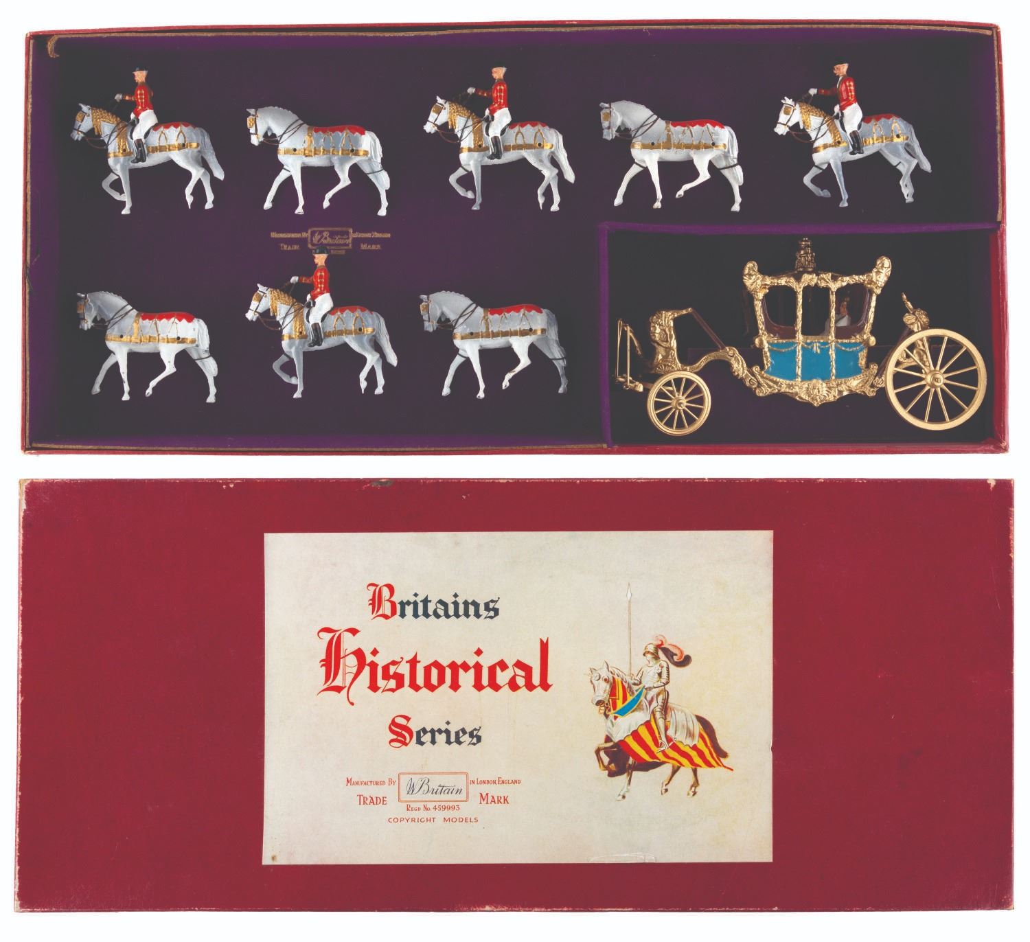 (Britains Ltd., 1960s) A Britains Historical Series set 9401 Her Majesty's State Coach, in the original box. The set includes eight horses with four riders, and the golden royal coach with Queen and consort figures. The set comes with the original box including inserts, instructions, and inspector's slip. With the horses standing 2.25" tall and 3" tall with the rider, and the coach measuring 7" x 2.5" x 3.75" tall, the set of metal figures is in very good condition with graying to the white horses from age, and the "loose traces" that connect the horses together missing. The 8.25" x 18.75" x 3" box is in very good condition with light edge wear mainly to the lid, and typical light wear from aging.