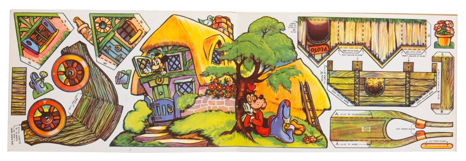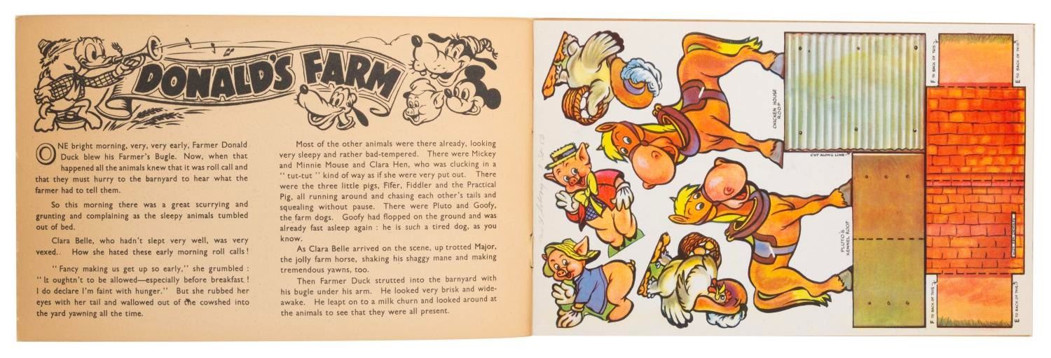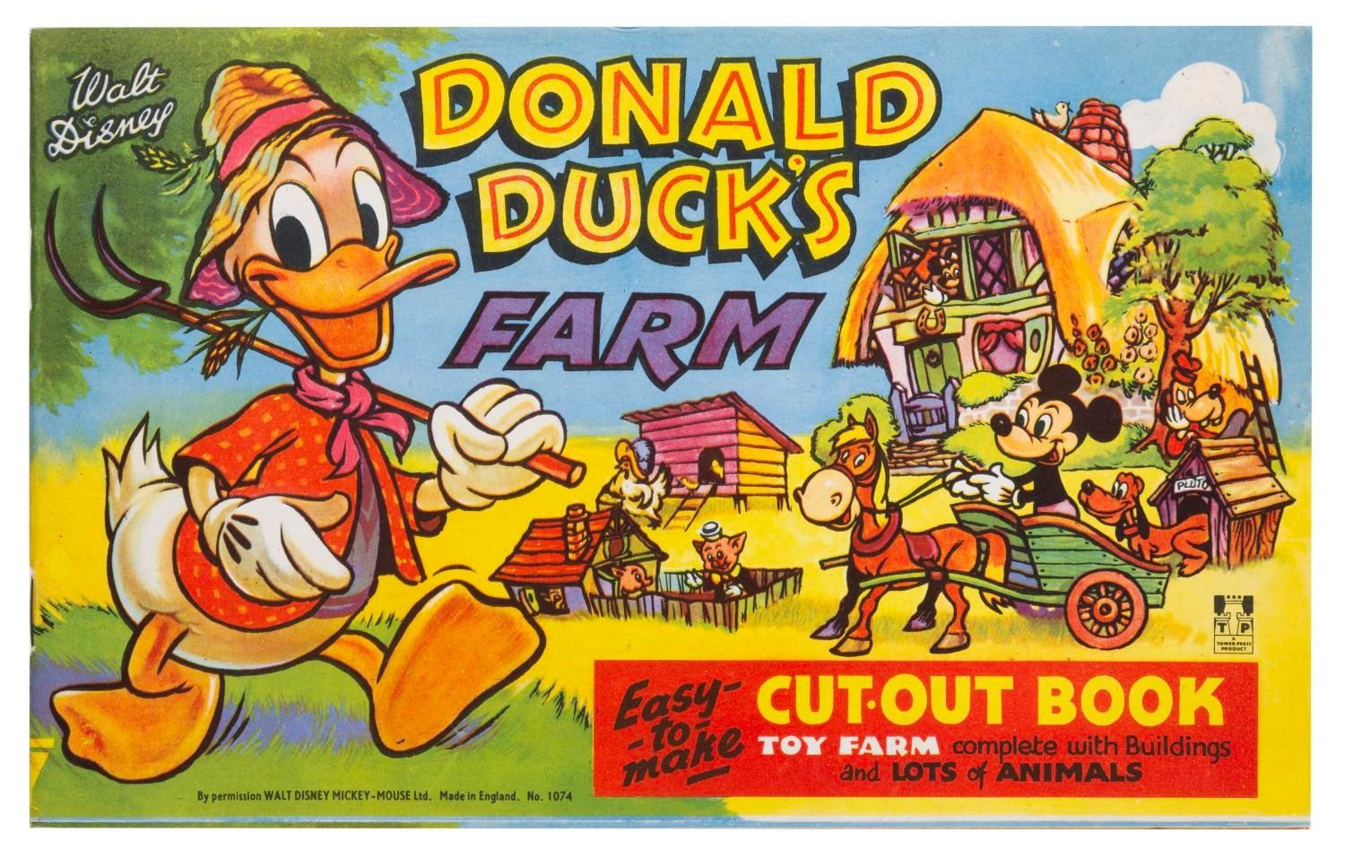 (Tower Press, 1950s) Donald Duck's Farm Cut-out book, No 1070, published by Tower Press. Storybook pages are intermixed with pages of cut-out characters, buildings, and carts. Measuring 7" x 11", the book is in fine condition with a small pencil notation inside, and typical browning of newsprint story pages from age.