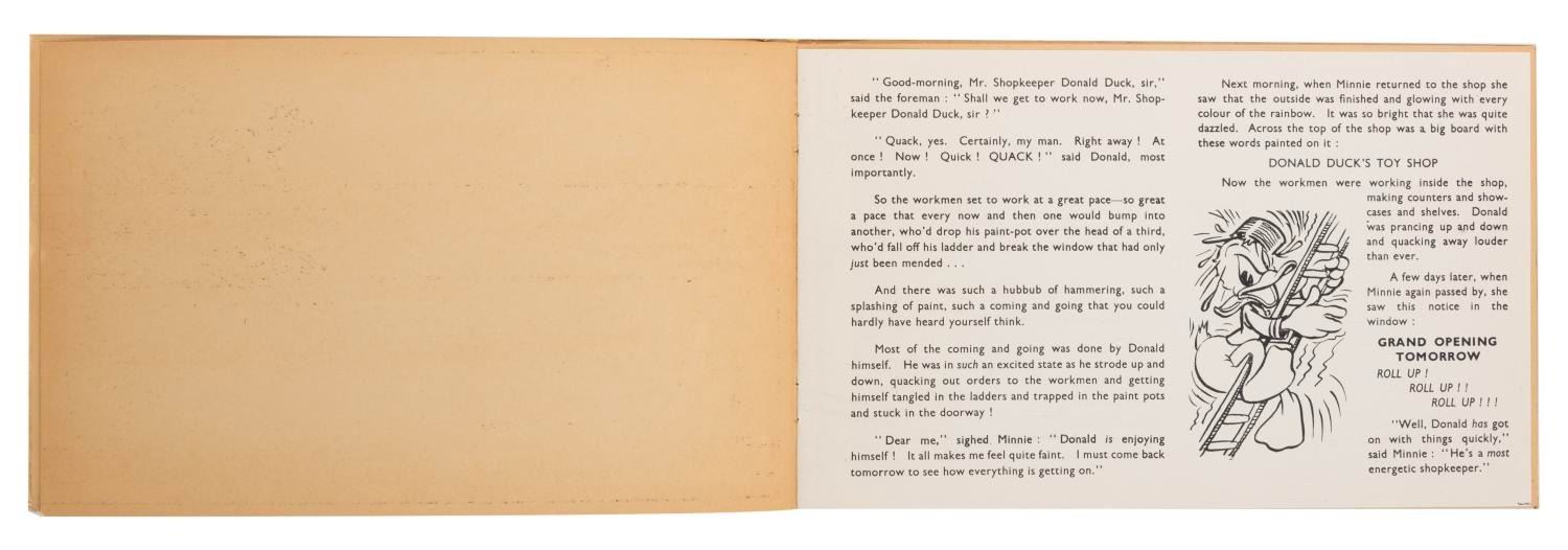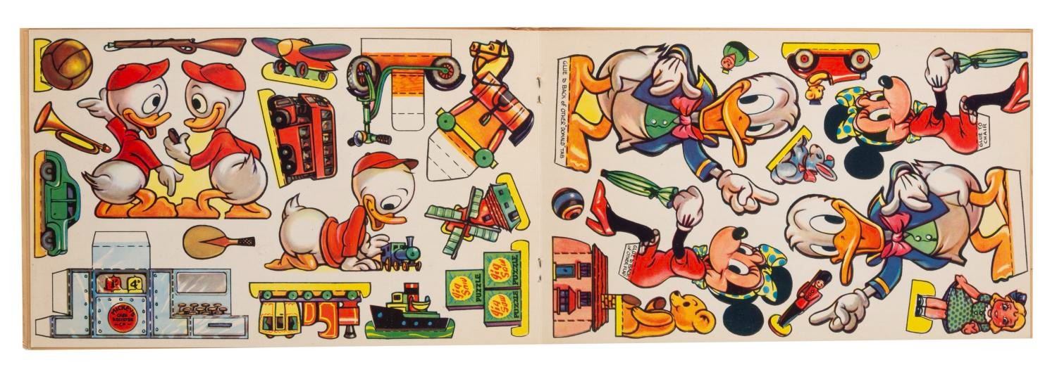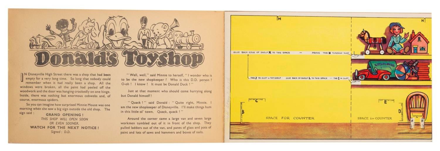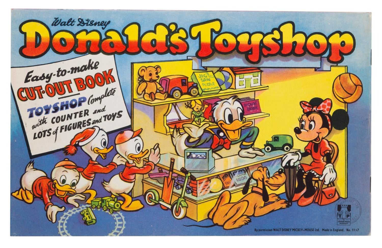 (Tower Press, 1950s) A Donald's Toyshop Cut-out book, No 1157, published by Tower Press. Storybook pages are intermixed with pages of cut-out characters, toys, and shelves. Measuring 7" x 11", the book is in very good condition with scuffs and scratches along the spine, a small pencil notation inside, and typical browning of newsprint story pages from age.