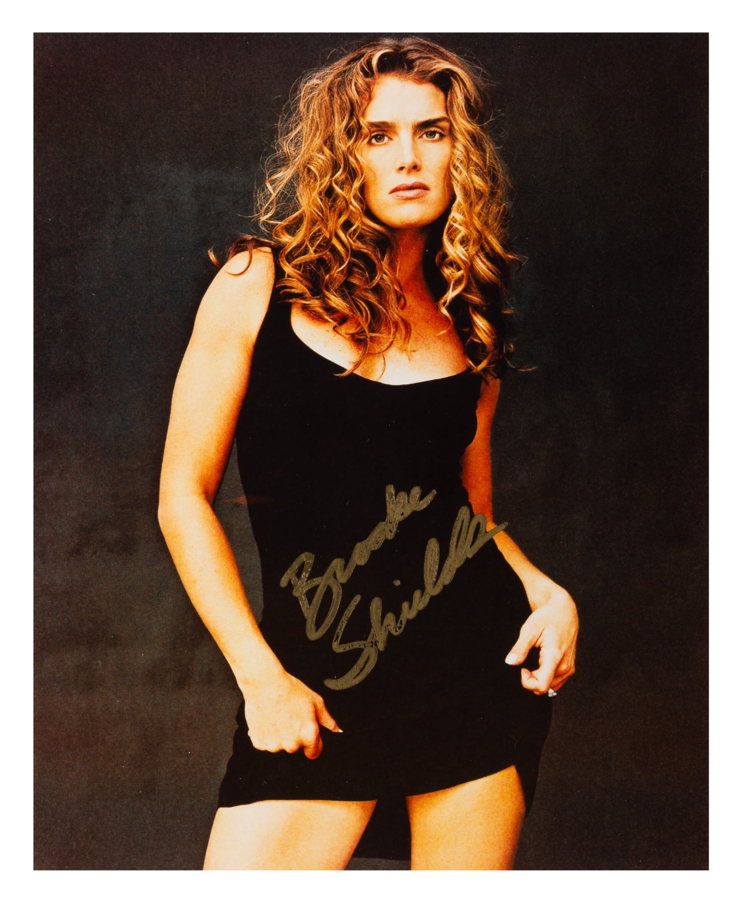(Shields, 1990s) A publicity photo signed by actress Brooke Shields. Measuring 8" x 10", the autographed photo is in good condition with slight color loss to the signature.