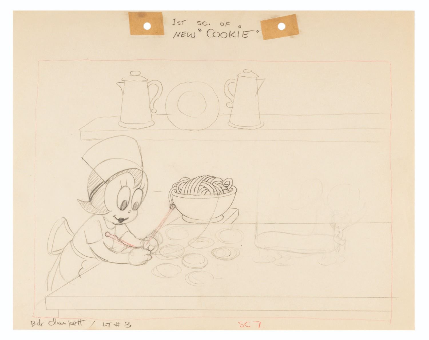 (Schlesinger, 1933) An original layout drawing featuring Cookie’s “new look” from the Looney Tunes short “Buddy’s Beer Garden.” Accomplished in graphite and colored pencil, with an image size of 7.5” x 10.5” on 9.5” x 12” animation paper, the drawing is in very good condition with light wear.