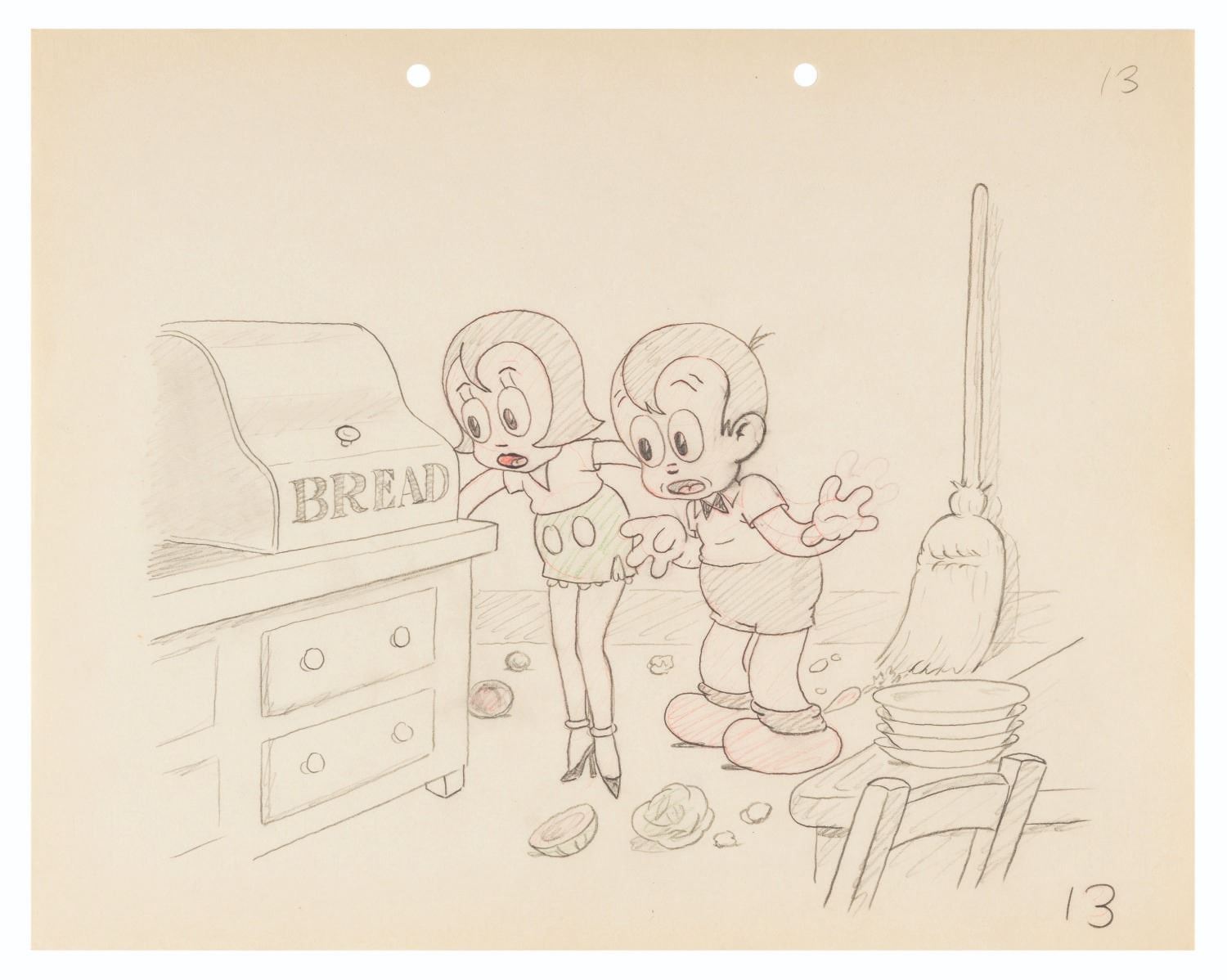 (Schlesinger, 1933) A “Buddy’s Day Out” storyboard drawing of Buddy and Cookie in a kitchen. This is likely from a deleted scene from the short, whose original director Tom Palmer was fired and replaced by Friz Freleng. With an image size of 7.5” x 10” on 9.5” x 12” animation paper, the graphite and colored pencil drawing is in fine condition with light discoloration from age.