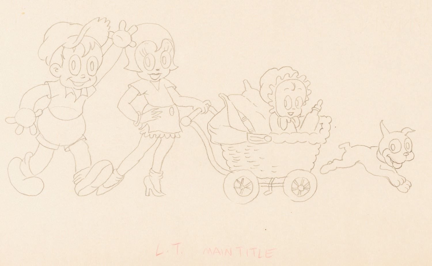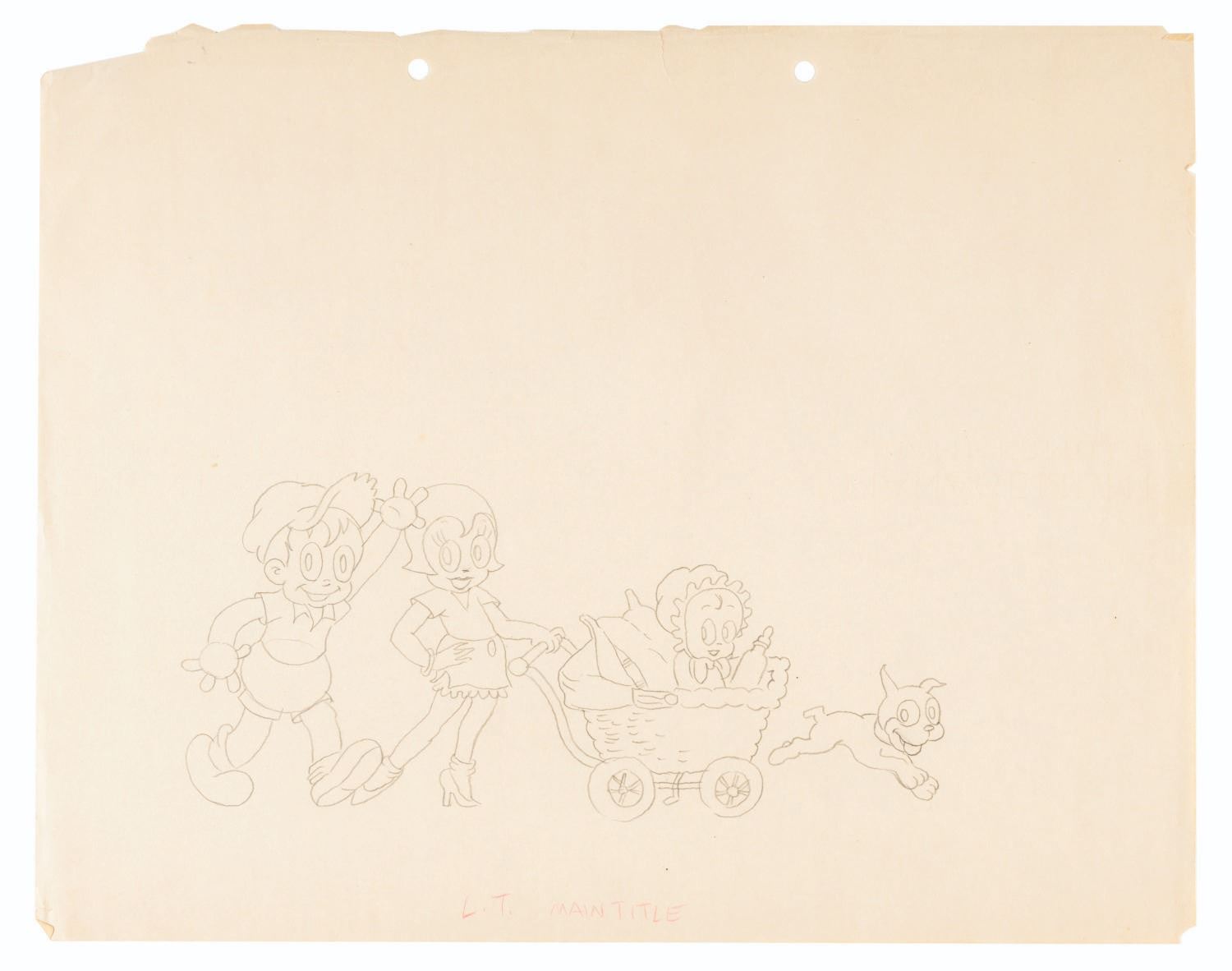 (Schlesinger, 1933) An original concept drawing of Buddy, Cookie, and Elmer for the title card to “Buddy’s Day Out.” This concept differs slightly from the final painted and screen-used title card. Measuring 9.5” x 12” overall, with a character image size of 3.5” x 8”, the graphite drawing displays in good condition with edge wear and tear, light creasing, a 0.5” x 2” area of paper loss at the top left corner, and light discoloration from age.