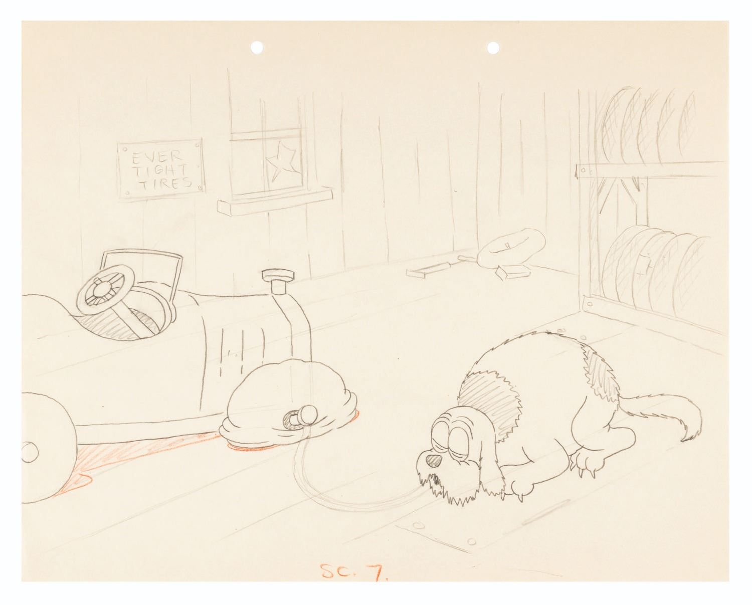 (Schlesinger, 1934) An original layout drawing from the Looney Tunes short “Buddy’s Garage.” Measuring 9.5” x 12”, the graphite and colored pencil drawing is in very good condition with light edge wear.