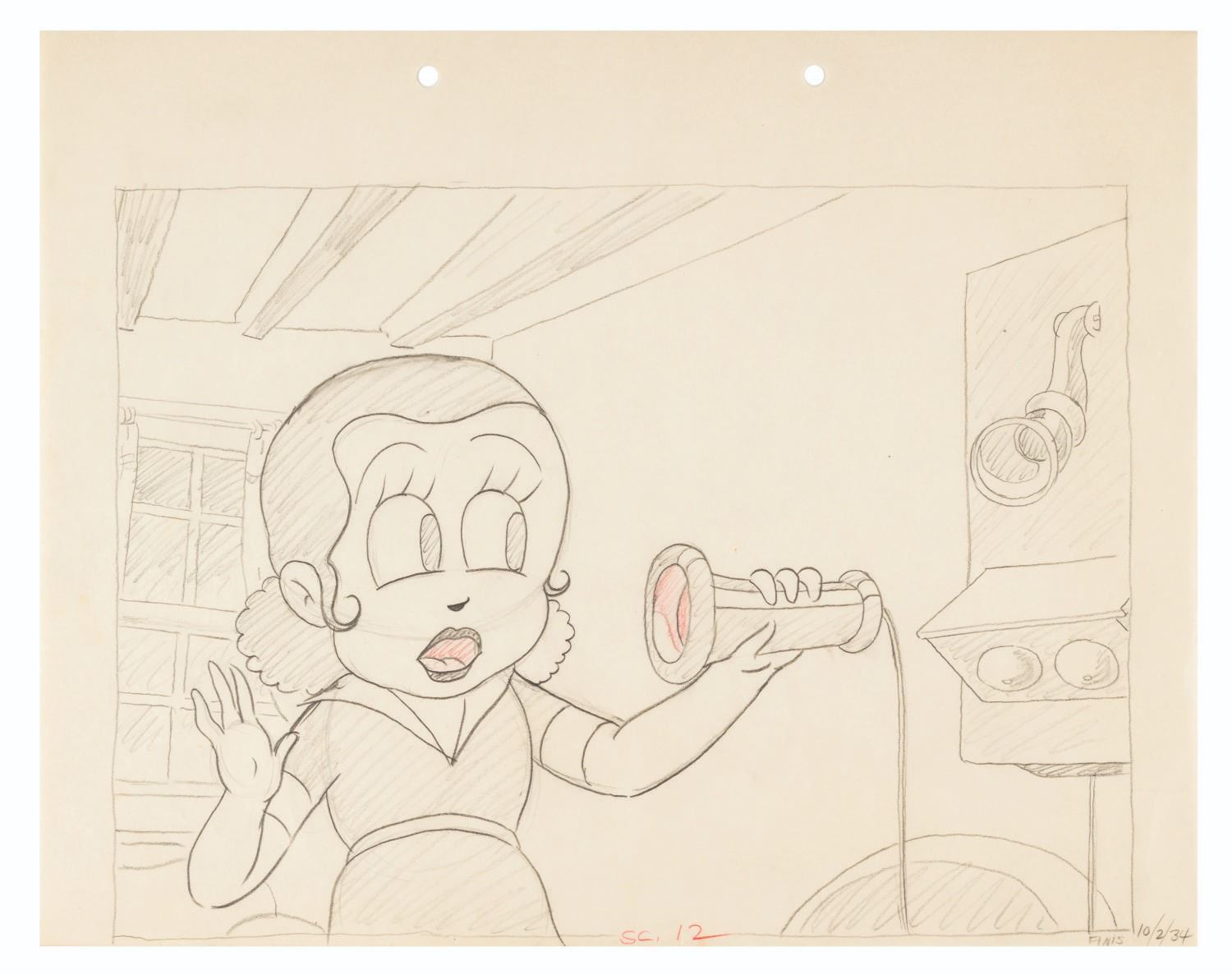 (Schlesinger, 1934) A layout drawing of Cookie on the telephone from “Buddy the Dentist.” With an image size of 7.75” x 10.5” on 9.5” x 12” animation paper, the drawing accomplished in graphite and red pencil is in very good condition with light wear from production use, and slight discoloration from age.
