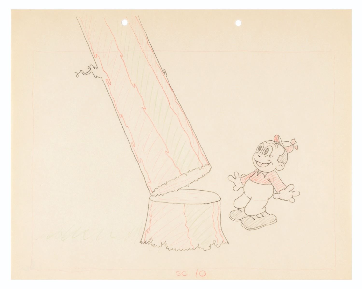 (Schlesinger, 1934) An original production layout drawing from “Buddy the Woodsman.” Accomplished in graphite and colored pencils, the drawing has an image size of 10.5” x 9.25” on 9.5” x 12” animation paper and is in fine condition with expected slight color shift to the paper from age.