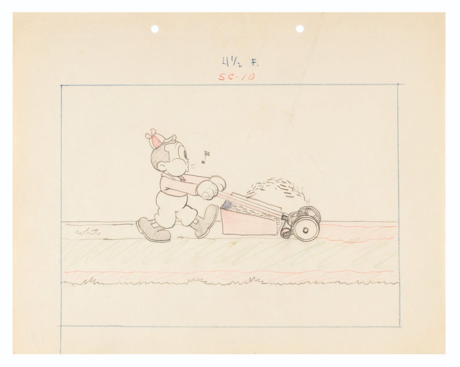 (Schlesinger, 1934) An original story drawing from “Buddy the Woodsman.” Buddy became Looney Tunes’ second star after Harman & Ising took Bosko with them when they left the Studio. With an image size of 6.75” x 9.25” on a 9.5” x 12” piece of animation paper, the graphite and colored pencil drawing is in good condition with wear from production use including stains, creases, and a full horizontal fold at the top.