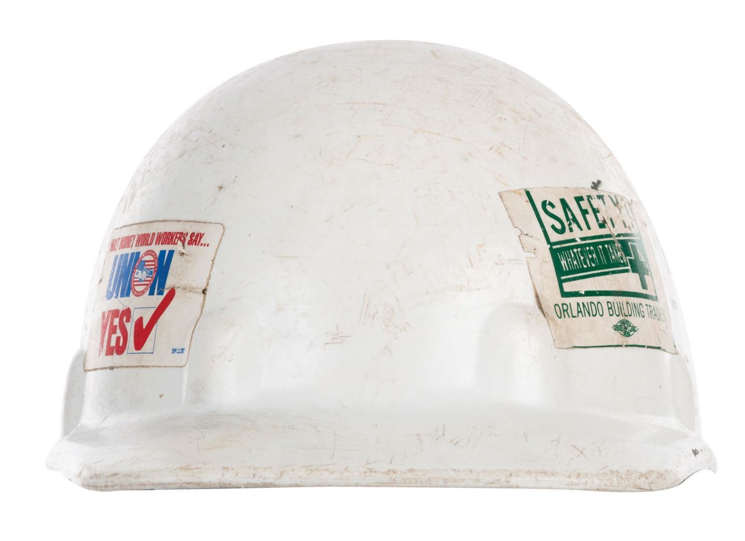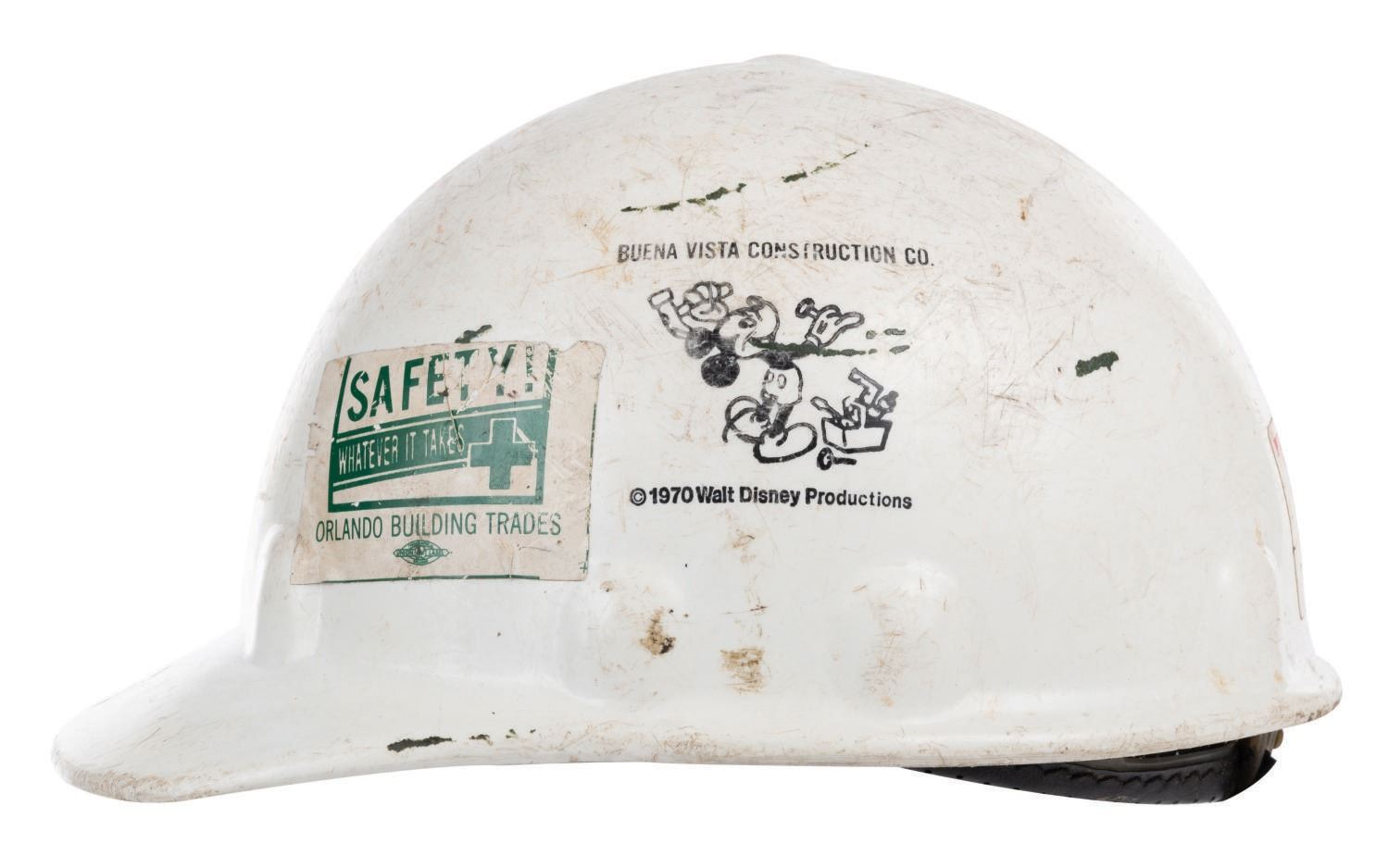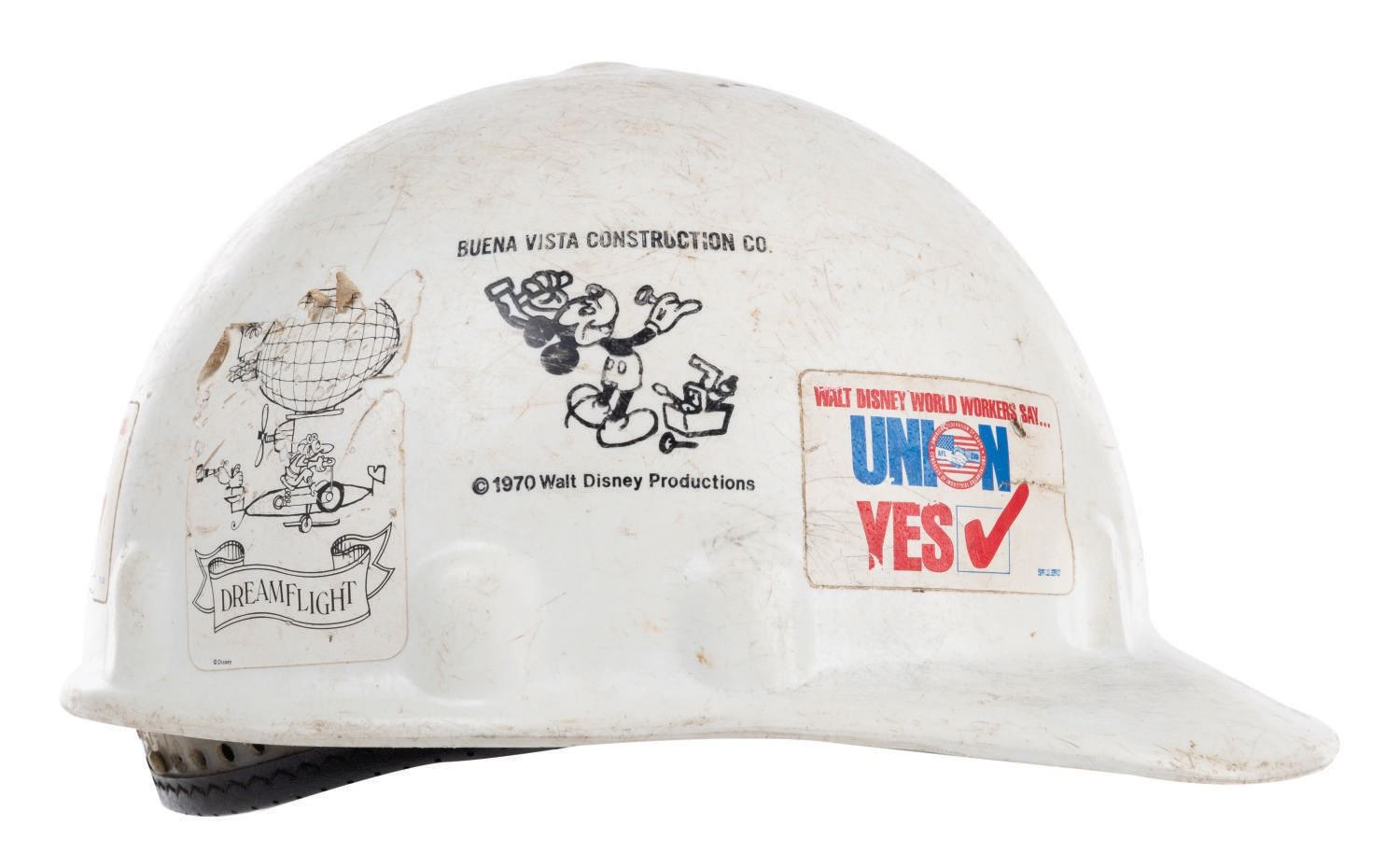 (Walt Disney World, 1970s) A 1970s hard hat utilized by Buena Vista Construction Co. staff. The hat twice features the BVCC Mickey Mouse logo and retains stickers for both local unions and the Dreamflight OmniMover adventure (the soon-to-be Delta-sponsored successor to If You Could Fly). Measuring approximately 6" tall and 11"x8", the adjustable hat is in good overall condition, exhibiting slight wear and scuffs from use.