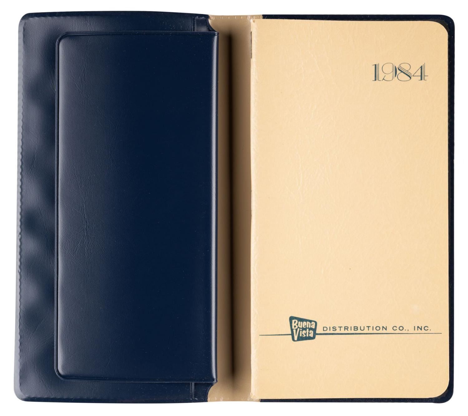 (Disney 1984) An almanac with vinyl cover, by Buena Vista Distribution. The calendar includes important Disney dates, and the address book includes Disney locations and phone numbers. Measuring 7.25” x 3.75”, the almanac is in fine condition.
