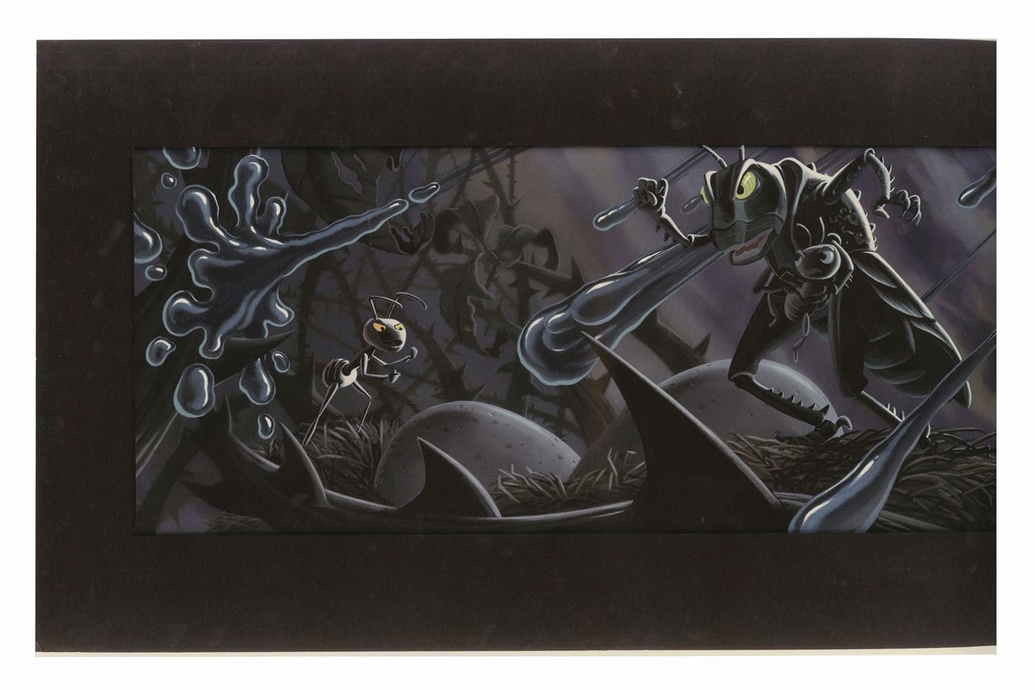 (Pixar, 1998) A digital concept art print created by Pixar during production of A Bug's Life. This piece features Flik clashing with the villainous grasshopper Hopper. It was printed in a limited quantity to be used during the development of the film and in pitch meetings. Pixar is known for creating extensive amounts of concept art before finalizing the design of the film, and this piece would have been from the crop of final concept art presented before moving forward with production. Measuring 11"x17", the piece is in very fine condition with minor surface wear.