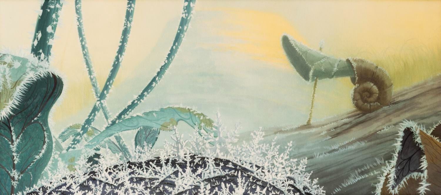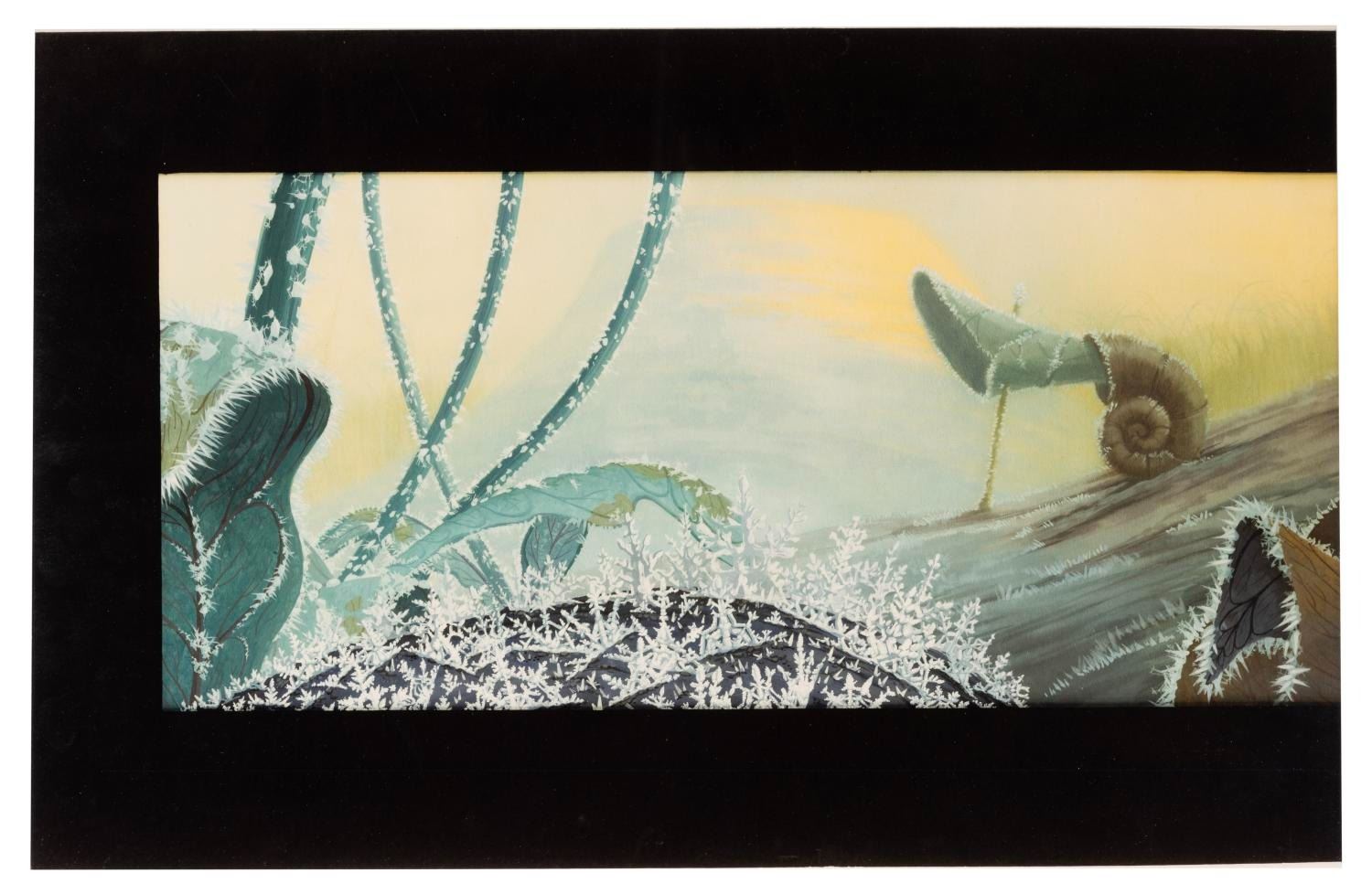 (Disney, 1990s) An original print of digital concept art from Pixar’s “A Bug's Life.” Featuring a frost-covered landscape, the concept artwork was created at the studio and printed in a limited quantity to be used during the development of the film and in pitch meetings. Measuring 11" x 17", the print displays in very good condition with light scratches and wear from production use.