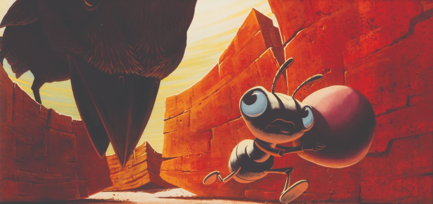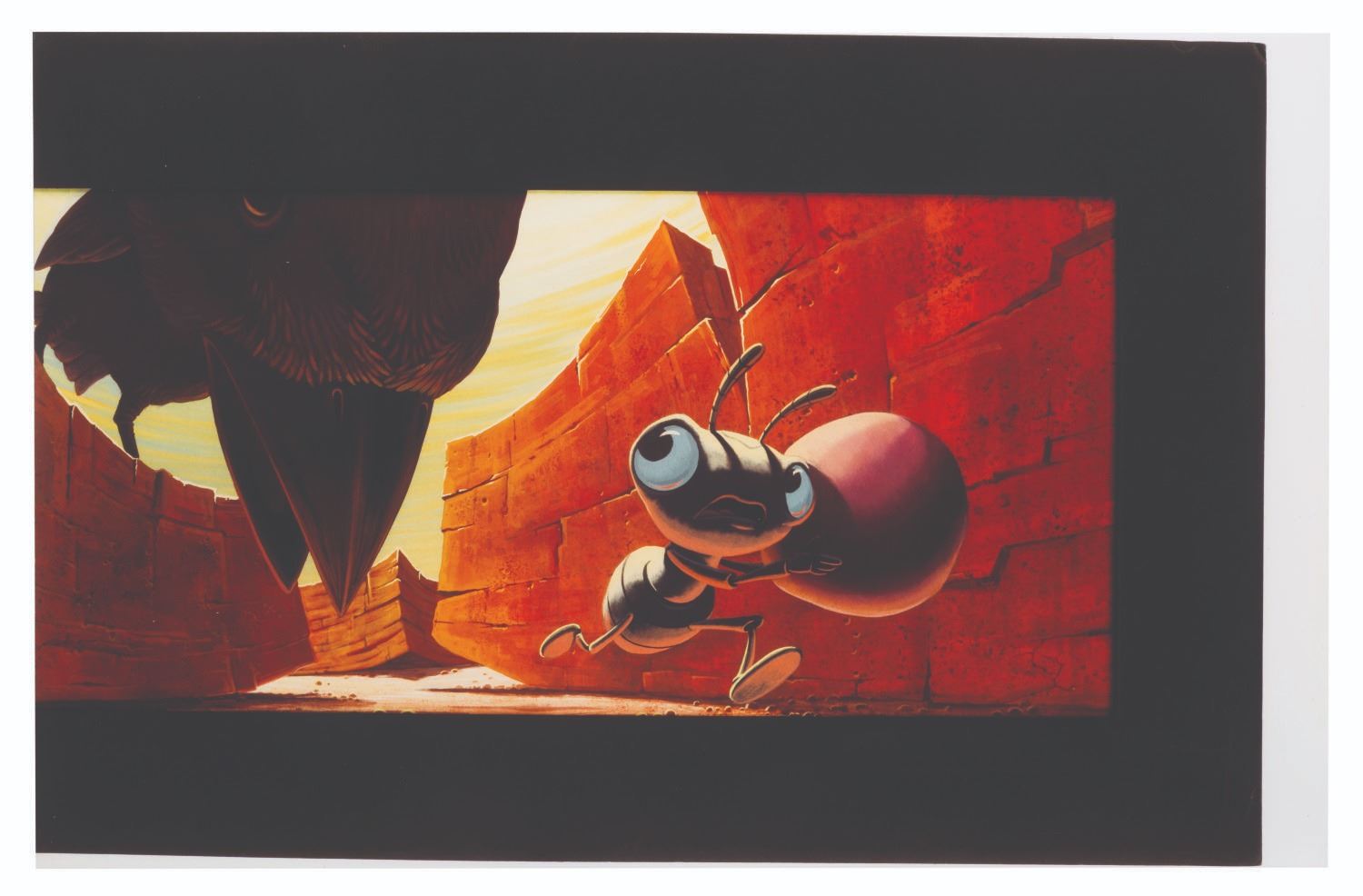 (Disney, 1998) An original print of digital concept art from Pixar’s"A Bug's Life." Featuring Princess Dot evading a dangerous bird, the concept was created at the studio and printed in a limited quantity for use in development and pitch meetings. With an image size of 7" x 14.25" and measuring 11" x 17" overall, the print is in very good condition with light wear from production use.