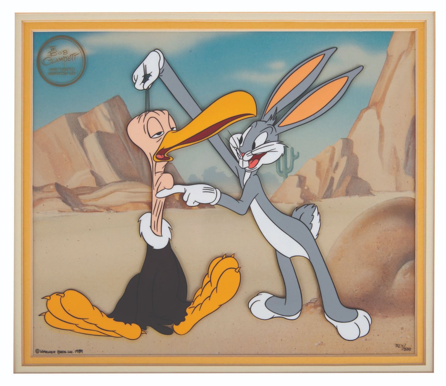 (Warner Bros./Bob Clampett Studios, 1989) A hand-painted cel of Bugs Bunny and Beaky Buzzard, a recreation of original animation from "Bugs Bunny Gets the Boid." Released in a limited edition, this cel is numbered 327/500 and includes its COA. With a character image size of 9.25" x 10.25" on a 9.75" x 11.75" visible lithograph background in a 16" x 20" matte, the art is in fine condition, while the matte exhibits light wear.