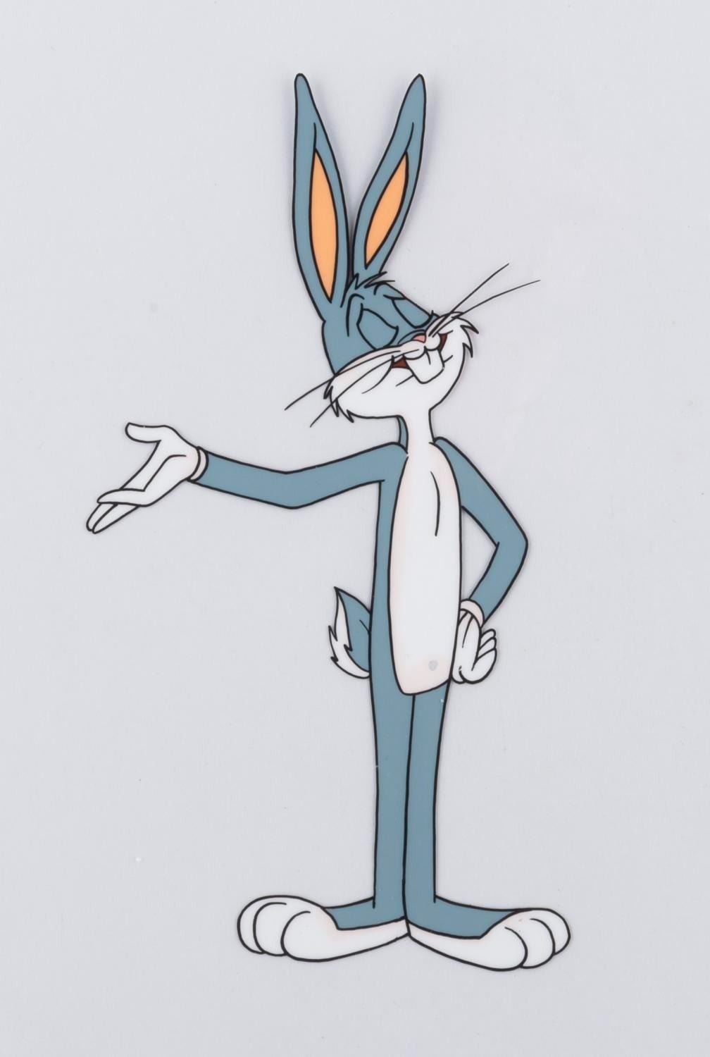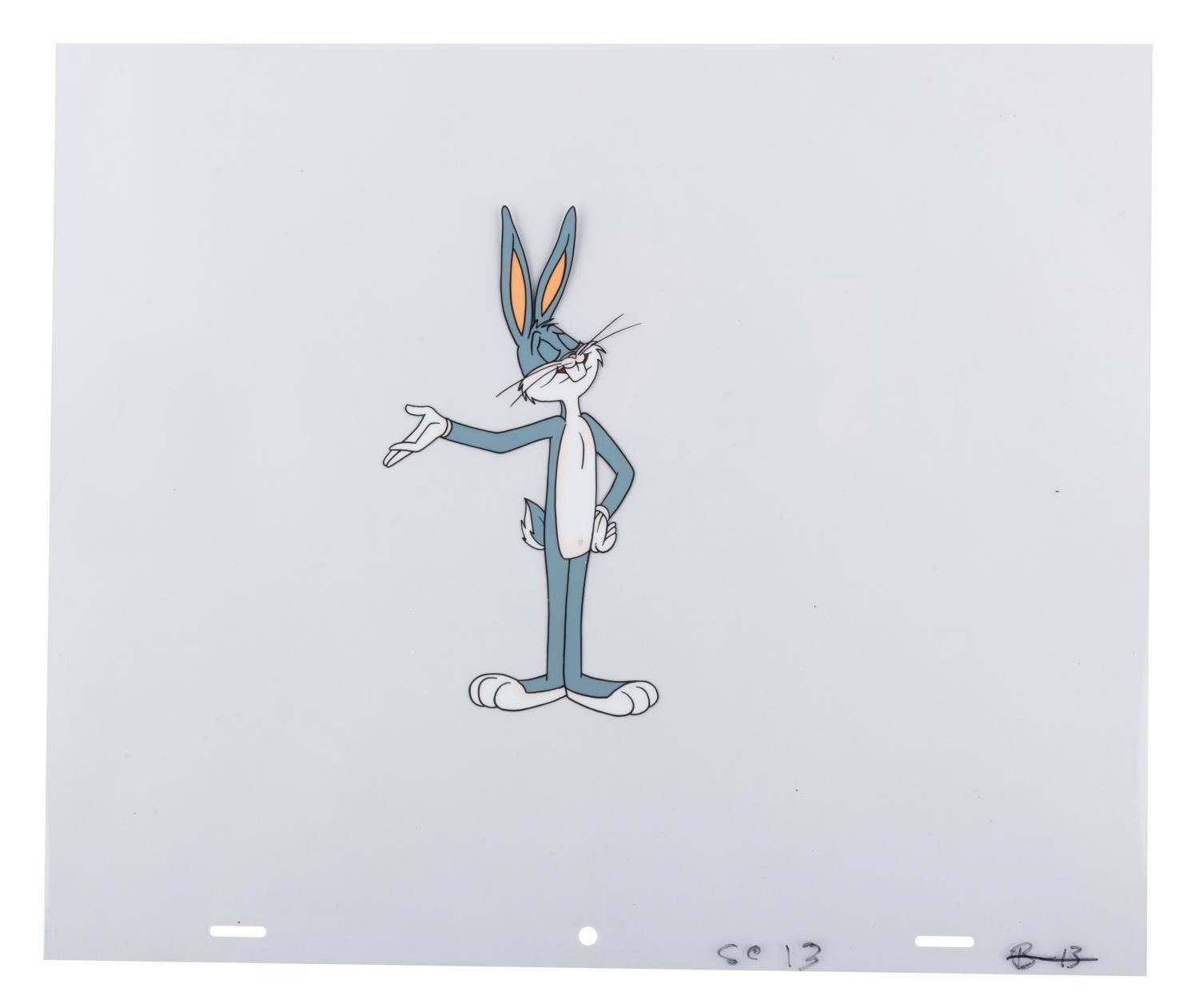 (Warner Bros., 1970s-80s) An original hand-painted production cel of Bugs Bunny from an unknown production. Bugs measures 5.75" x 3.75" on a 10.5" x 12.5" cel, the piece is in good condition with light discoloration around Bugs’ chest.