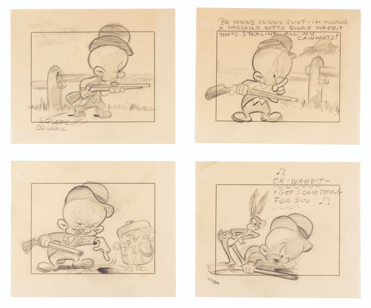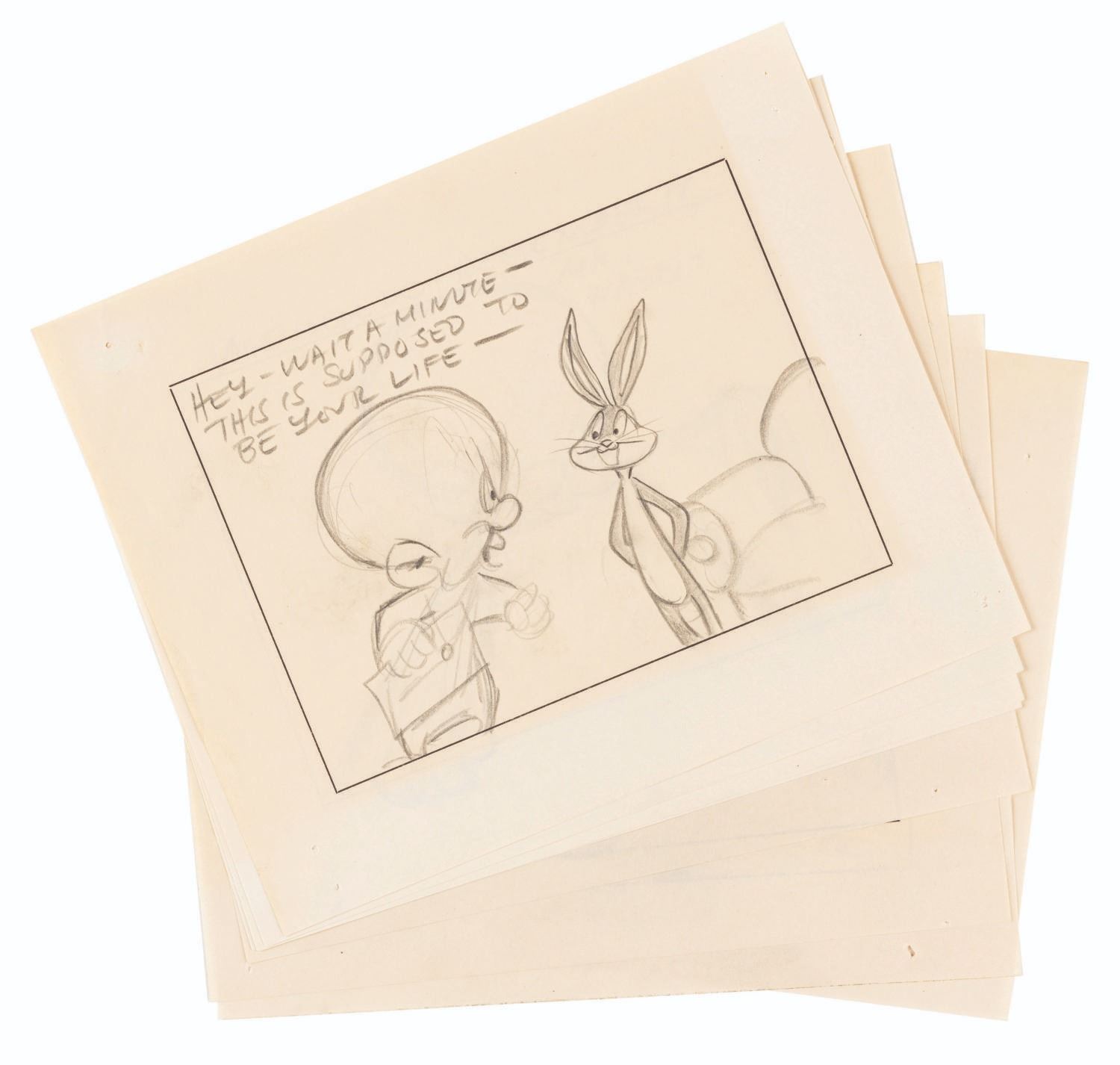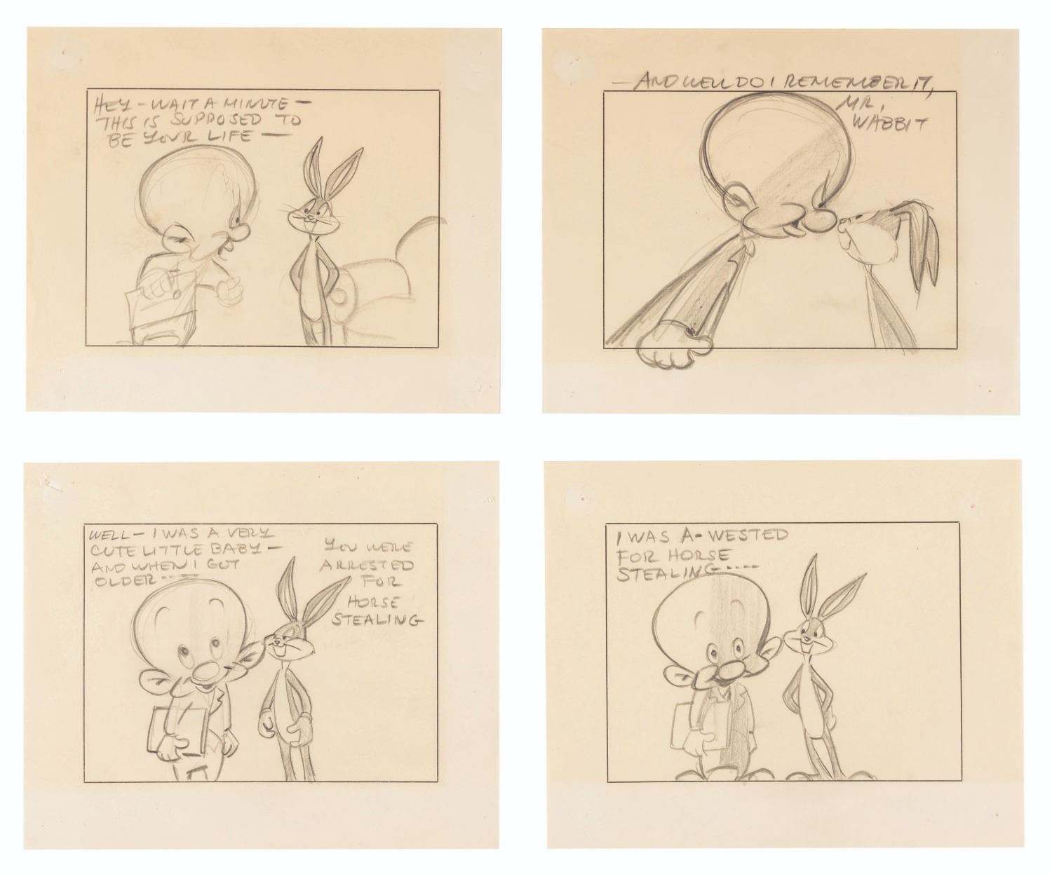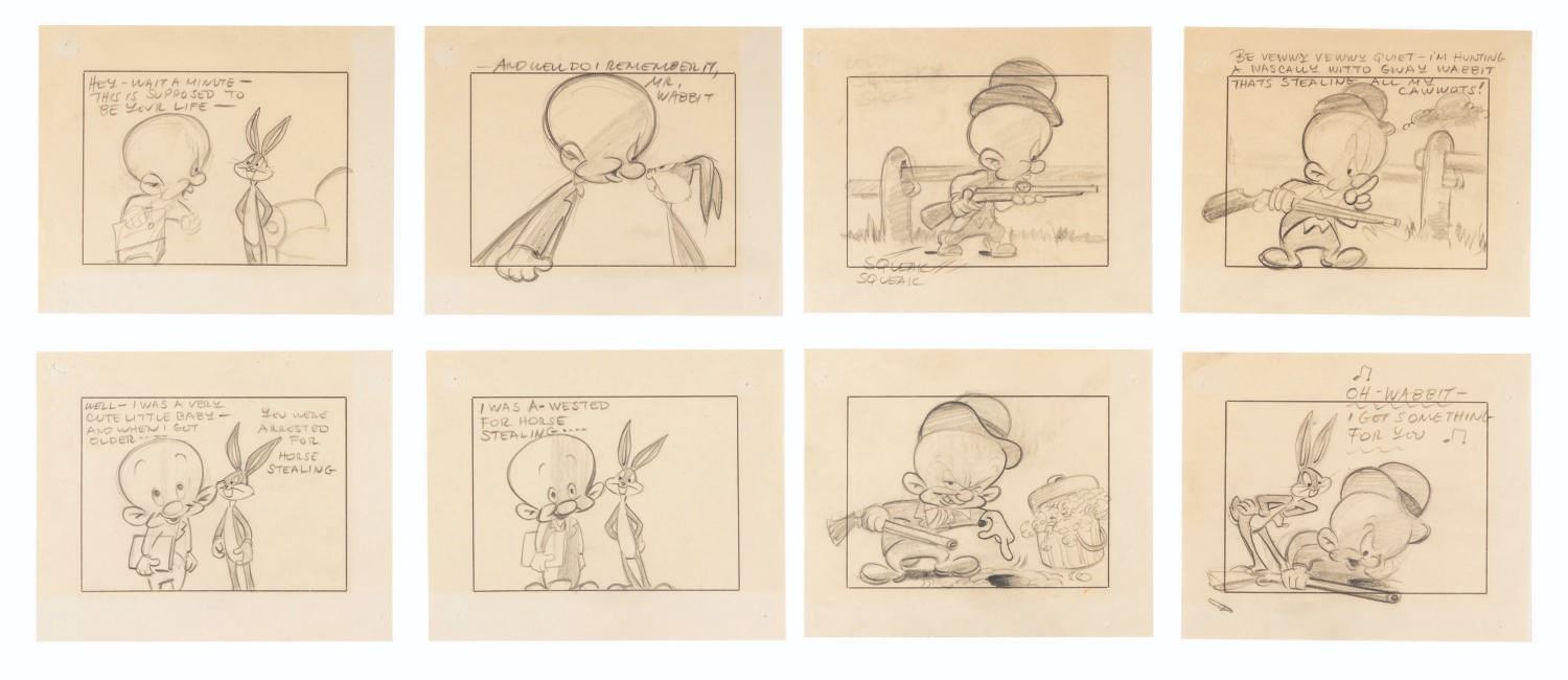 (Warner Bros., 1950s) A collection of eight storyboard panels from an unknown production featuring Bugs Bunny and Elmer Fudd. Measuring 5.75” x 7”, the panels are in very good condition with pinholes and corner tears from production use and light discoloration from age.