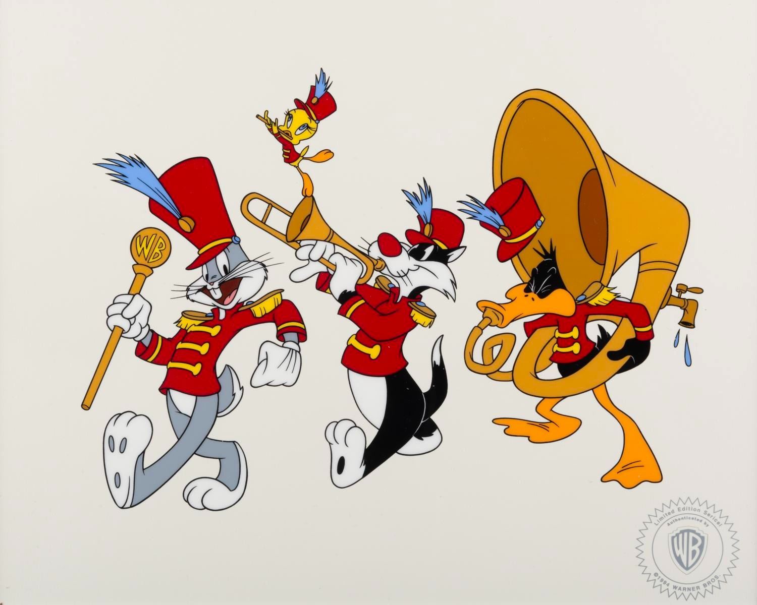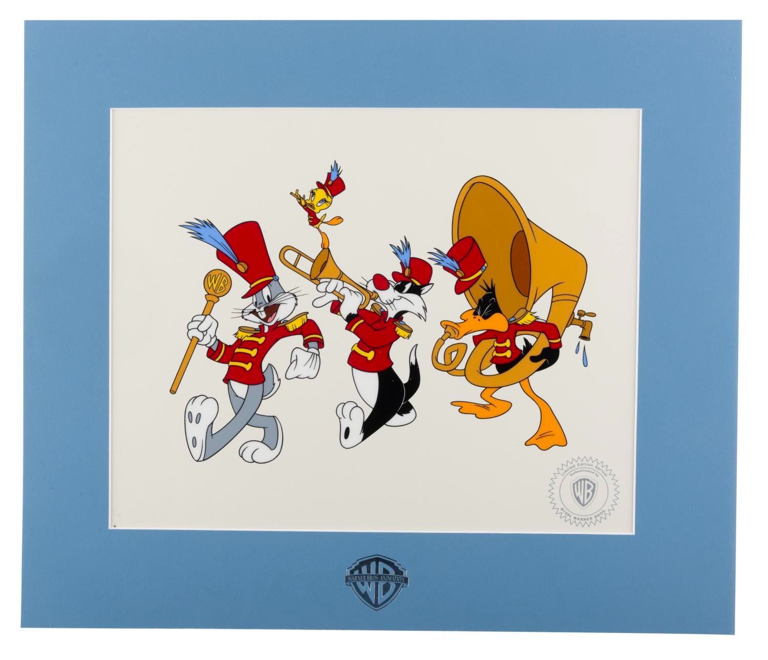 (Warner Bros., 1994) A limited edition sericel of Bugs Bunny, Sylvester, Tweety, and Daffy Duck as a marching band. The cel was offered at a screening in Los Angeles on May 28, 1994. With a character image size of 7” x 9.5” in a 13.75” x 16” matte with a silver embossed Warner Animation logo, the piece is in fine condition.