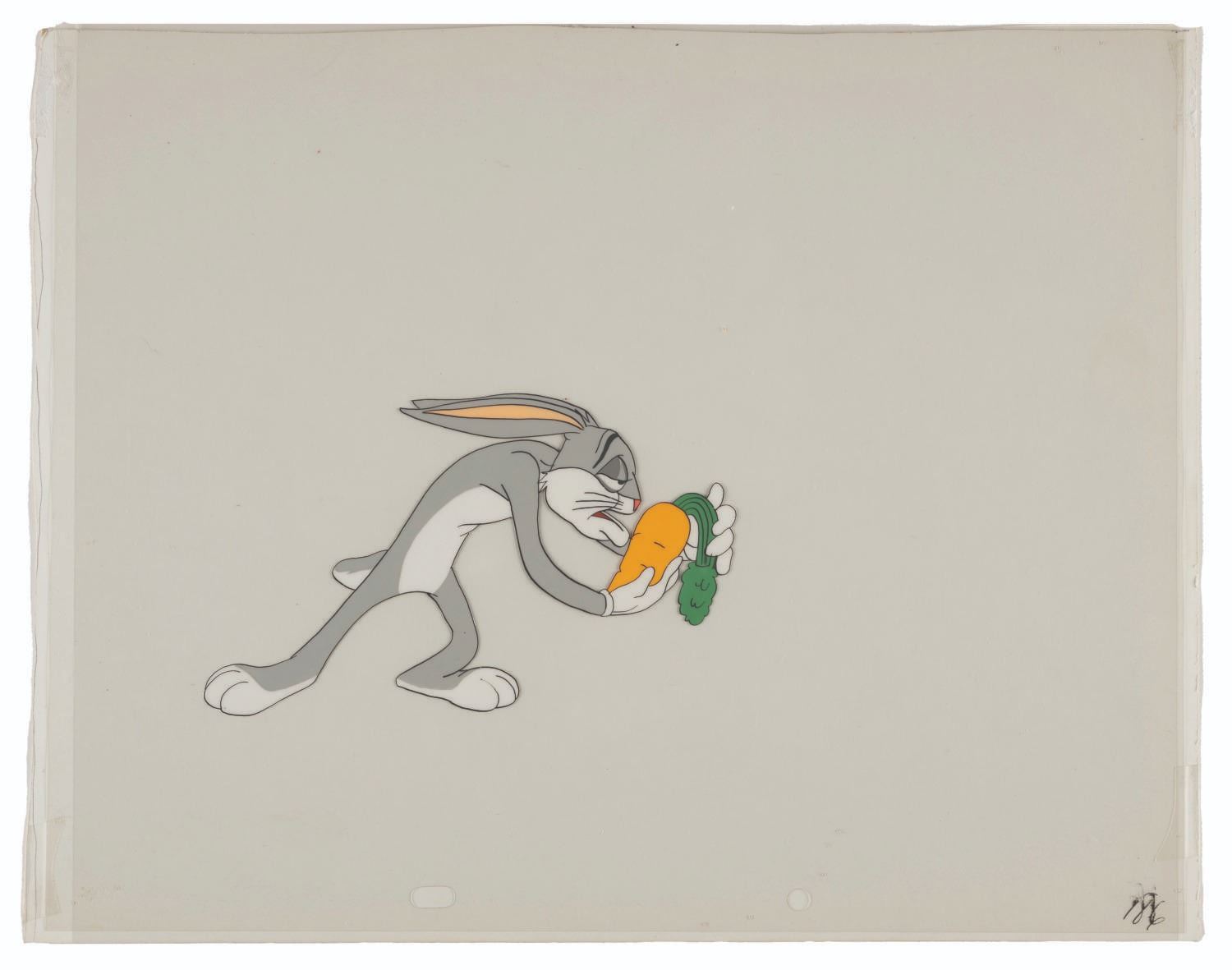 (Schlesinger, 1944) An original production cel of Bugs Bunny imitating Charles Boyer from the Merrie Melodies short “What’s Cookin’ Doc?” directed by Bob Clampett. With a character image size of 3.5” x 6” on a 10” x 12.5” cel, the piece is in very good condition with light scuffs and pinholes in the corner which do not affect the image.