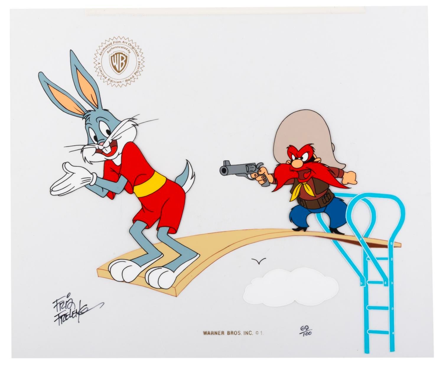 (Warner Bros., 1987) A hand-painted limited edition cel of Bugs Bunny and Yosemite Sam titled "High Diving Hare," signed by Friz Freleng. Numbered 69/100, the cel measuring 10.5" x 12.5" is in very good condition, with wear to the stamped copyright year only.