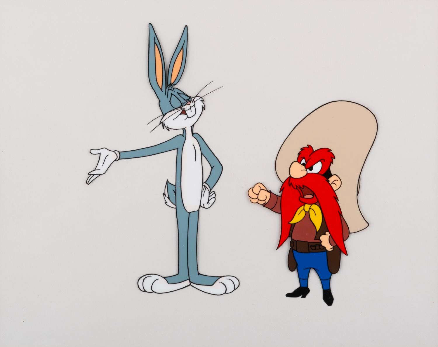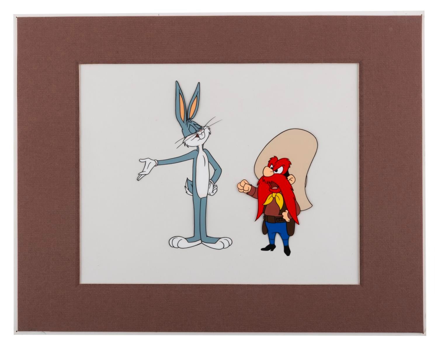 (Warner Bros., 1970s-80s) An original hand-painted production cel of Bugs Bunny and Yosemite Sam from an unknown production. With an image size of 6” x 6” on a 7.5” x 9.5” visible cel in an 11” x 14” matte, the piece is in very good condition with light scuffing which does not affect the image.