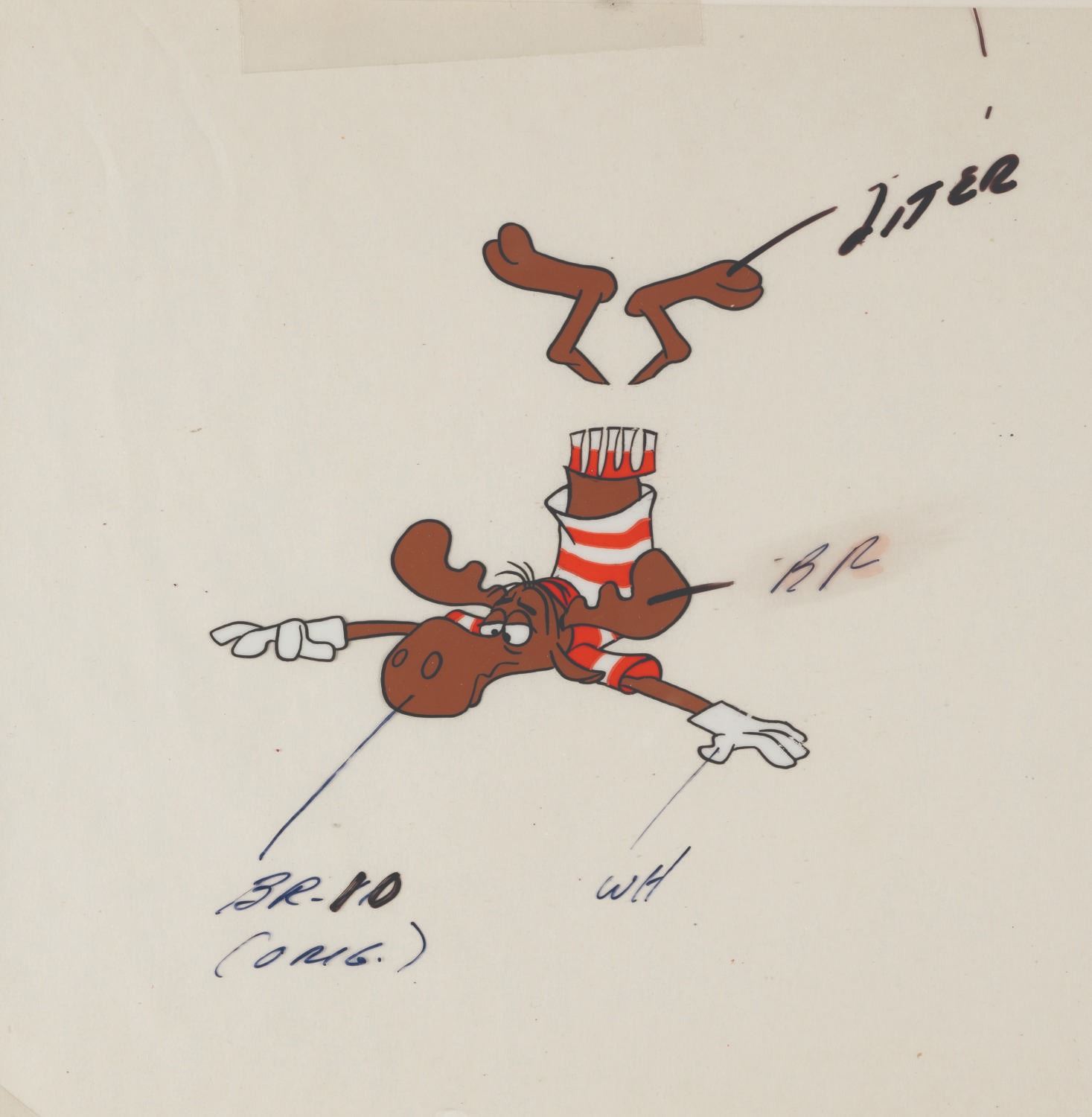 (Ward, 1960s) A hand-painted color key cel for a 1960s Cheerios commercial starring Bullwinkle. With an image size of 3.75” x 4.25” on an 8” x 8” trimmed cel, adhered to a 10.5” x 12.5” piece of animation paper, the piece displays in very good condition with light scratches, wear, and a fold at the corner.