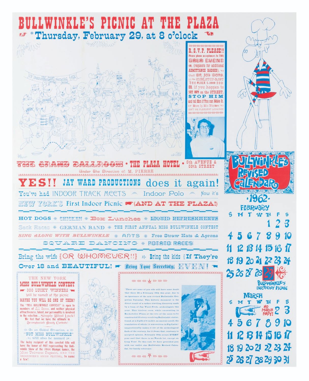 (Ward, 1962) A rare poster/invitation for Jay Ward’s indoor Picnic at the New York Plaza Hotel, held on “February 29th” (actually March 1), 1962. Held in the Plaza’s illustrious Grand Ballroom, Ward trucked in plots of grass to carpet the floor, served box lunches alongside champagne and caviar, and even provided picnic ants - safely behind glass, to the relief of Plaza management. Measuring 22.5” x 28.5”, the poster is in fine condition, with a very faint vertical line of discoloration.