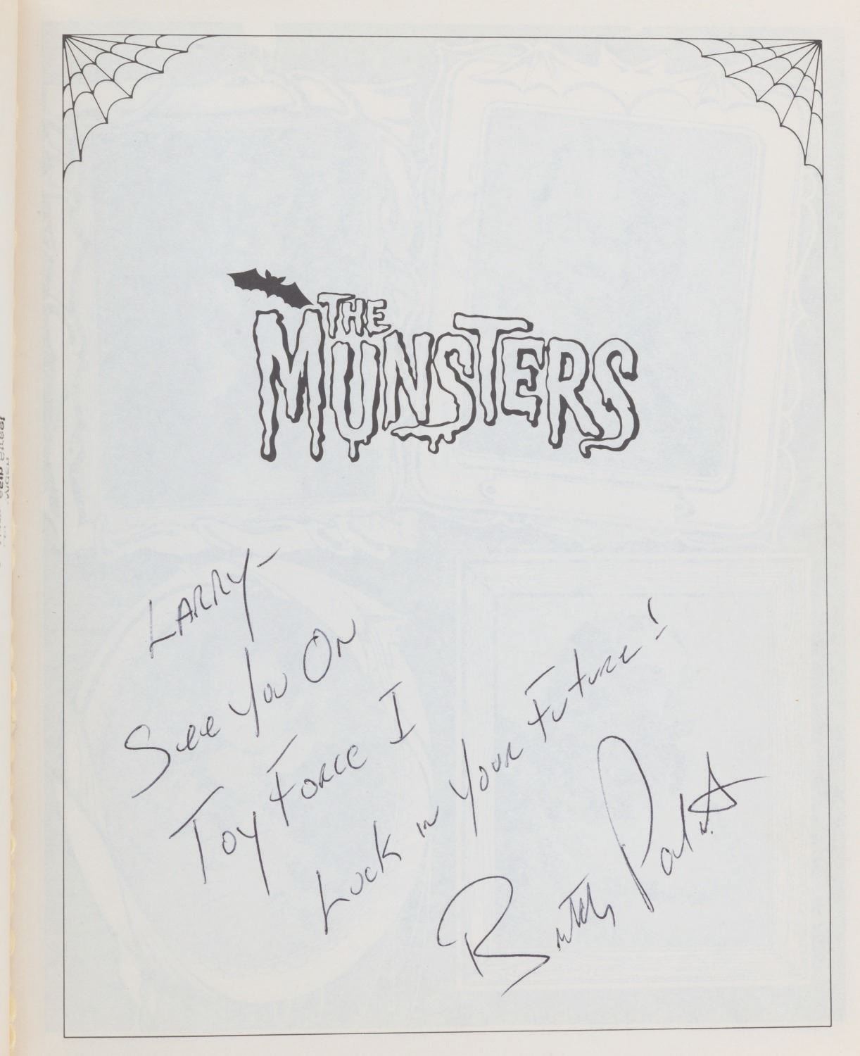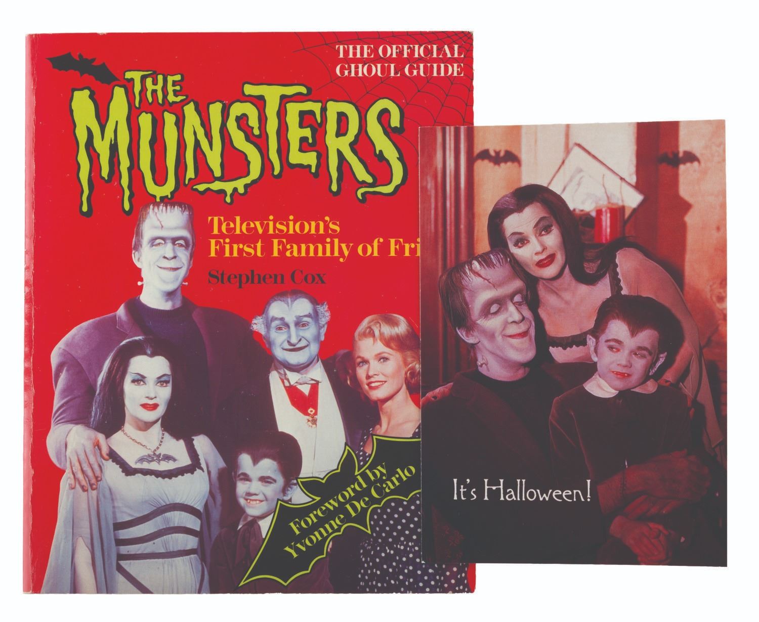 (Contemporary Books, 1989) A The Munsters Television’s First Family of Fright book by Stephen Cox. The first page is signed by Butch Patrick, who played Eddie Munster, with a dedication. Also included is an unused Munsters Halloween greeting card. The autographed book and the card are in very good condition.
