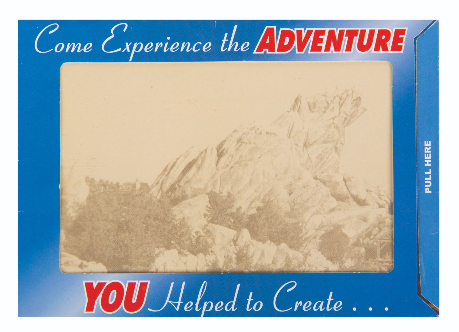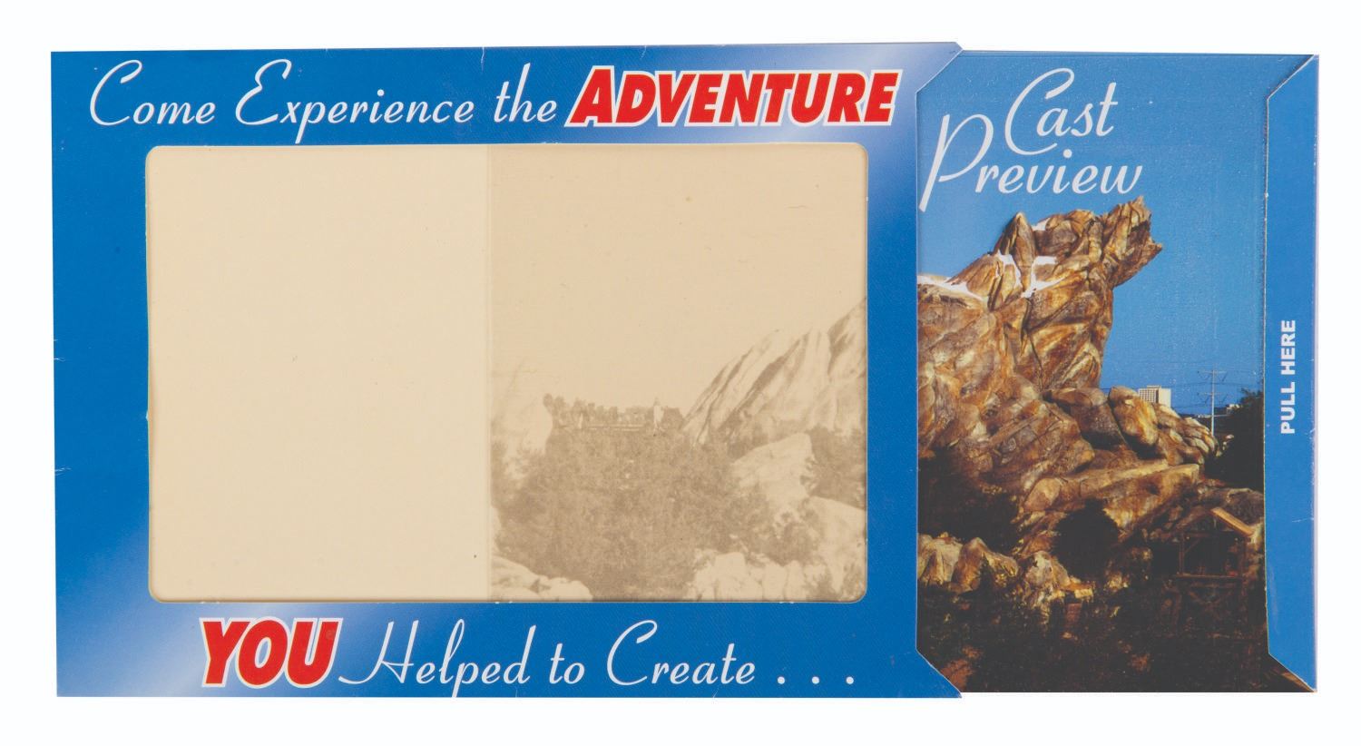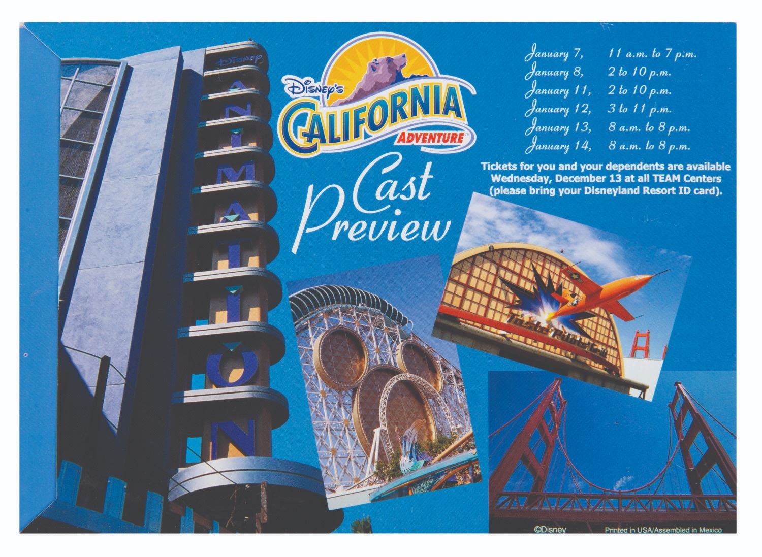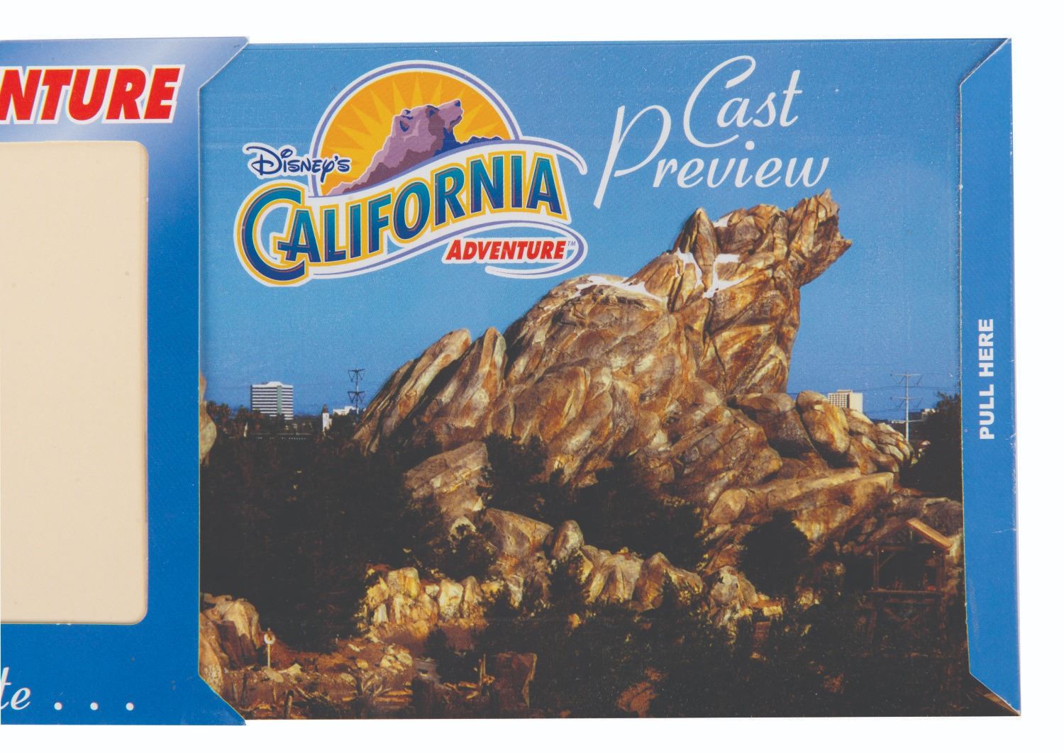 (Disney's California Adventure, 2001) A Disney's California Adventure Cast Preview invitation with an image of Grizzly Peak that changes from sepia to full color. This was distributed to Burbank, Glendale, and Disneyland Resort Cast Members inviting them to preview the new Park. Measuring 7" x 5", the invitation is in very good condition with light handling wear.