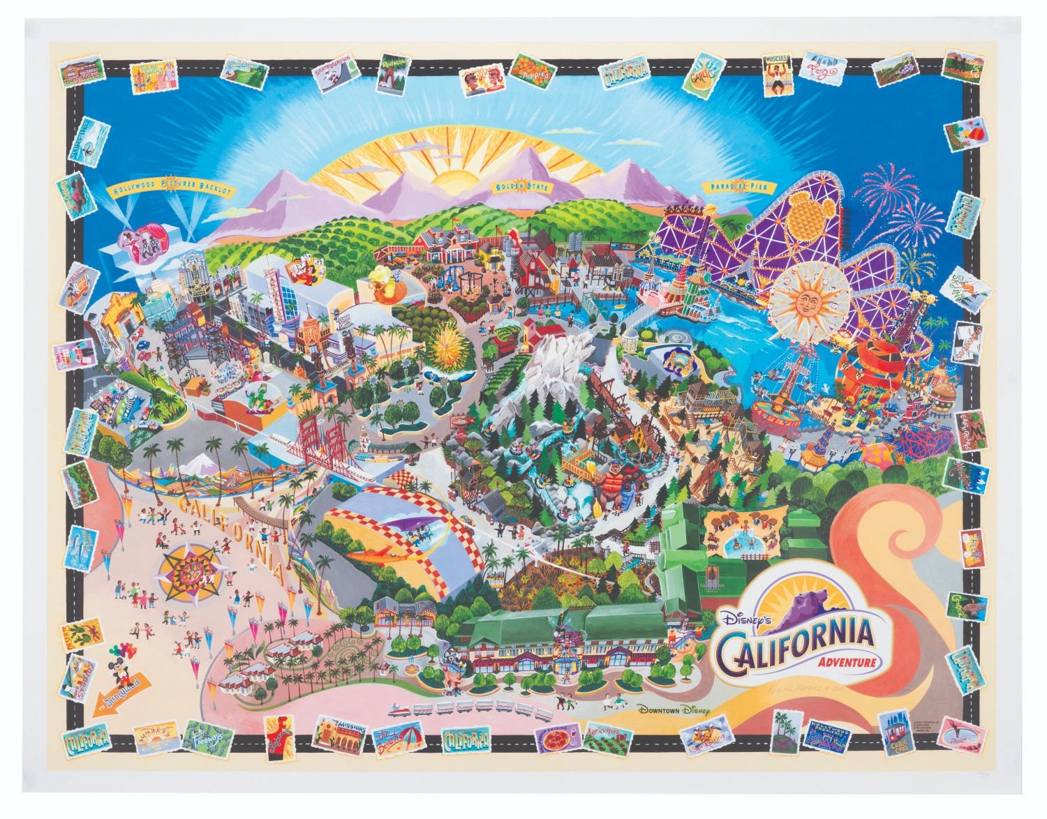 (Disney's California Adventure, 2001) A stylized illustrated map celebrating the Grand Opening of Disney's California Adventure on February 8, 2001. Measuring 28" x 36," the map is in very good condition with light edge wear and creasing in one corner.