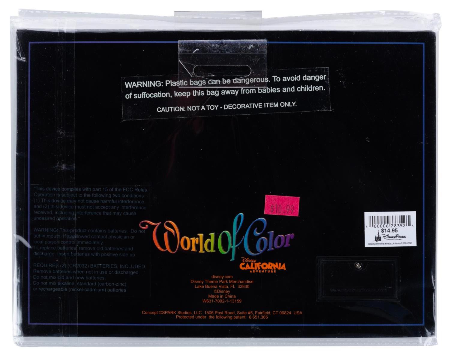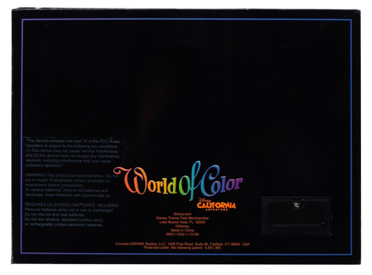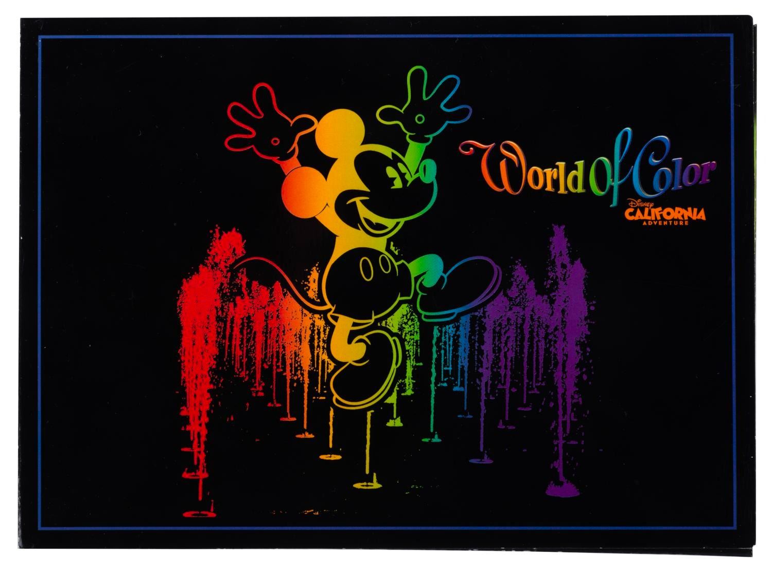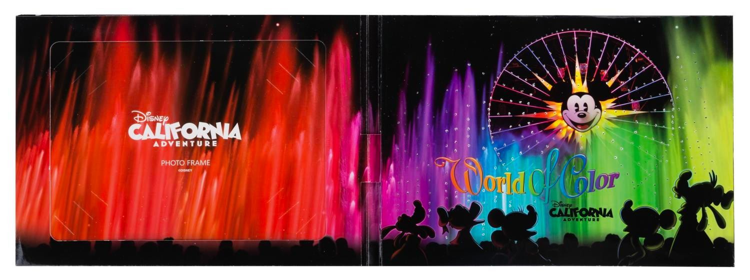 (Disney's California Adventure, 2010) A picture frame themed to the World of Color nighttime spectacular, made to display a photo measuring from 3" x 5" up to 5" x 7". When opened, the inside image of Mickey's Fun Wheel lights up and flashes. Measuring 7" x 9.75", the cardboard frame is in very good working condition with very light handling wear.