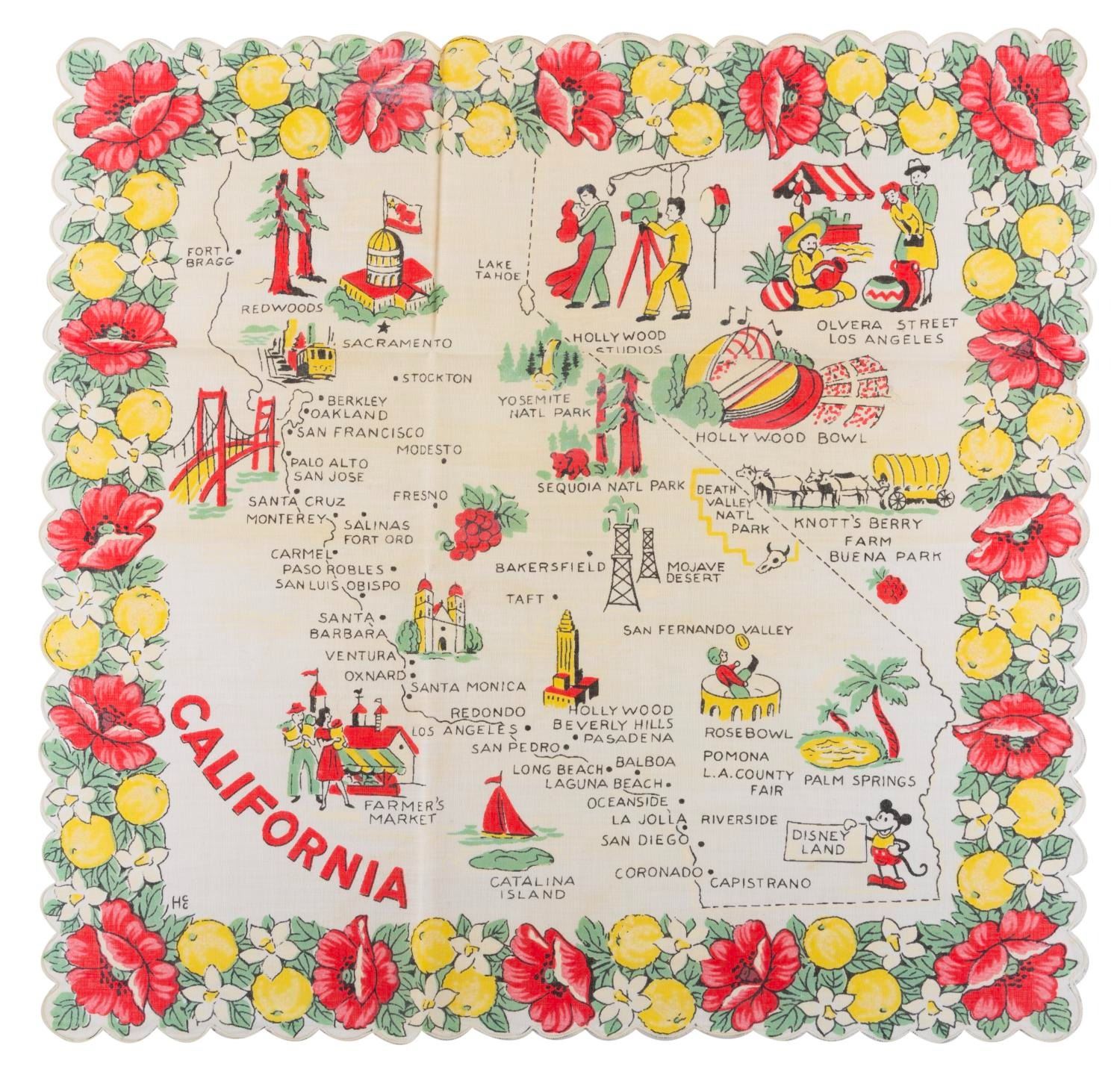 (1950s-60s) A California handkerchief featuring the state's cities, iconography, and Mickey Mouse holding a Disneyland sign. Measuring 13" x 13", the handkerchief displays in very good condition with light discoloration from age and folds from storage.