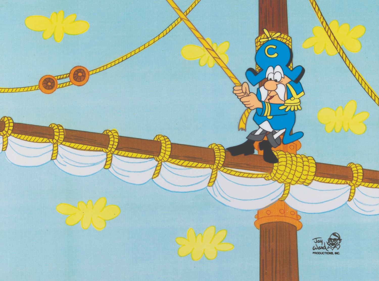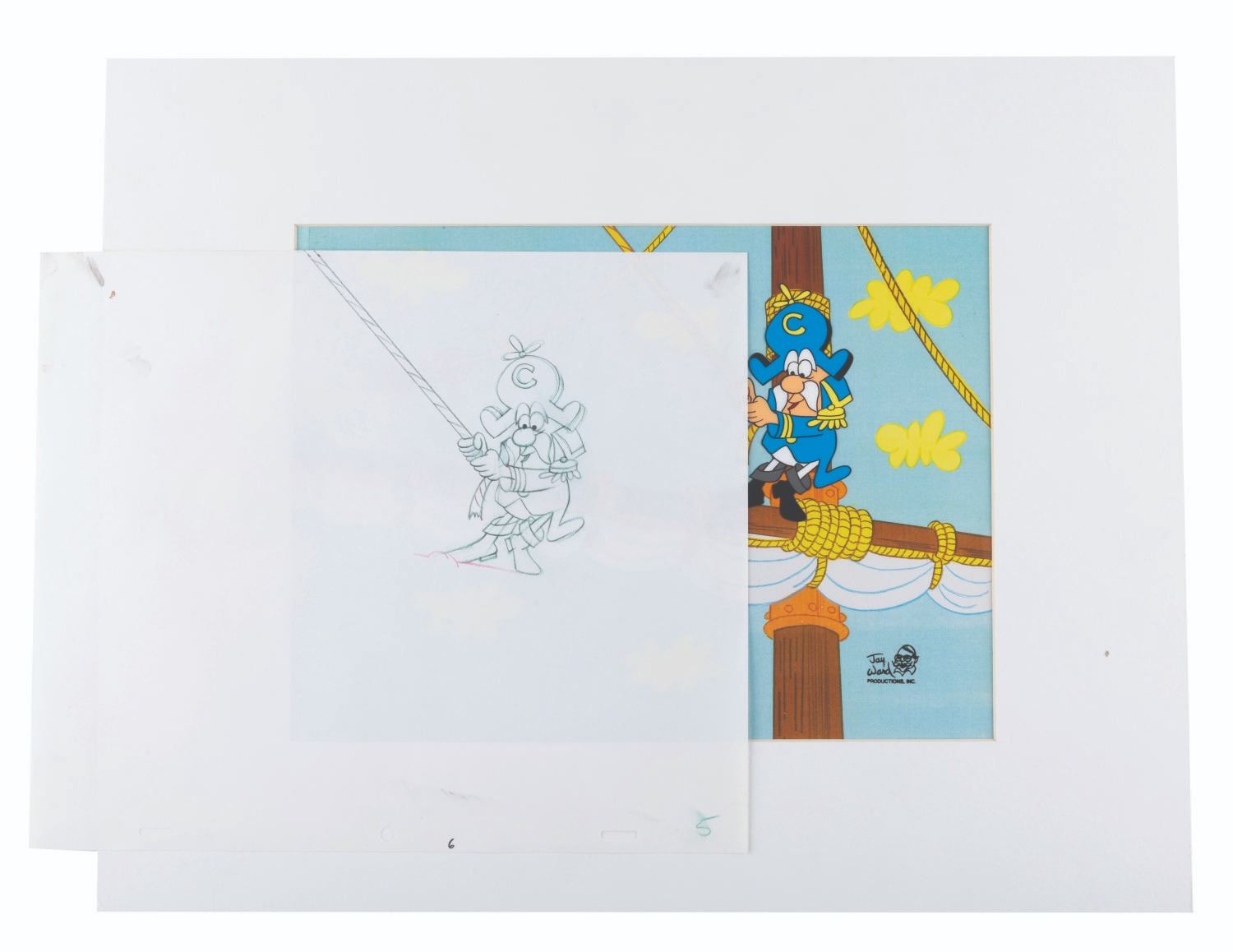 (Quaker Oats, 1960s-80s) An original production cel and drawing from a Cap’n Crunch commercial with a color copy background. With a character image size measuring 4.25” x 2.5” on a 9” x 12” visible cel and in a 15” x 19” matte, the cel is in fine condition. The drawing measures 10.5” x 12.5” and is in good condition with light stains to the top corners which do not affect the image.