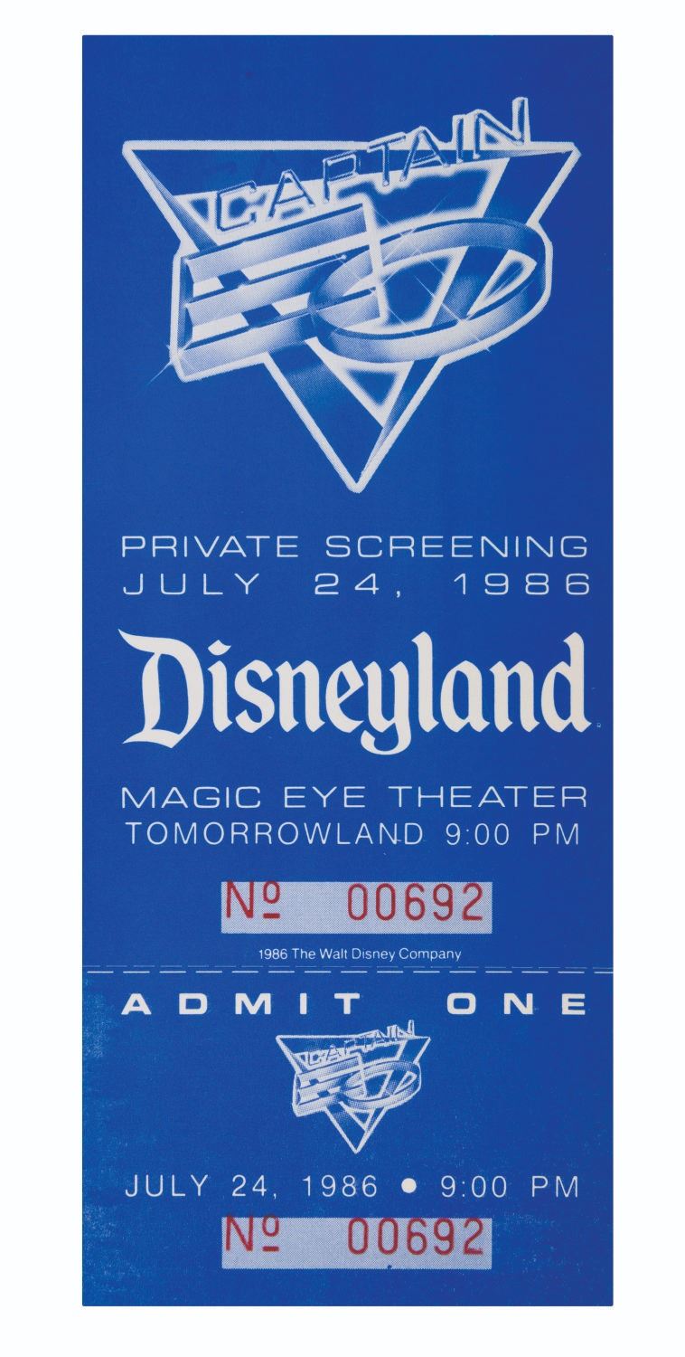(Disneyland, 1986) A rare unused ticket to a private screening of Captain EO on July 24, 1986, three weeks before the attraction officially opened. The 2.5" x 6" ticket, numbered 00692, is in very good condition with light wear to the retained stub.