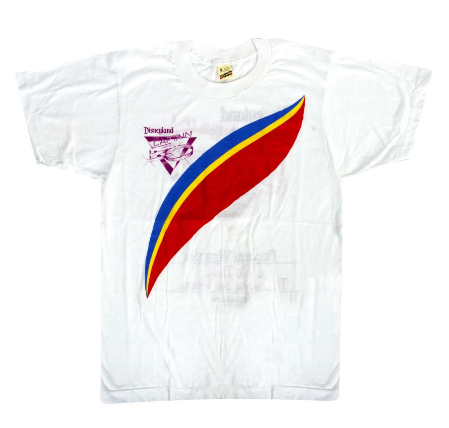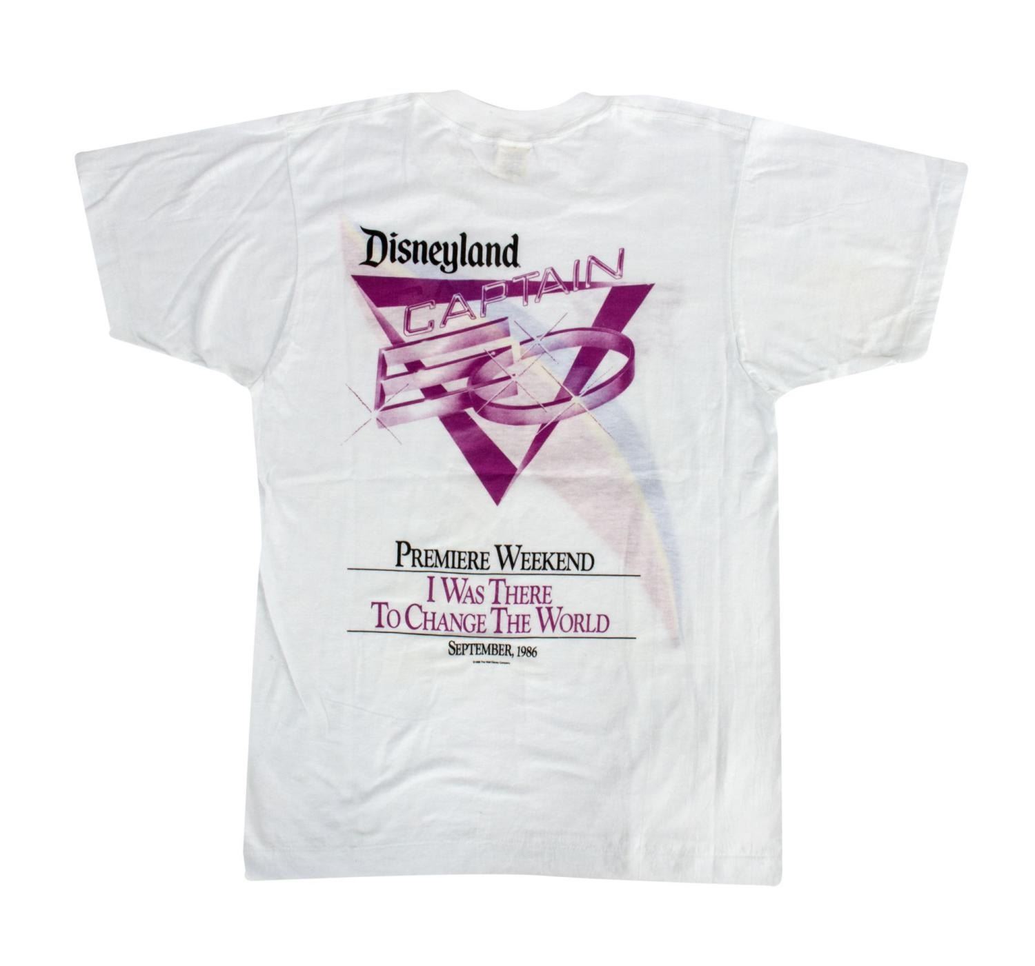 (Disneyland, 1986) A very rare souvenir t-shirt from the Premiere of Captain EO at Disneyland in September of 1986. The front features the attraction logo, and pattern as seen on Jackson's shirt in the motion picture. The back has a larger version of the logo with "Premiere Weekend - I Was There to Change the World." The shirt is a size small and is in very good condition with a few small spots of discoloration.