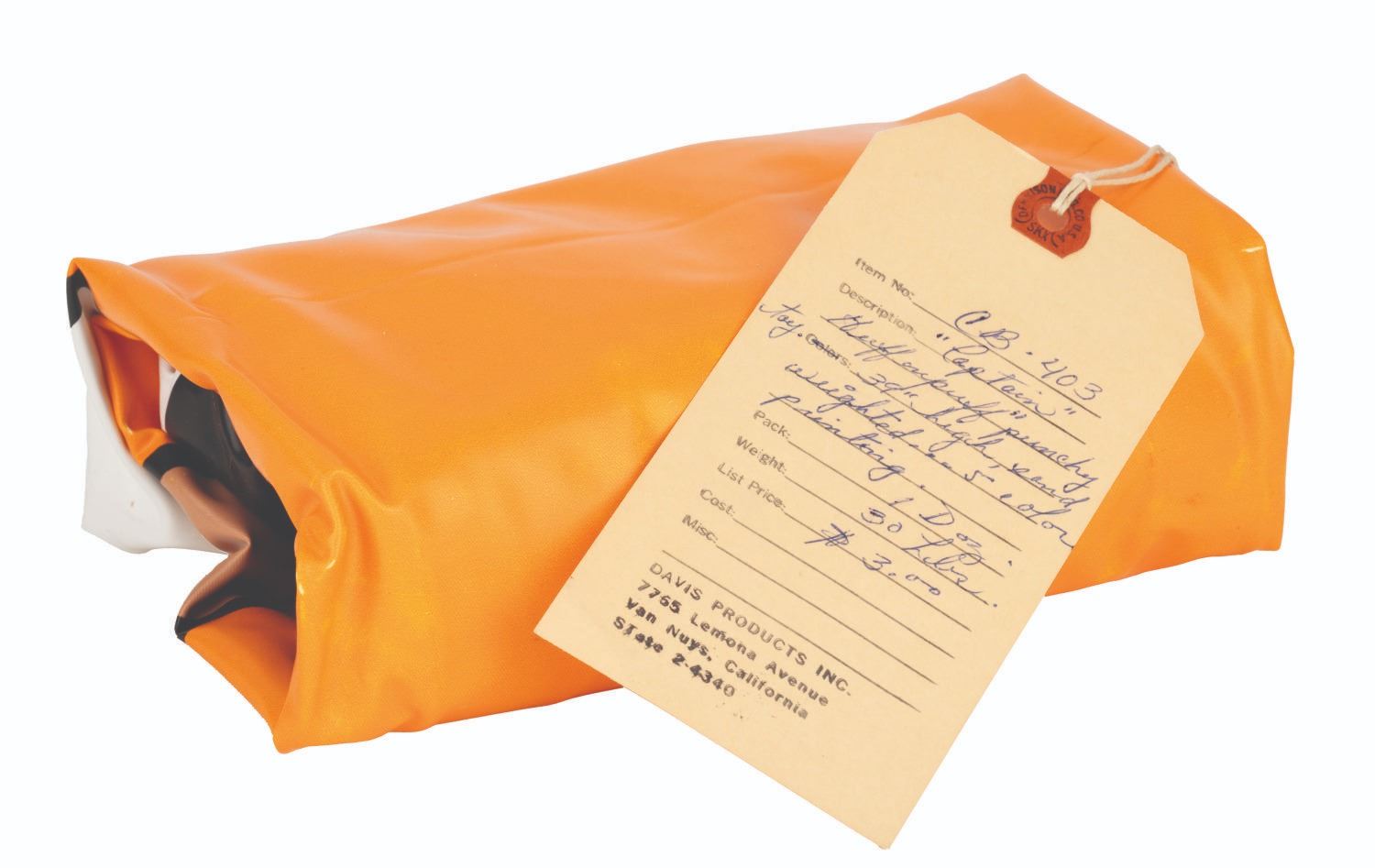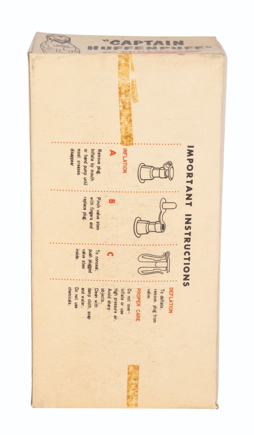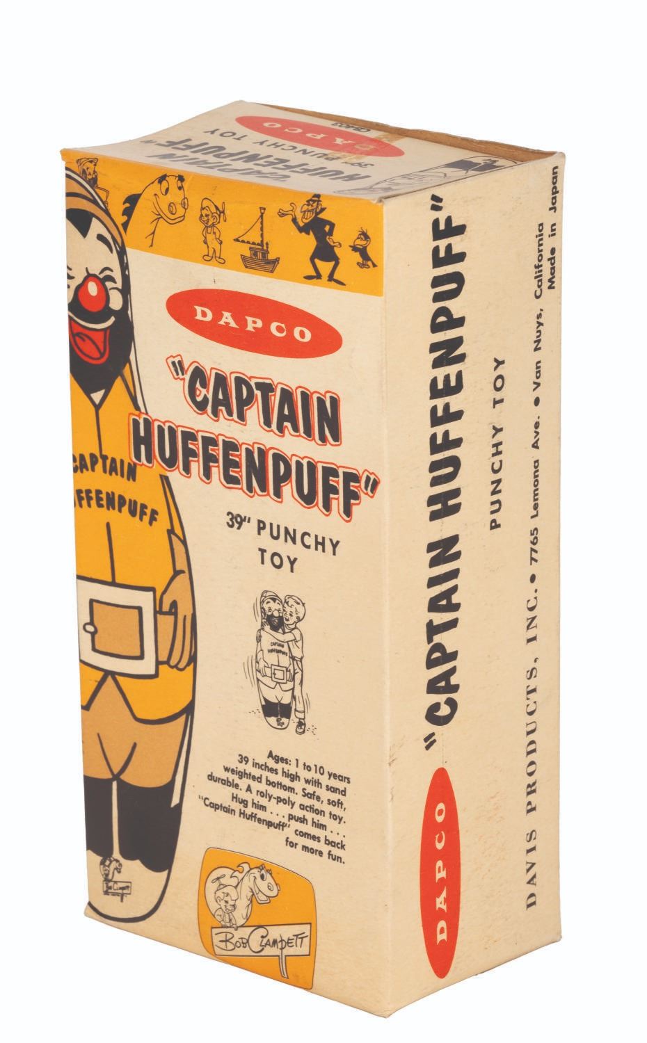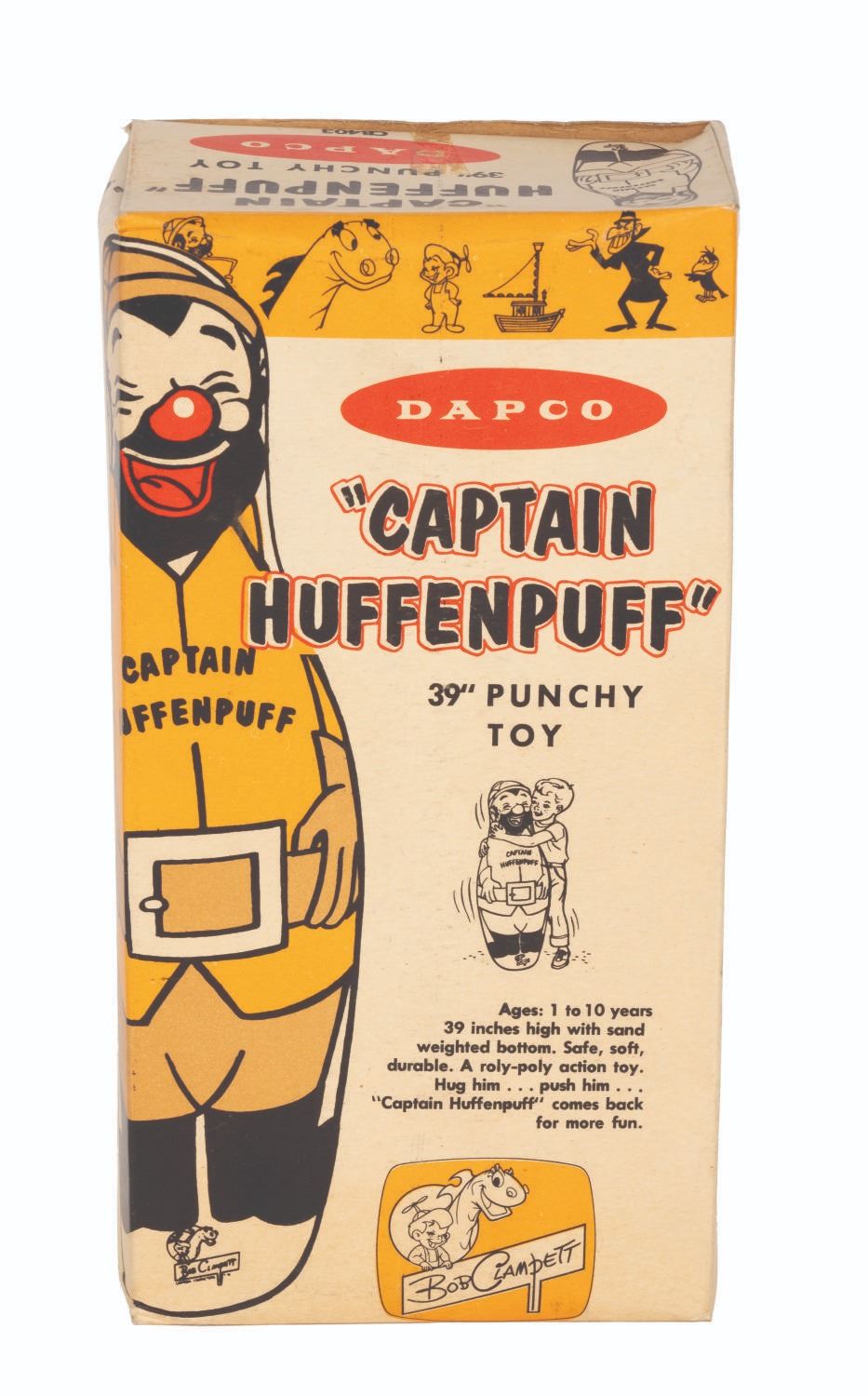 (Dapco, 1950s-60s) A rare production sample Captain Huffenpuff Punchy Toy weighted with sand in the bottom, so he’d bounce back when pushed. The toy has not been tested for inflation. Measuring 39” tall with its original 4.25” x 2.75” x 8.5” box, the toy is in very good condition with light paint loss and wear, while the box displays in very good condition with light creases, tape, and discoloration from age.