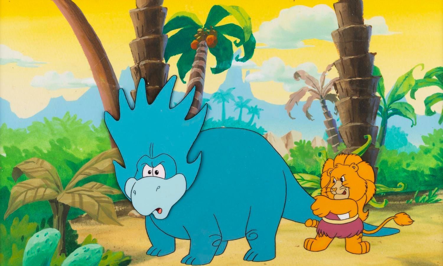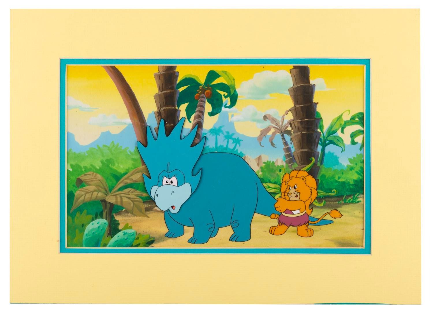 (DiC, 1988) An original multi-layer production cel and background from the "Care Bears " episode "One Million CB, " featuring Brave Heart and a dinosaur. With an image size of 4.75 " x 8 " on a 7.5 " x 11 " visible cel. The entire matted piece measures 11.5 " x 16 " and is in very good condition with scratches and wear from production use.