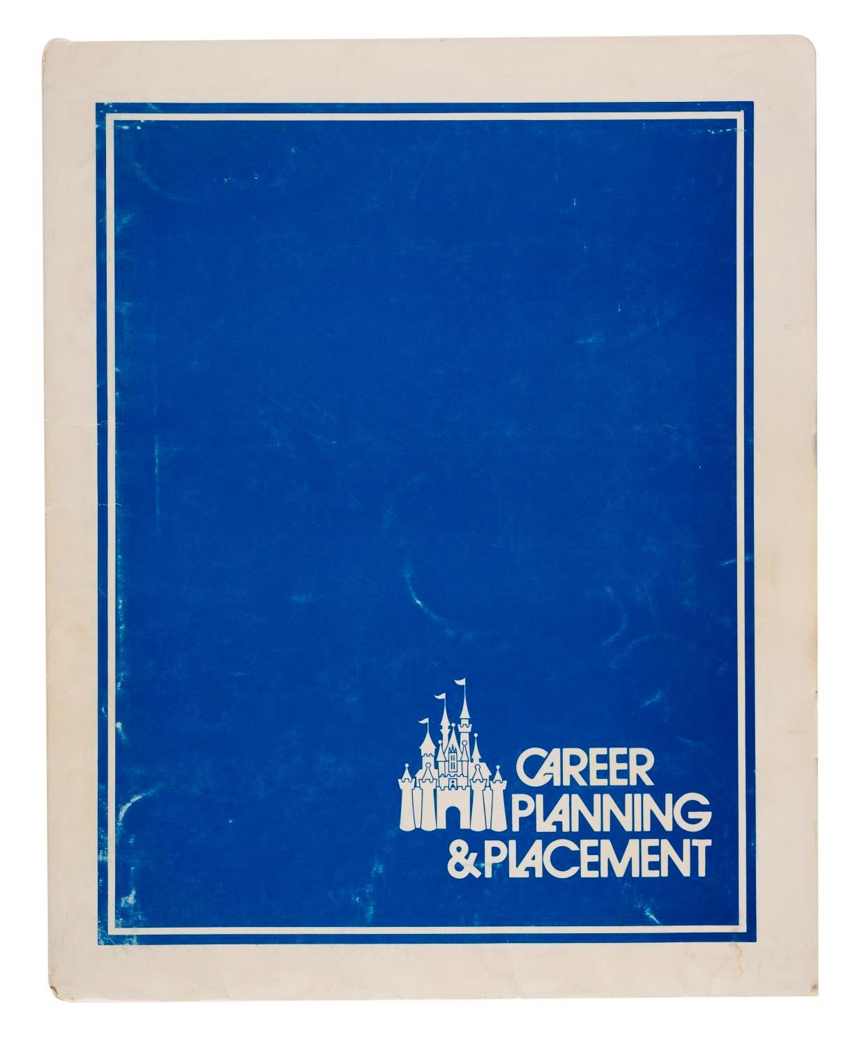 (Disneyland, 1974-1986) A Cast Member Career Planning and Placement package including thirteen documents related to job opportunities and career planning at Disneyland. The outer folder measures 9.5" x 11.75", and the items are in very good condition with expected wear from use and graphite writing on one document. The exterior folder is in fair condition with notable edge wear, scratches, and creasing throughout.