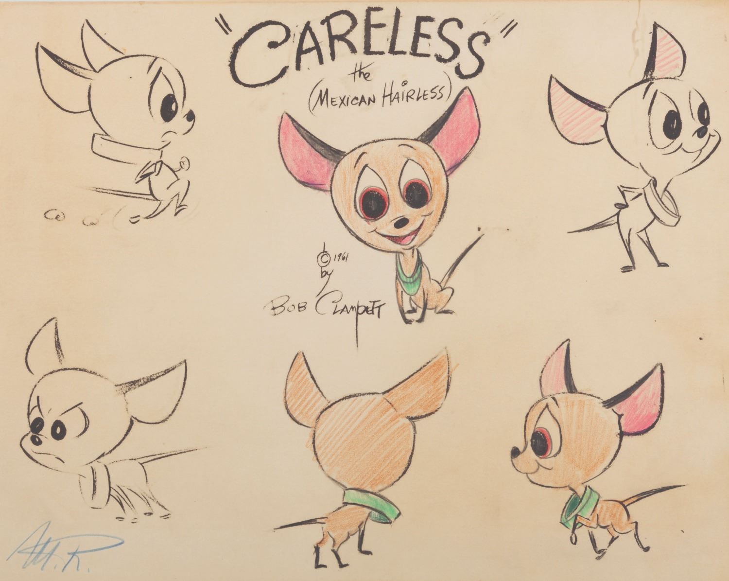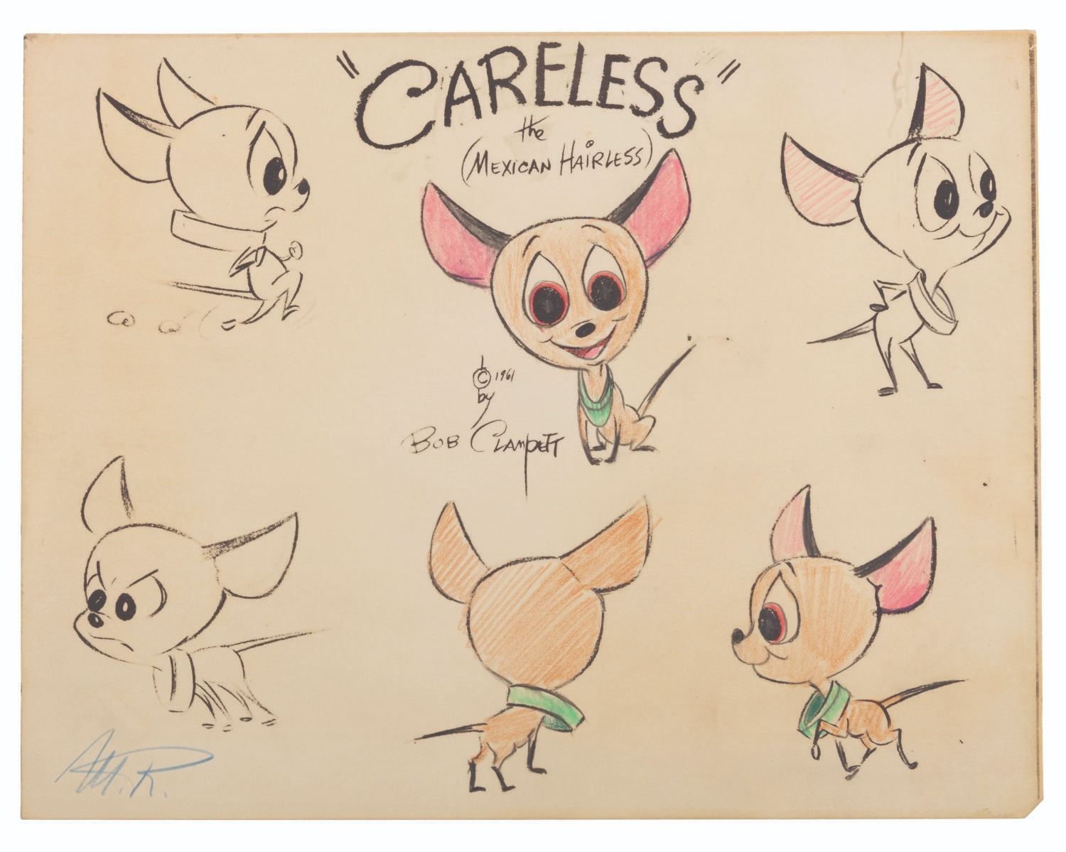 (Clampett, 1961) An original production used model sheet of "Careless the Mexican Hairless,” a recurring character from “Beany and Cecil.” The model sheet is a photostat copy on animation paper which has been hand colored by the show’s color stylist, Marie Reed. Measuring 8.5” x 11” the model sheet is in very good condition with light creases and edge wear from production use and light discoloration from age.