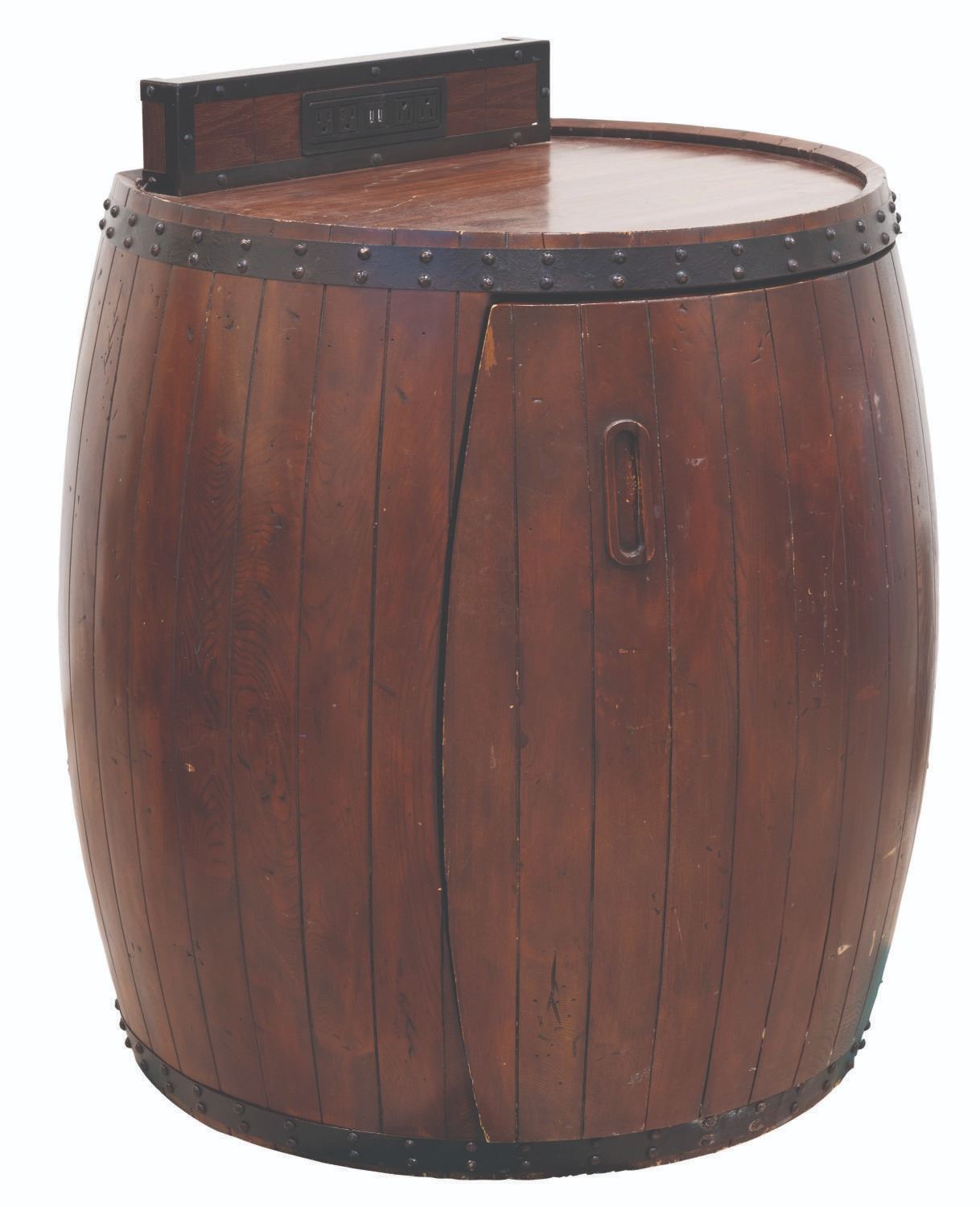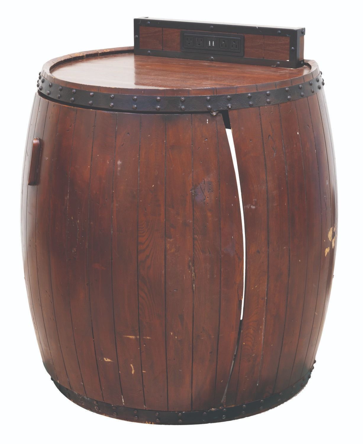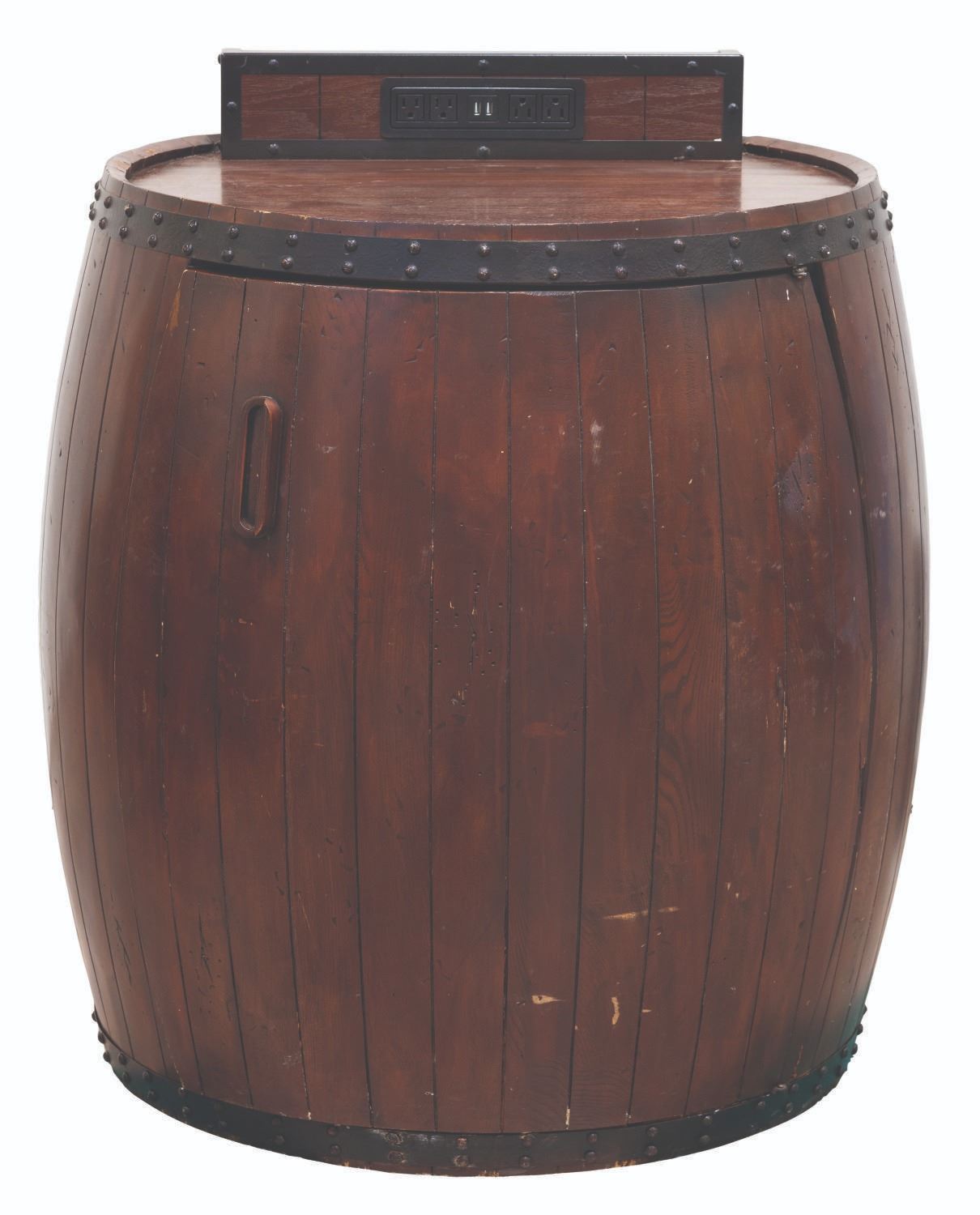 (Disney’s Caribbean Beach Resort, 2009-2022) A large barrel minibar from the Pirate Rooms at Disney’s Caribbean Beach Resort. At home in a captain’s quarters or a living room, this barrel features a charging station on top and a hidden door (which does not close fully) that reveals space for a secret minifridge. Measuring 25.5” x 28.5” x 39” tall, the barrel minibar displays in good condition with intentional distress, scuffs, stains, and wear from Resort use. Due to size and weight, this item will require special shipping arrangements. Please inquire before bidding.