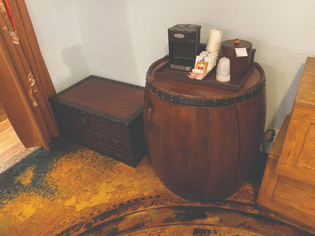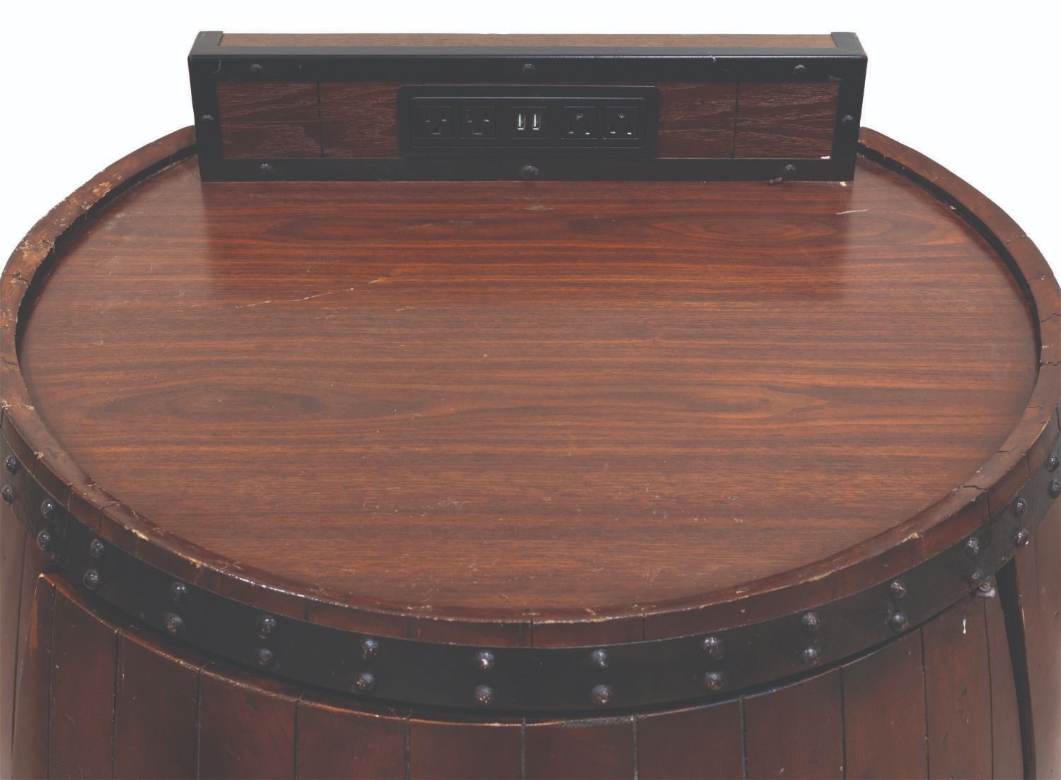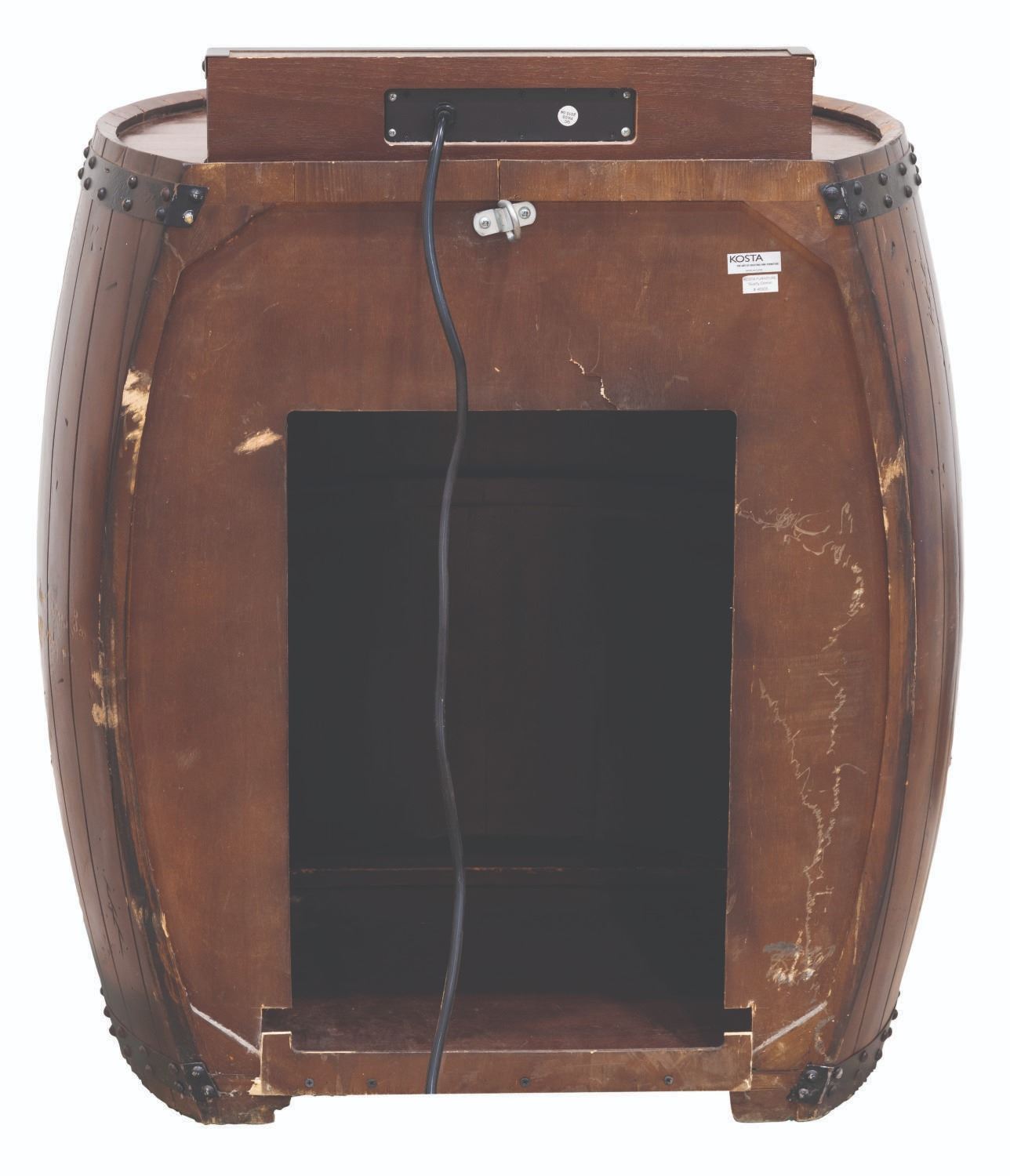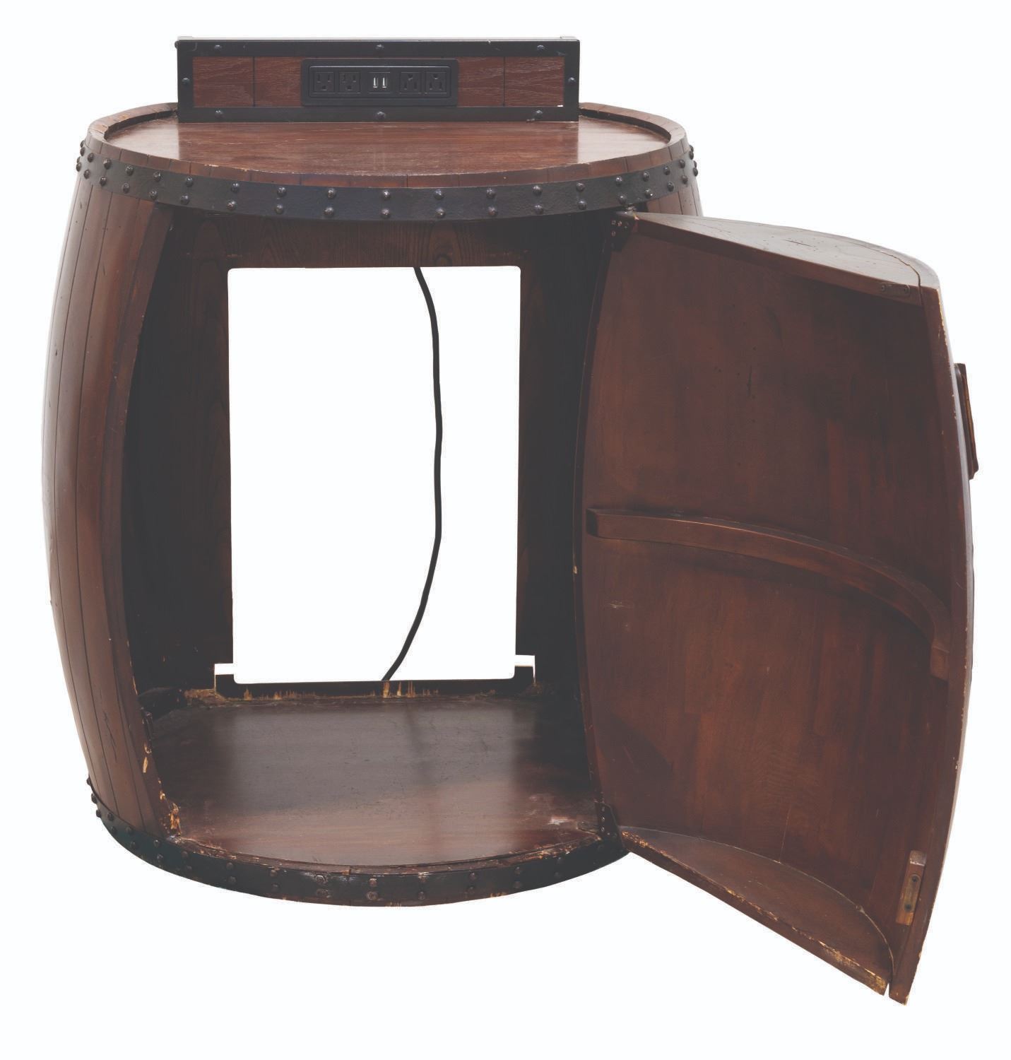 (Disney’s Caribbean Beach Resort, 2009-2022) A large barrel minibar from the Pirate Rooms at Disney’s Caribbean Beach Resort. At home in a captain’s quarters or a living room, this barrel features a charging station on top and a hidden door (which does not close fully) that reveals space for a secret minifridge. Measuring 25.5” x 28.5” x 39” tall, the barrel minibar displays in good condition with intentional distress, scuffs, stains, and wear from Resort use. Due to size and weight, this item will require special shipping arrangements. Please inquire before bidding.