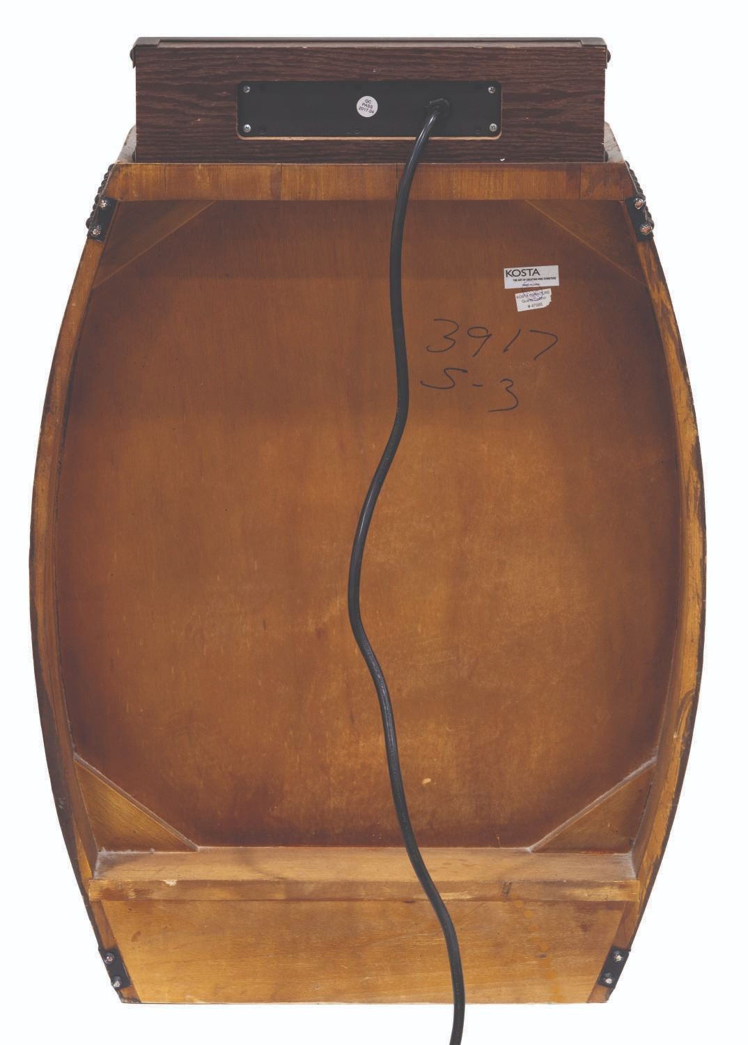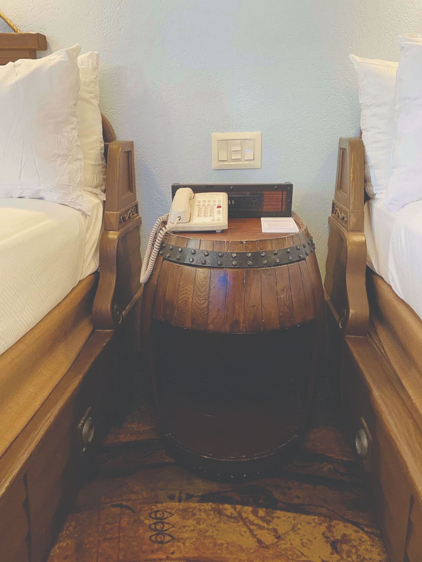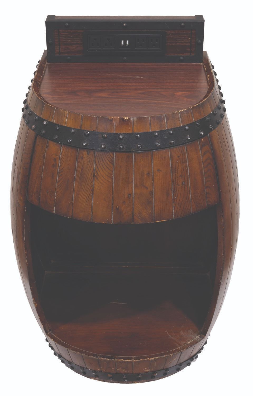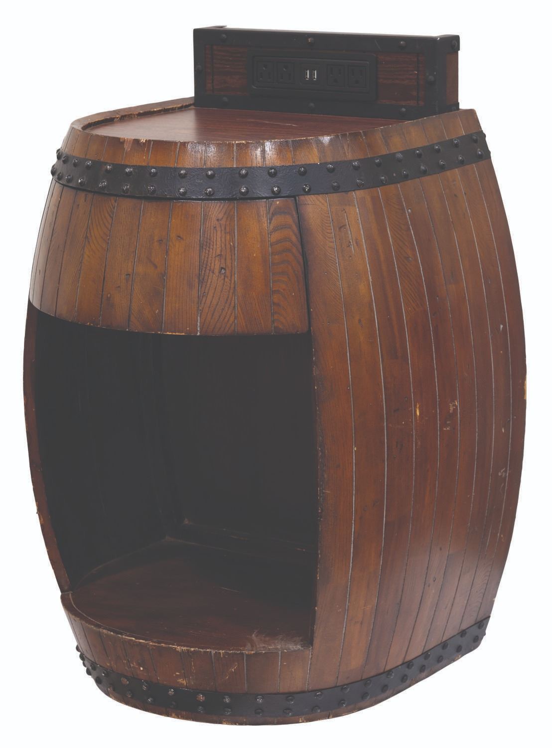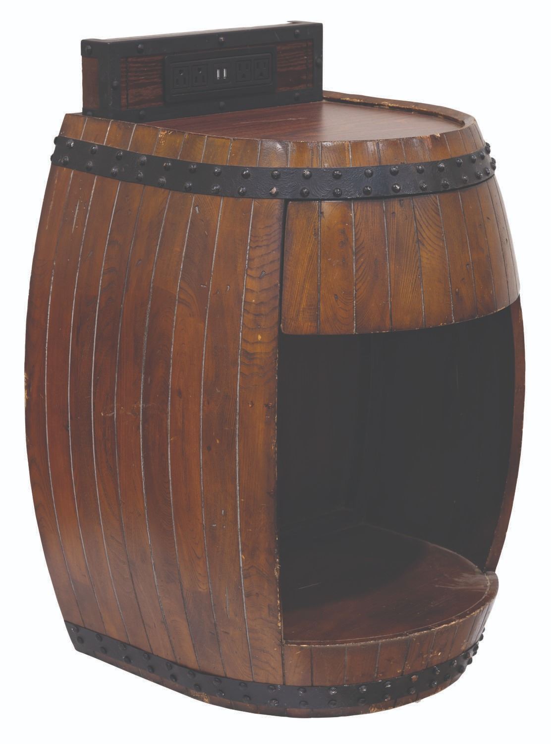 (Disney’s Caribbean Beach Resort, 2009-2022) A barrel-shaped nightstand from the Pirate Rooms at Disney’s Caribbean Beach Resort. The nightstand includes a charging station on top and an open space at the bottom for extra storage. Measuring 18.5” x 22” x 32.5” tall, the nightstand displays in good condition with intentional distress, scuffs, and wear from Resort use. Due to size and weight, this item will require special shipping arrangements. Please inquire before bidding.