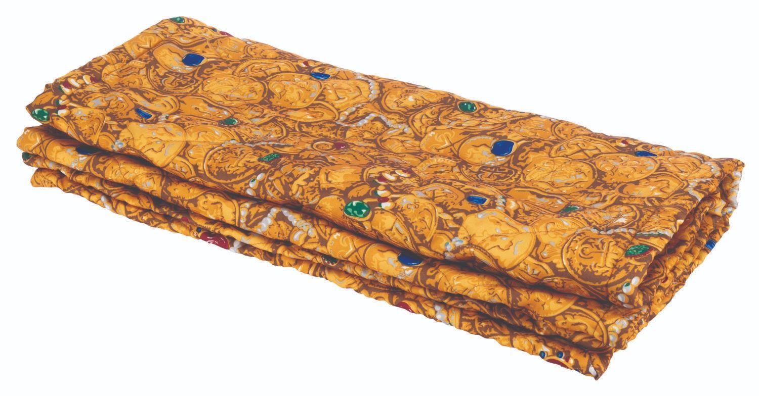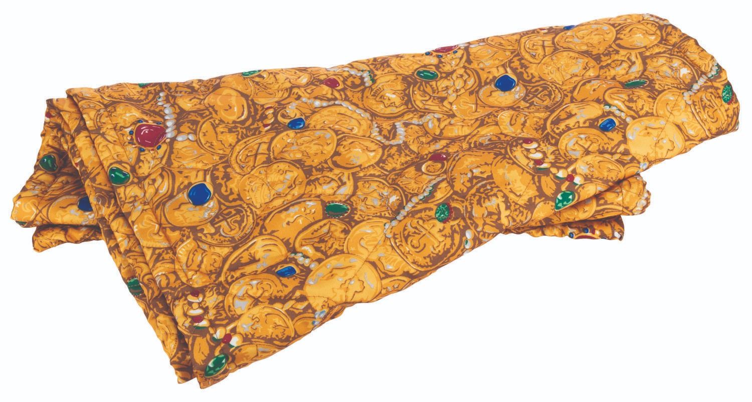 (Disney’s Caribbean Beach Resort, 2009-2022) A bed runner featuring doubloons and jewels from the Pirate Rooms at Disney’s Caribbean Beach Resort. Measuring 21” x 76”, the bed runner is in very good condition with light wear from Resort use.