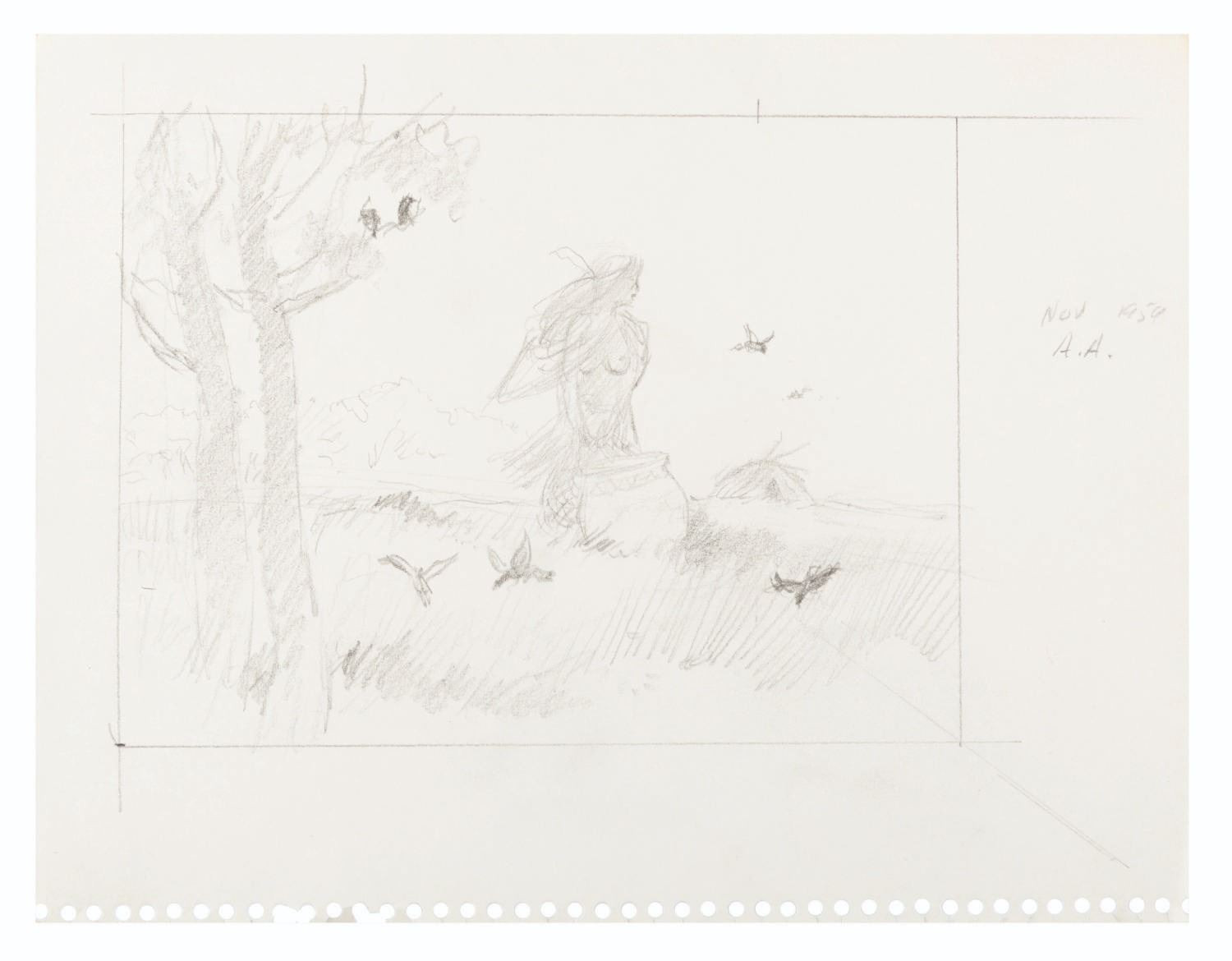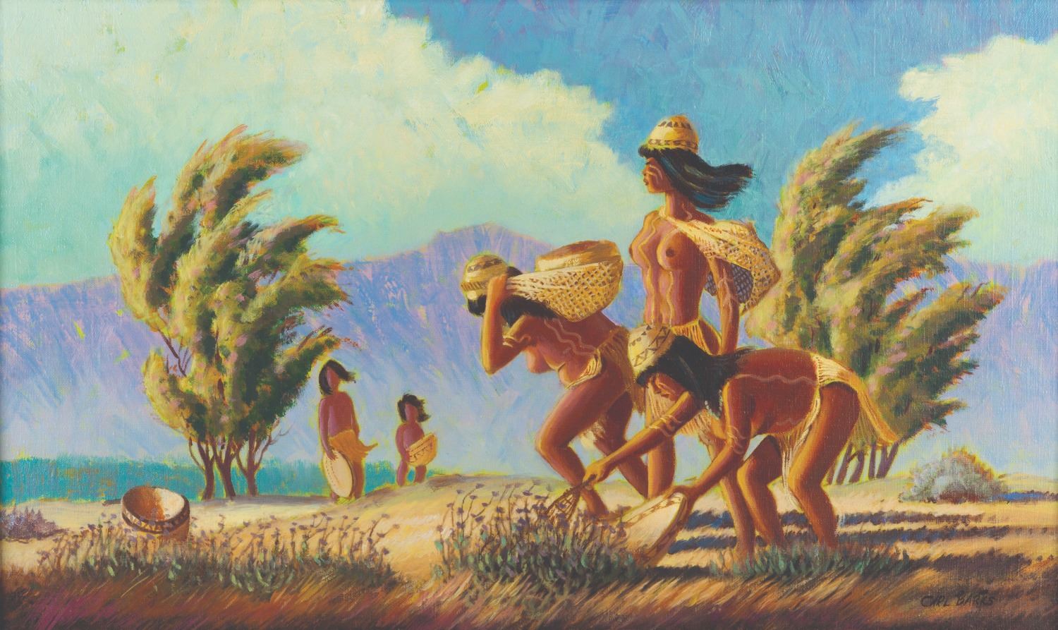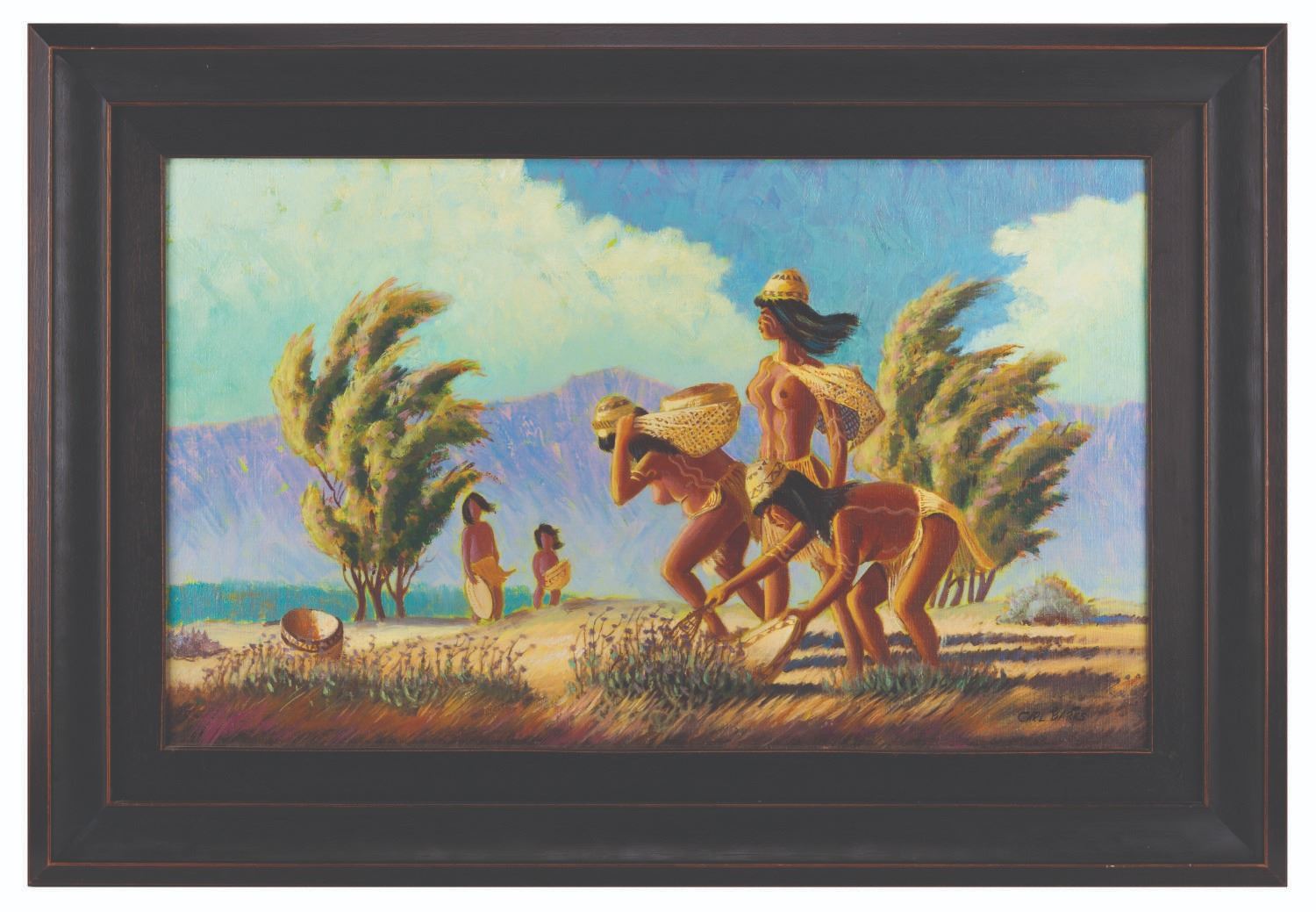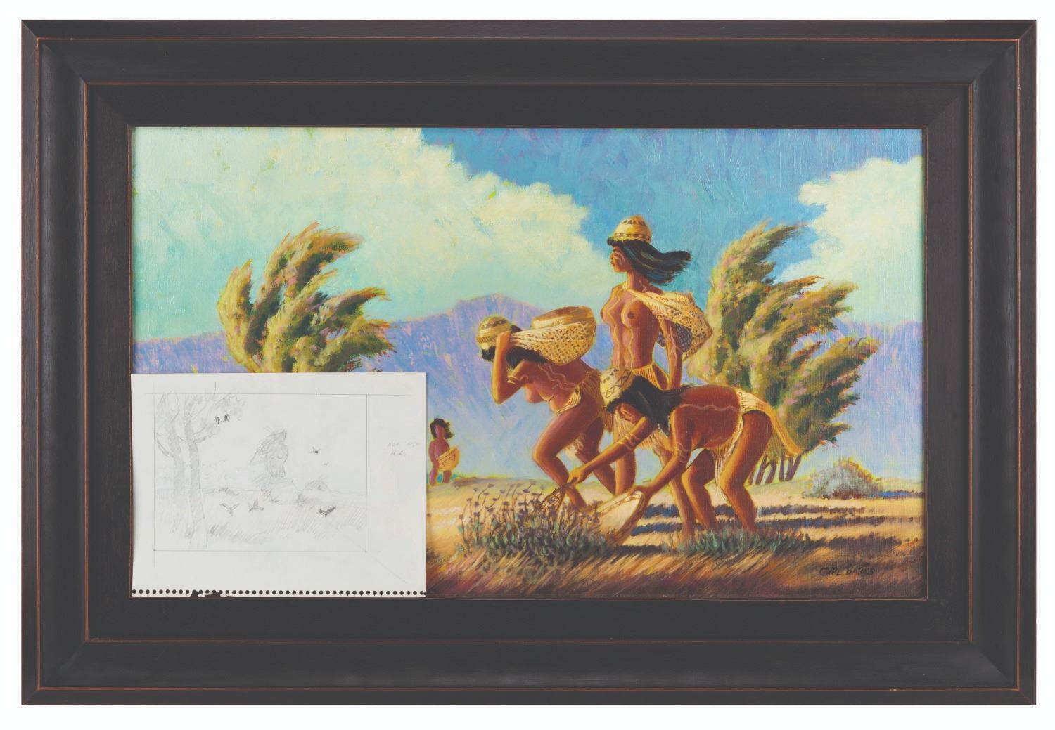 (Barks, 1969) An original oil painting, “Luiseno Seed Gathers,” by Disney Legend Carl Barks. After Barks “officially” retired from writing and drawing comic books in 1966, and before his first painting of Ducks in 1971, he experimented in subjects of his personal interest: modern churches, landscapes, ranch girls, and more. In 1966 he began a series of 11 paintings of early Native American societies that touched on a theme he carried through many of his comic stories, of people and lands “long ago and far away.” The Luiseno are natives of Southern California dating to before the Spanish arrived in the 1700s. Here Barks depicts their gathering of thistle sage seeds in large woven baskets of Luiseno design, on a bright day before the Palomar mountains in the San Jose Valley region. This work is near the culmination of Barks’ studies of native peoples, with only two more such works before moving on to another series. Included in the lot is an early 6” x 8” pencil sketch by Barks studying the theme. Measuring 18” x 30” on a 20” x 30” canvas in a 26” x 38” wooden frame, the piece is signed by Barks in the lower right and in fine condition, with very slight wear to the frame from display. In 1935, Carl Barks first found work at the Walt Disney Studio as an animation inbetweener. He worked his way onto the Donald Duck story team, then in 1942 left the Studio but still submitted art and stories for Donald Duck comics to Western Publishing. It was here he found his true calling, writing and drawing adventures for Donald Duck and his nephews, and creating Scrooge McDuck, Magica De Spell, and the entire world of Duckburg. Barks continued writing and drawing the duck’s adventures long into his reported retirement, and after a few years exploring personal interests in paintings, found great success selling paintings of the world of Duckburg he had created.