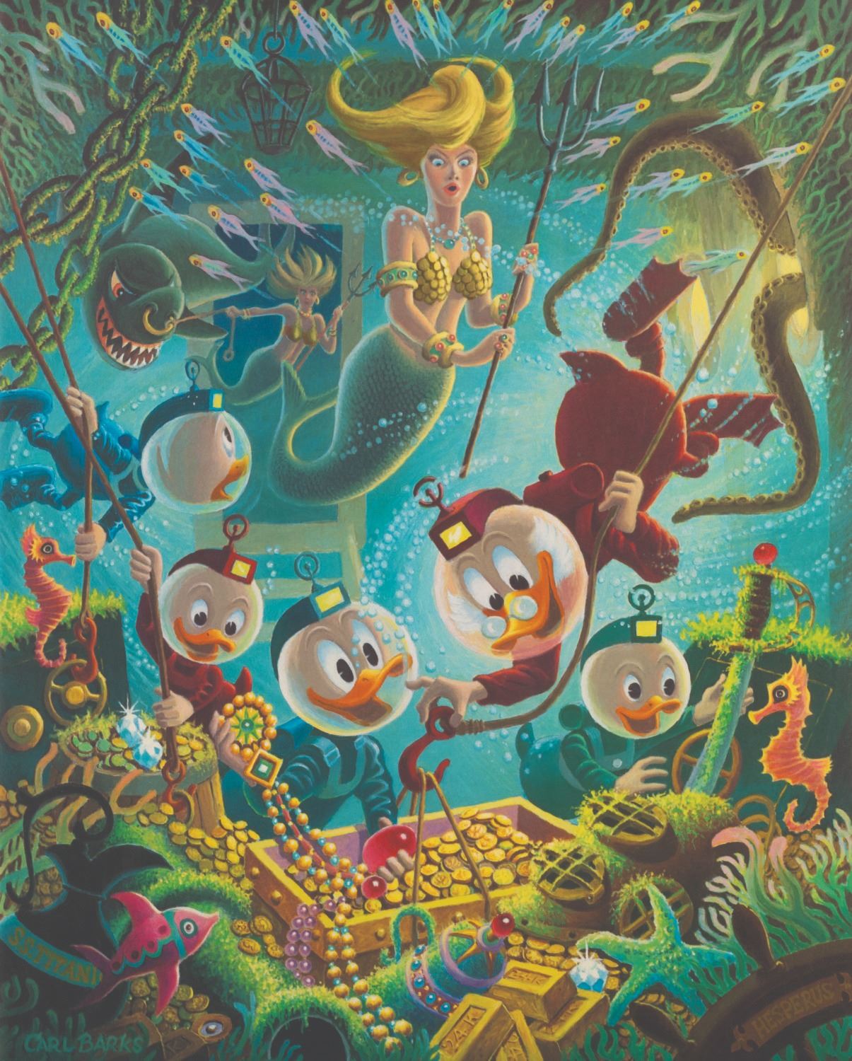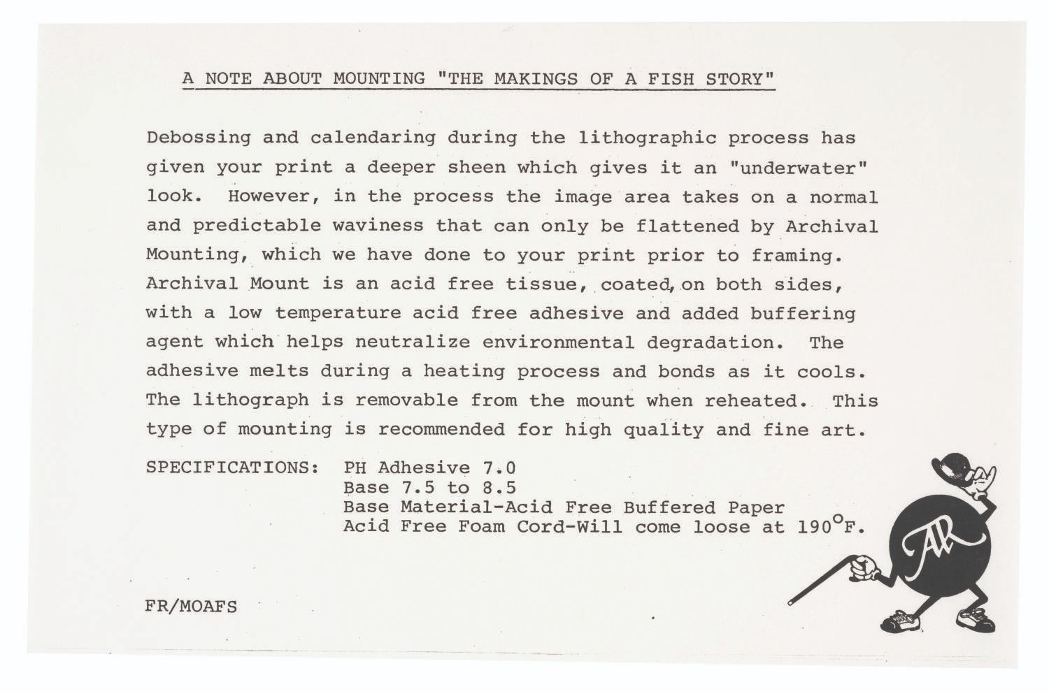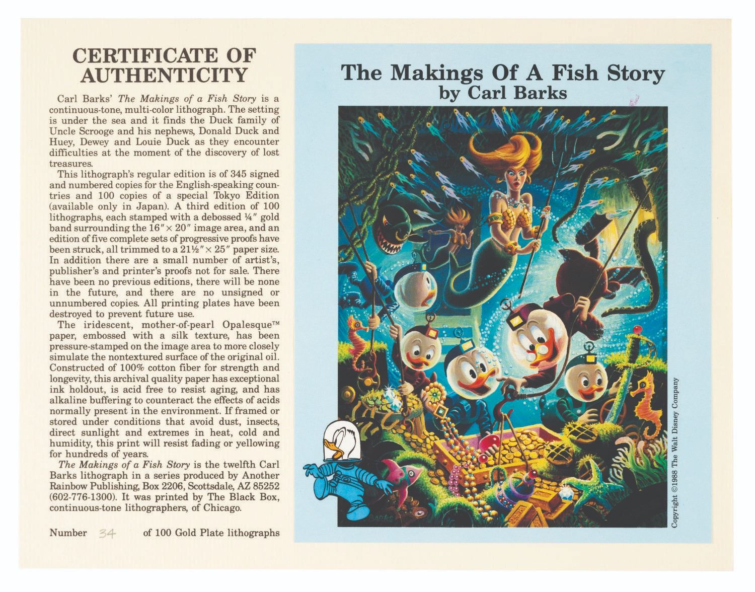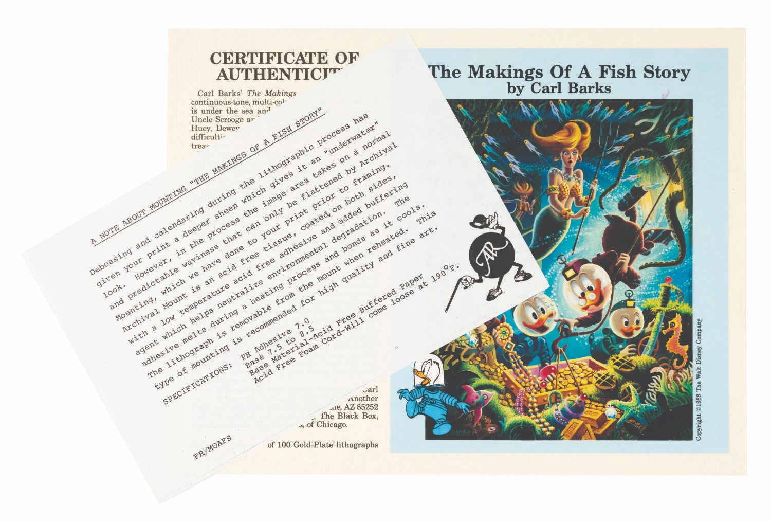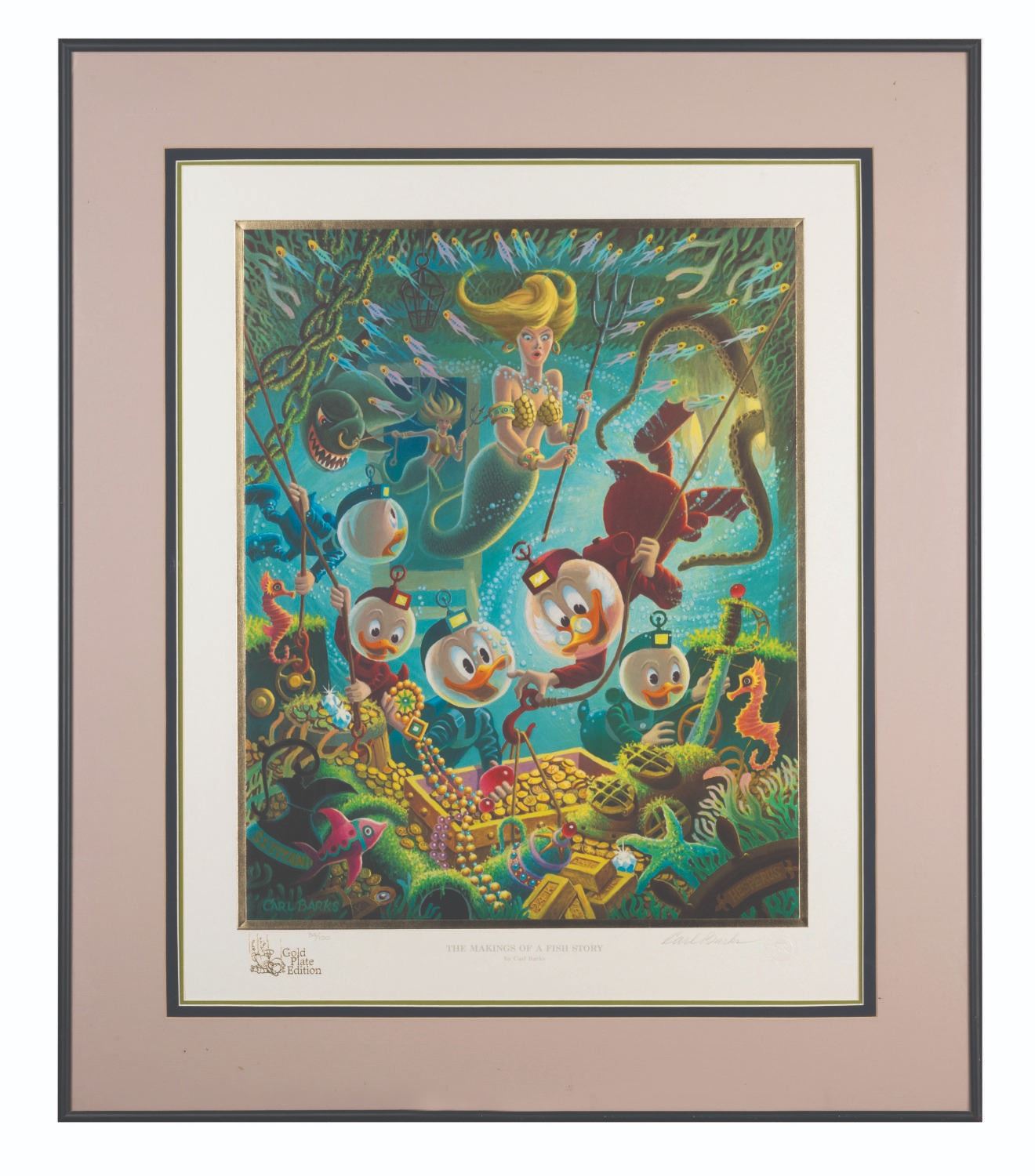 A “The Makings of a Fish Story” lithograph signed by Disney Legend Carl Barks. Artist and writer Barks is best remembered for creating Uncle Scrooge, Donald’s nephews, and all of Duckburg in his now-classic comic book stories. This Gold Plate edition of the lithograph is hand-numbered 34/100 and signed by Barks. With an image size of 16” x 20” in a 26.75” x 31.25” triple-matted frame the piece is in fine condition, with the frame and matte in good condition with scratches, scuffs, stains, and wear. Due to size and weight, this item requires special shipping arrangements. Please inquire before bidding. In 1935, Carl Barks first found work at the Walt Disney Studio as an animation inbetweener. He worked his way onto the Donald Duck story team, then in 1942 left the Studio but still submitted art and stories for Donald Duck comics to Western Publishing. It was here he found his true calling, writing and drawing adventures for Donald Duck and his nephews, and creating Scrooge McDuck, Magica De Spell, and the entire world of Duckburg. Barks continued writing and drawing the duck’s adventures long into his reported retirement, and after a few years exploring personal interests in paintings, found great success selling paintings of the world of Duckburg he had created.