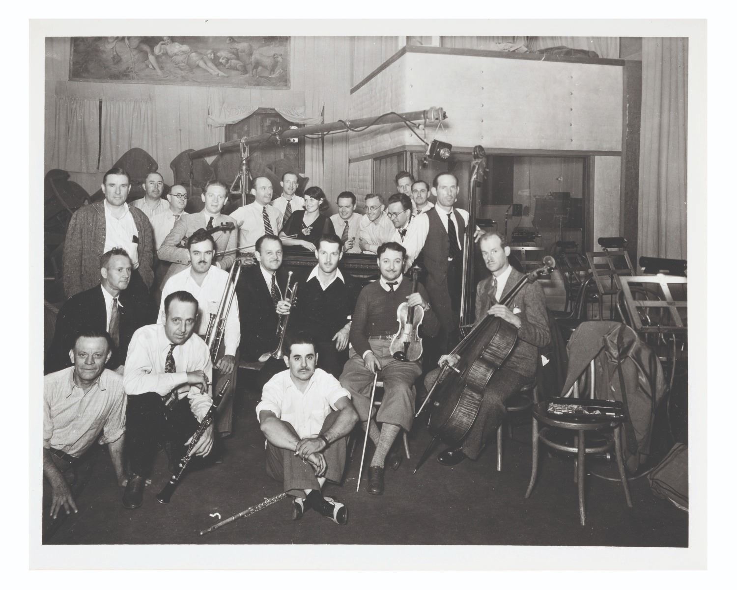 (Disney, 1931-34) A very rare publicity photo of Carl Stalling and musicians on the soundstage at Disney’s Hyperion Avenue Studio. Also present is Marcellite Garner, who was the voice of Minnie Mouse throughout the 1930s. The photo measures 10” x 12” with an image size of 7.5” x 9.5” and is in very good condition, with slight adhesive staining typical of film tape of this age.