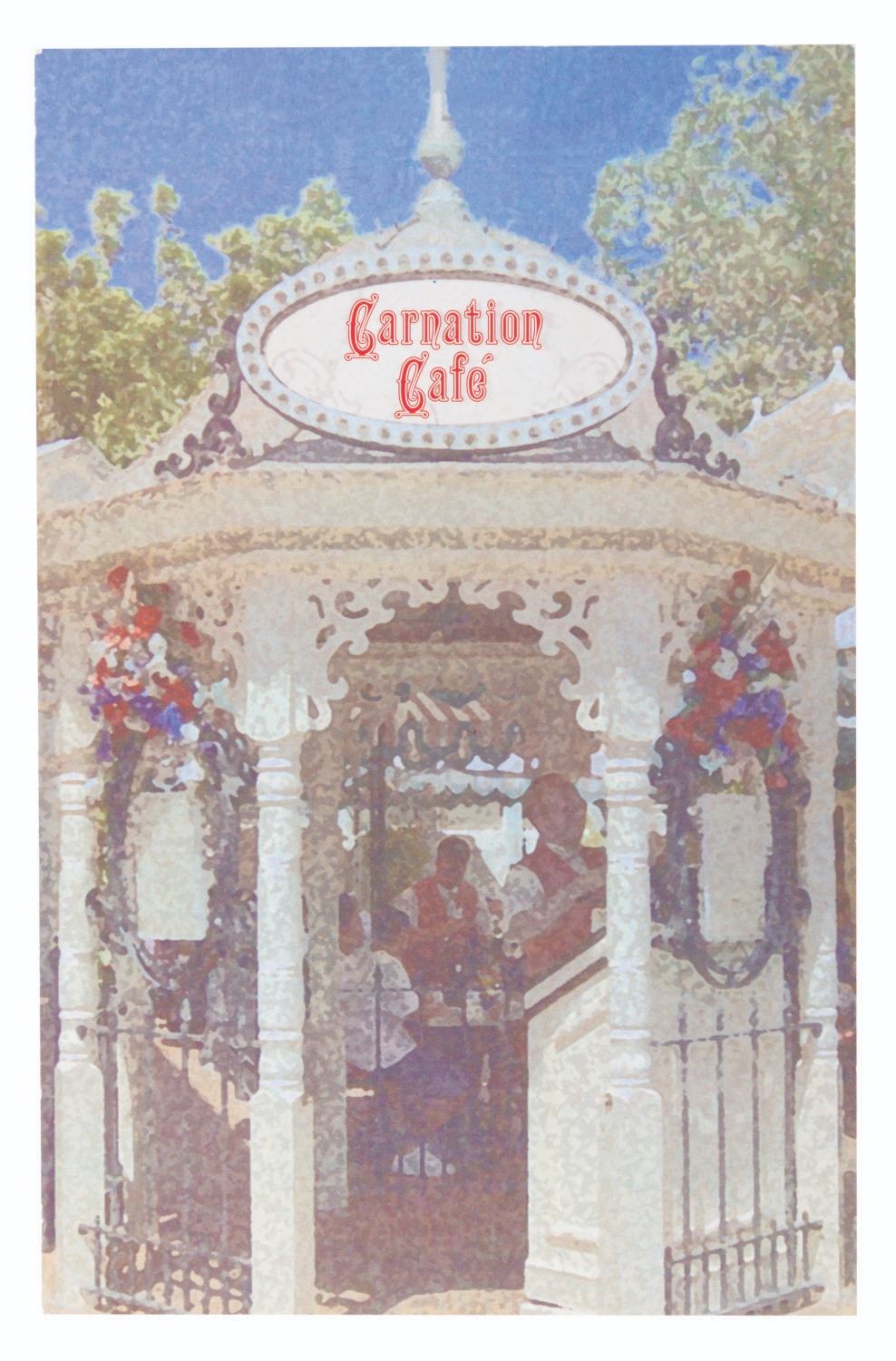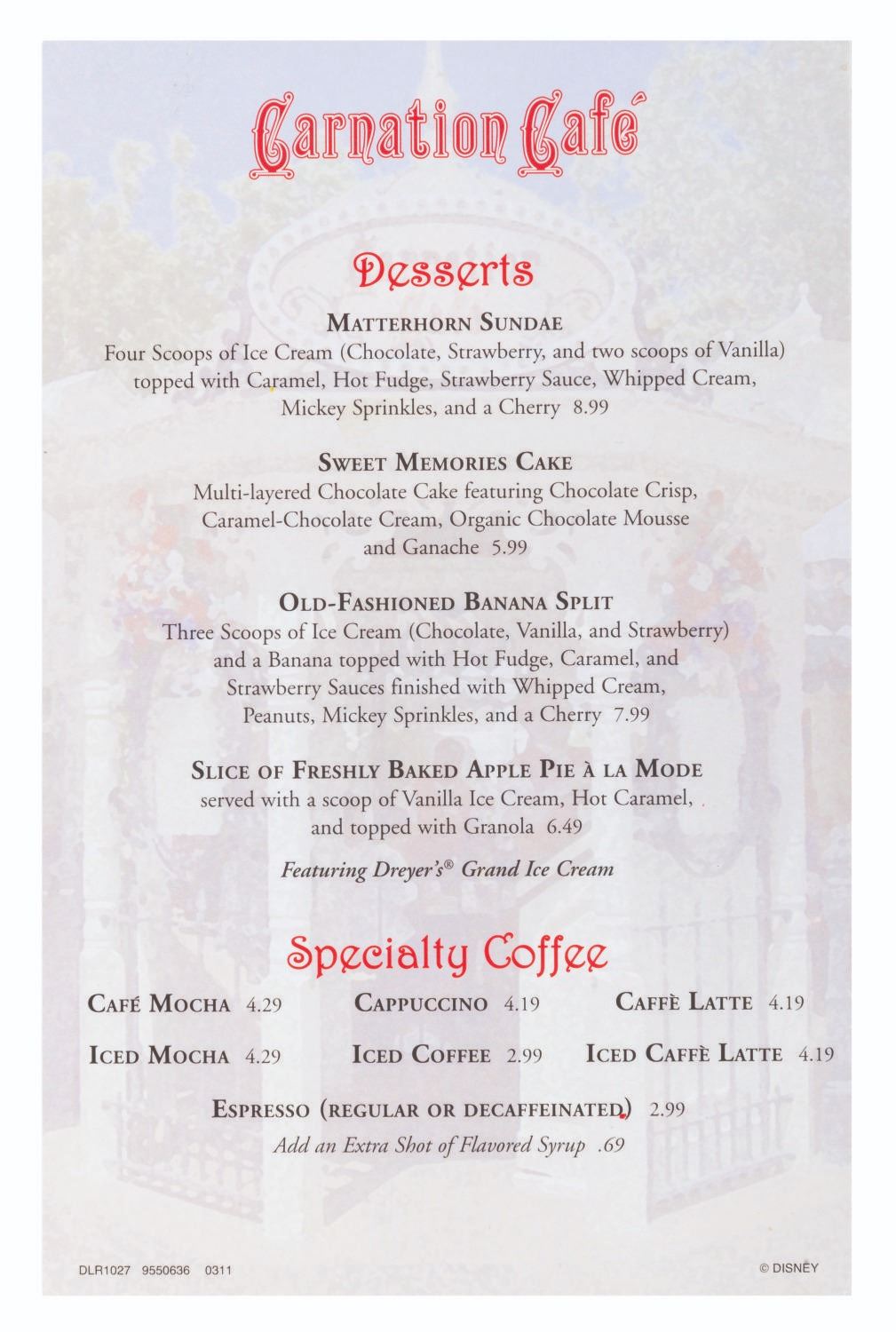 (Disneyland, 1990s) A dessert menu from the Carnation Café on Disneyland’s Main Street, U.S.A. Measuring 8.5” x 5.5”, the menu is in very good condition with handling wear to the edges and light residue to the upper left edge on the back side.