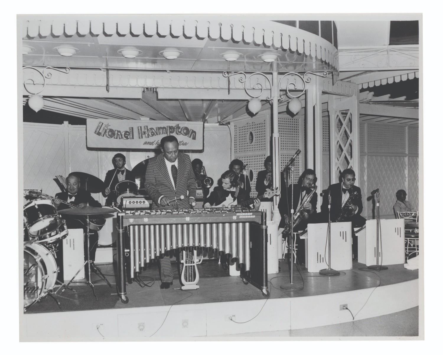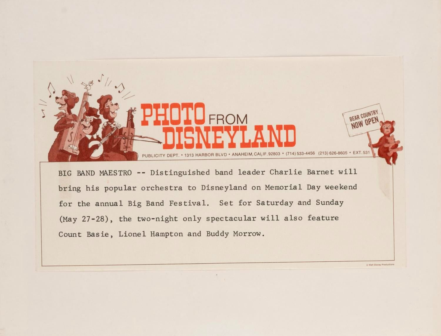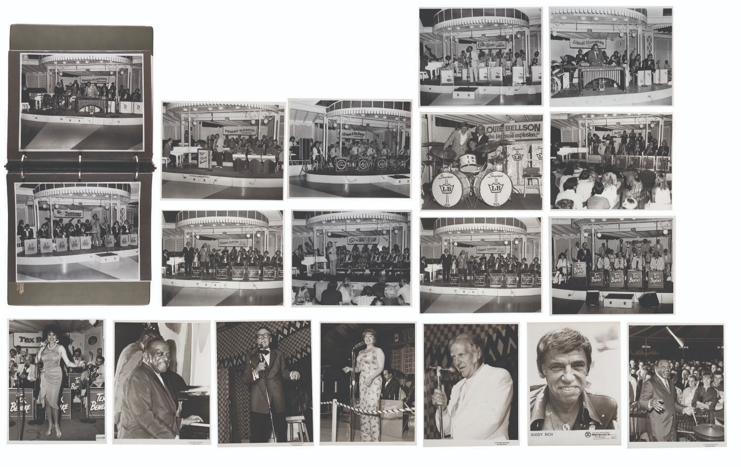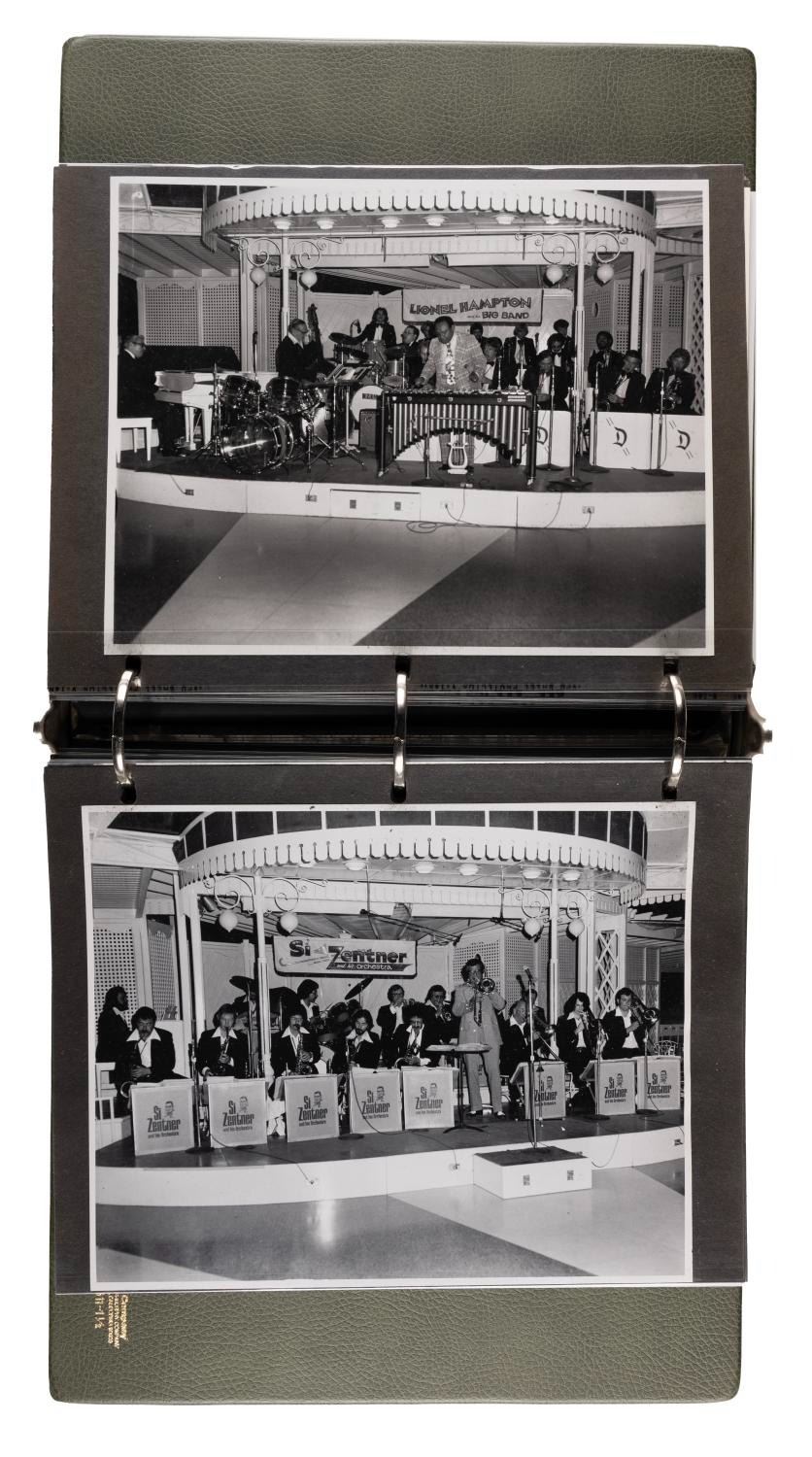 (Disneyland, 1970s-80s) A large collection of 55 press photos promoting the entertainment at Carnation Plaza Gardens in Disneyland. Included are headshots and Disneyland images of jazz musicians and Big Band leaders Count Basie, Lionel Hampton, Tex Beneke, Bob Crosby, Les Brown, and more. The collection is presented within a 10.5"x11.75"x2" three-ring binder. Measuring 8"x9.75" to 7.75"x10", each photo print is in good-to-very good condition exhibiting light wear from handling and age.