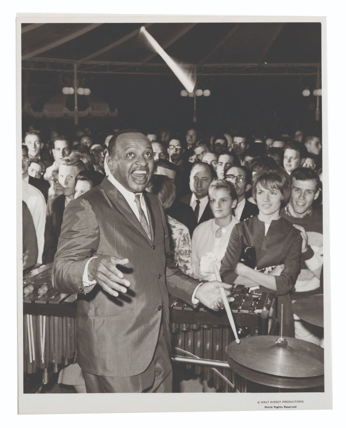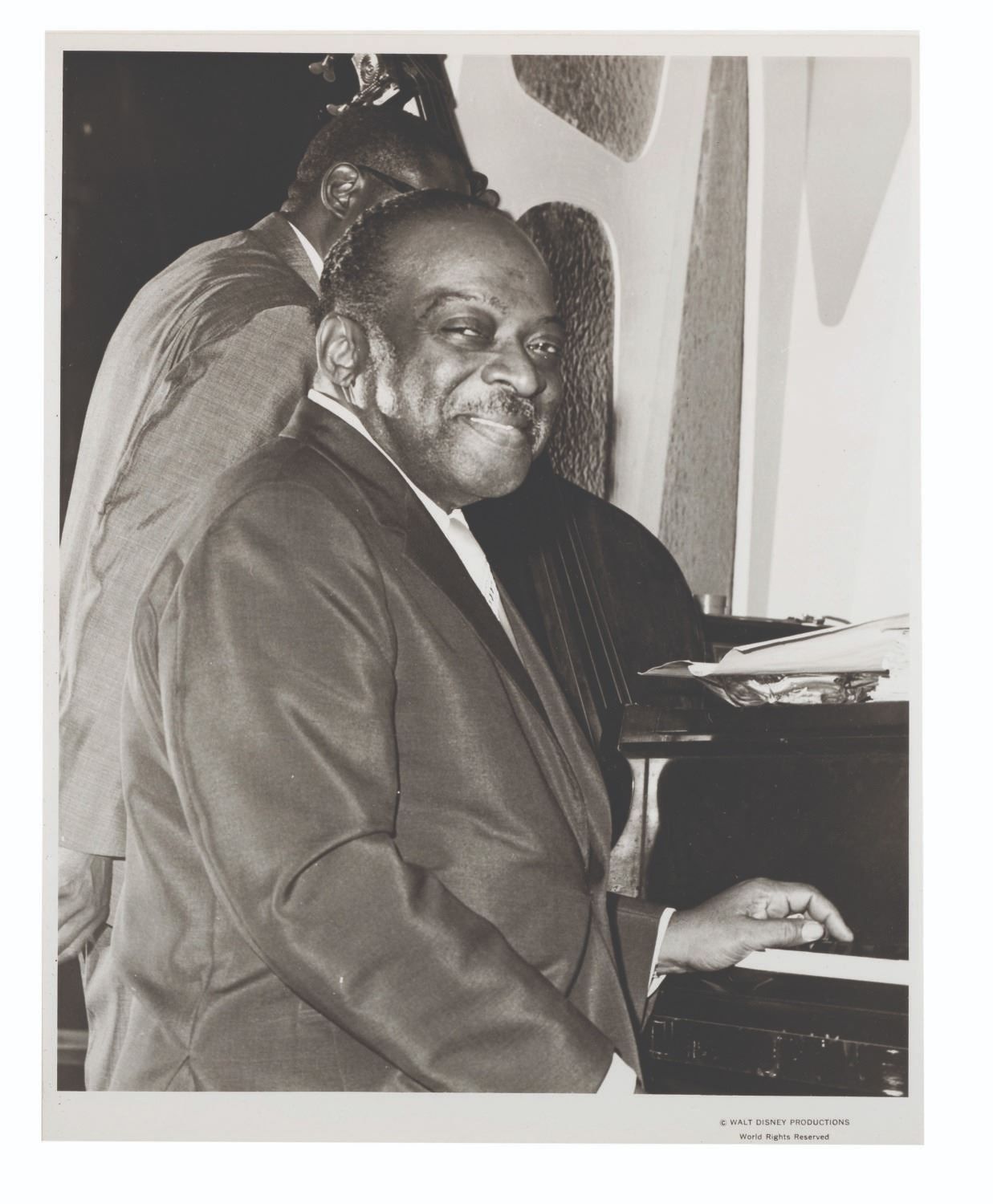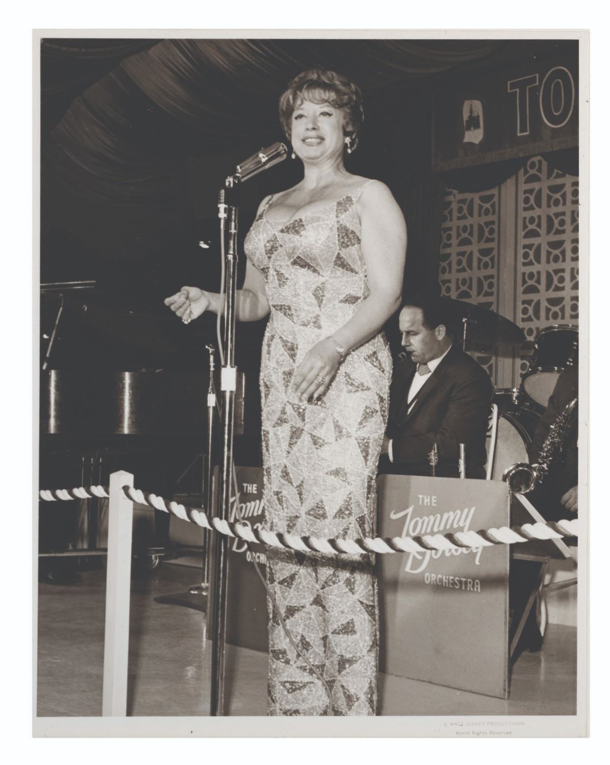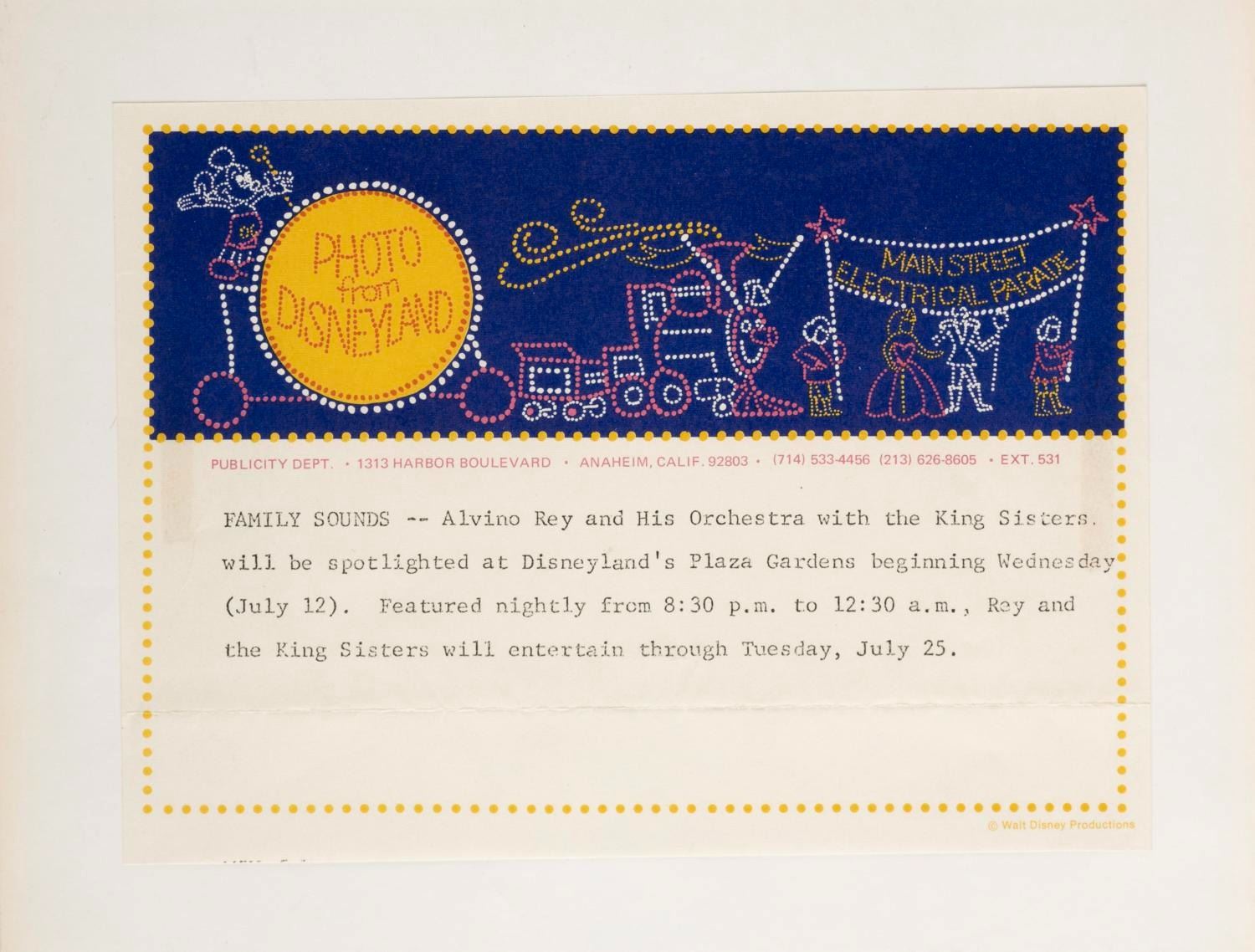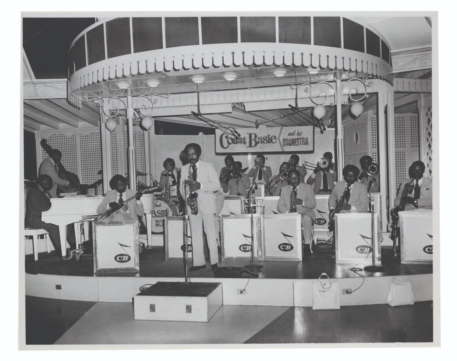 (Disneyland, 1970s-80s) A large collection of 55 press photos promoting the entertainment at Carnation Plaza Gardens in Disneyland. Included are headshots and Disneyland images of jazz musicians and Big Band leaders Count Basie, Lionel Hampton, Tex Beneke, Bob Crosby, Les Brown, and more. The collection is presented within a 10.5"x11.75"x2" three-ring binder. Measuring 8"x9.75" to 7.75"x10", each photo print is in good-to-very good condition exhibiting light wear from handling and age.
